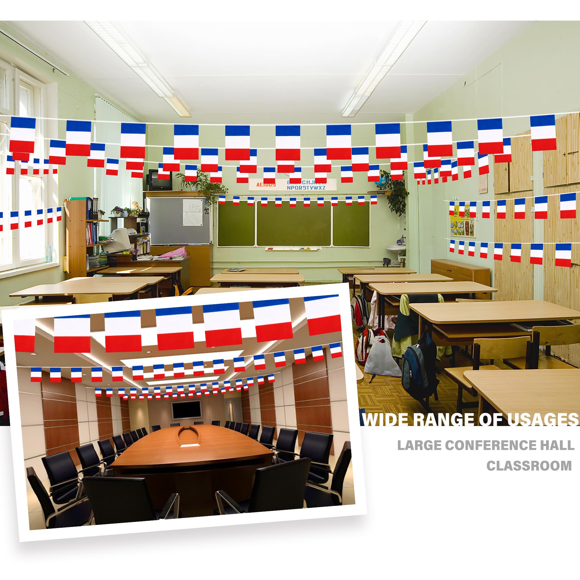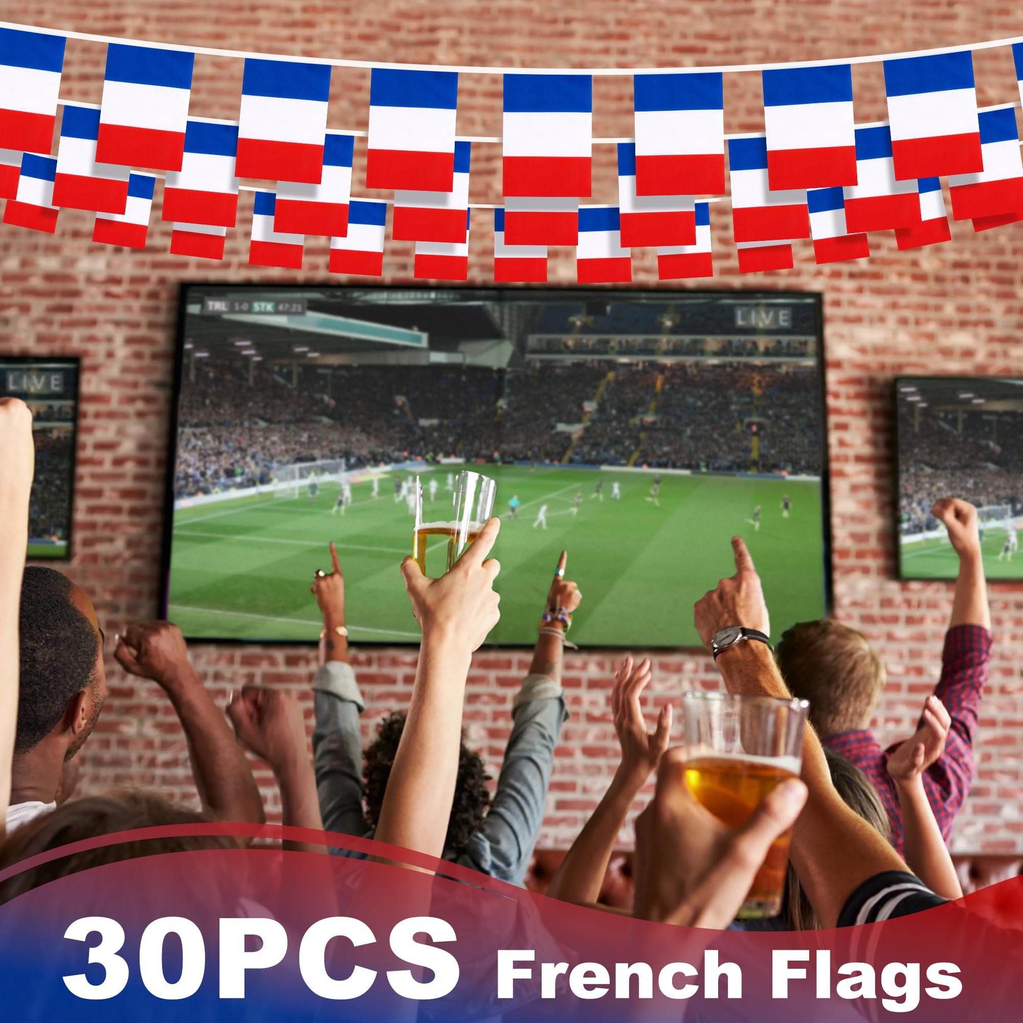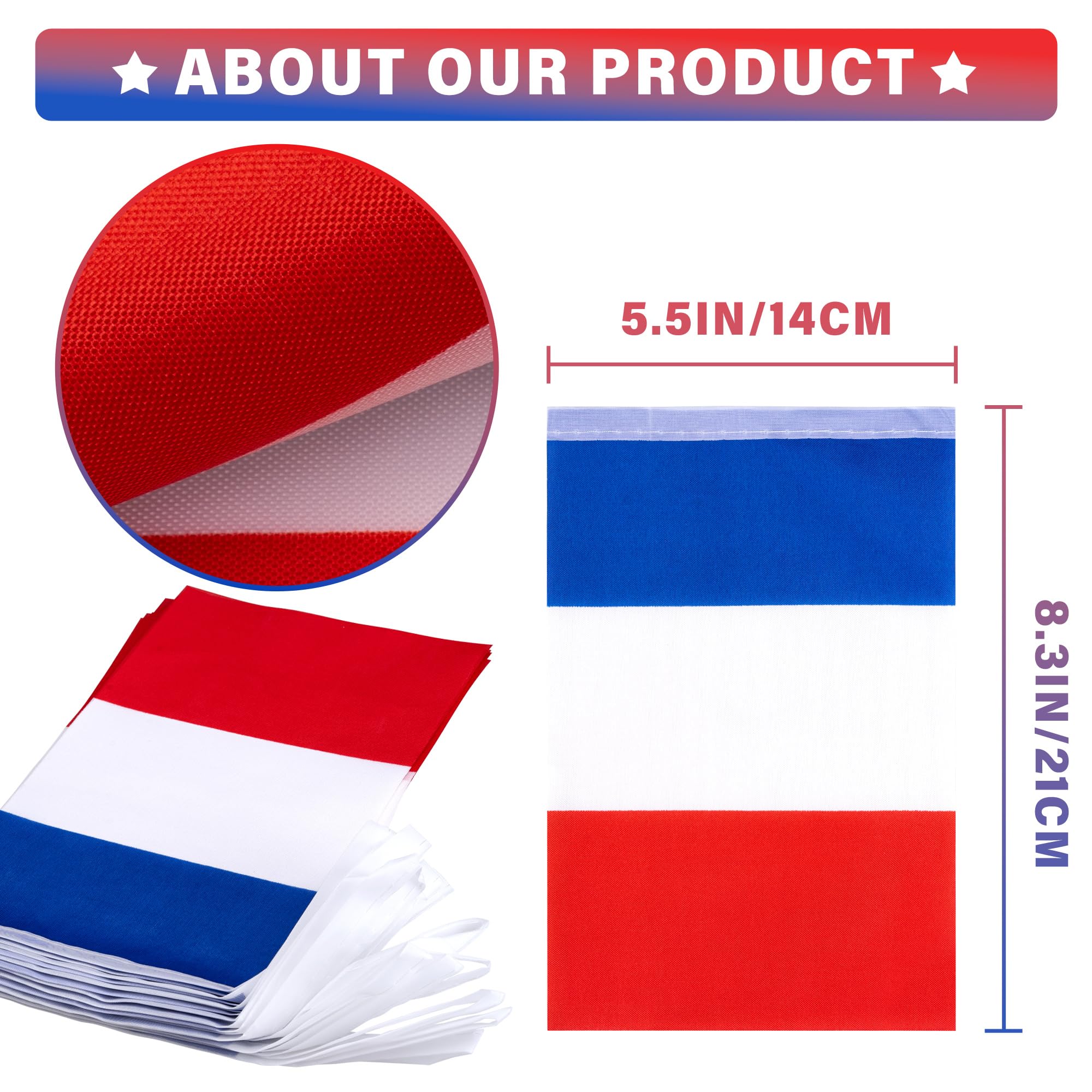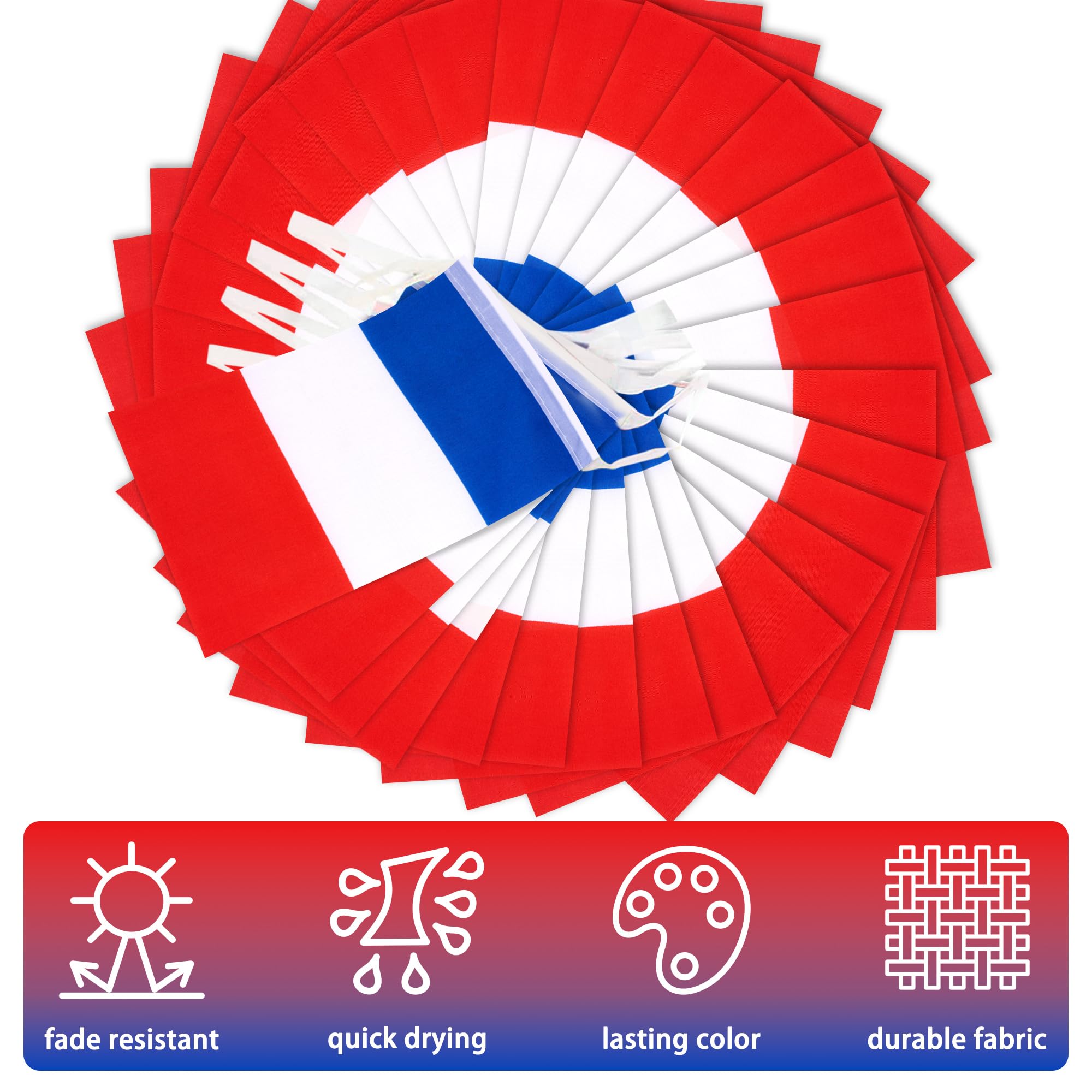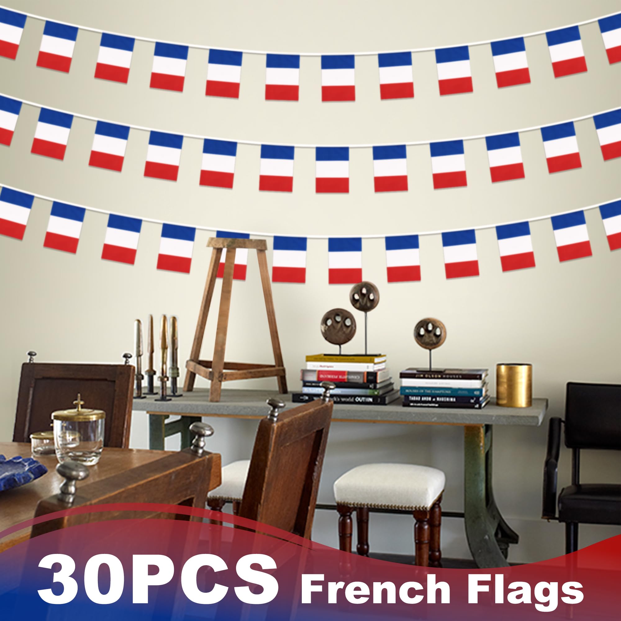 【Specifications】Each string is approximately 33 feet long. Includes 30 pcs French flags. Each flag is approximately 5.5 in wide and 8.2 in long.
