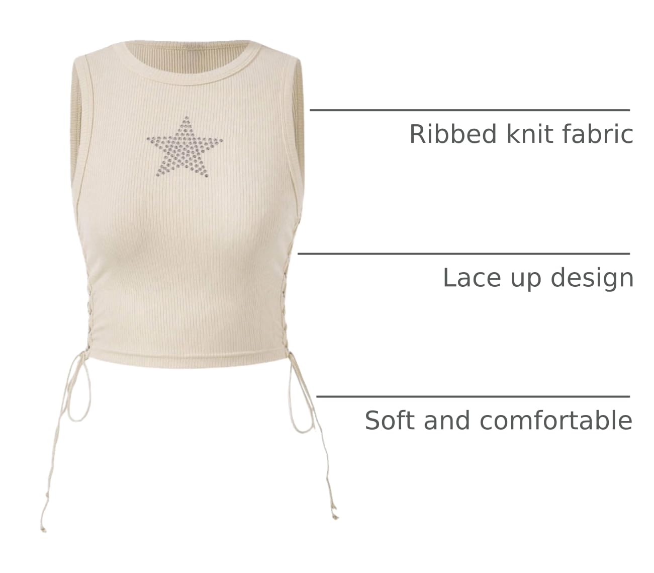 Feature: Star pattern, lace up, rhinestone, crewneck, slim fit, ribbed knit, concert outfits, vest tops for women, easy to pair with jeans, pants, shorts, etc