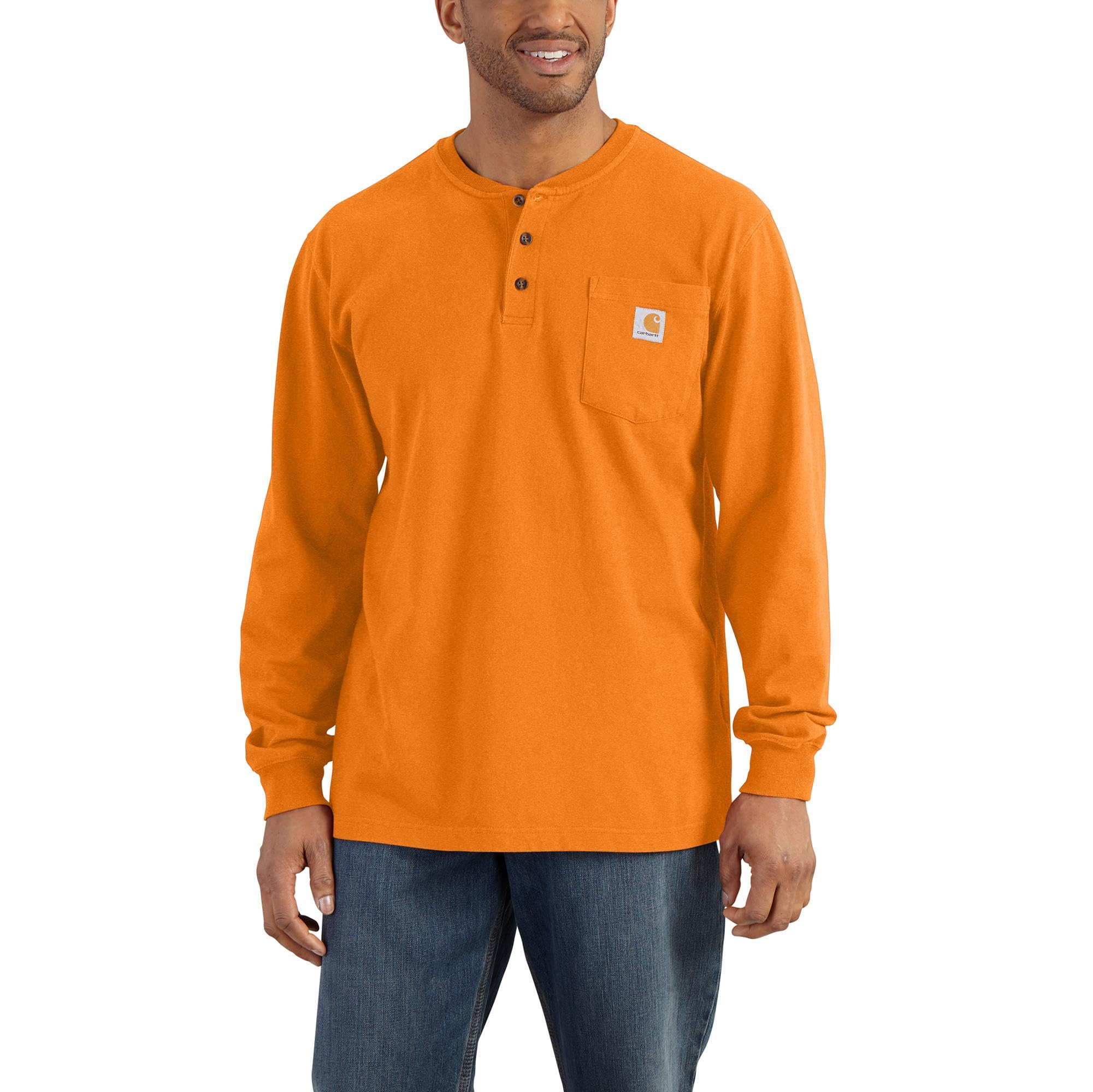 Description Carhartt's long sleeve work wear henley is an all-purpose work shirt that is perfect for cooler days or as a layering piece Made of 675-ounce, 100-percent cotton jersey, it features a rib-knit collar with a three-button closure and a left chest pocket It also has side-seamed construction to minimize twisting and maximize comfort ash fiber content is 99-percent , 1-percent polyester Heather gray fiber content is 90-percent cotton , 10-percent polyester