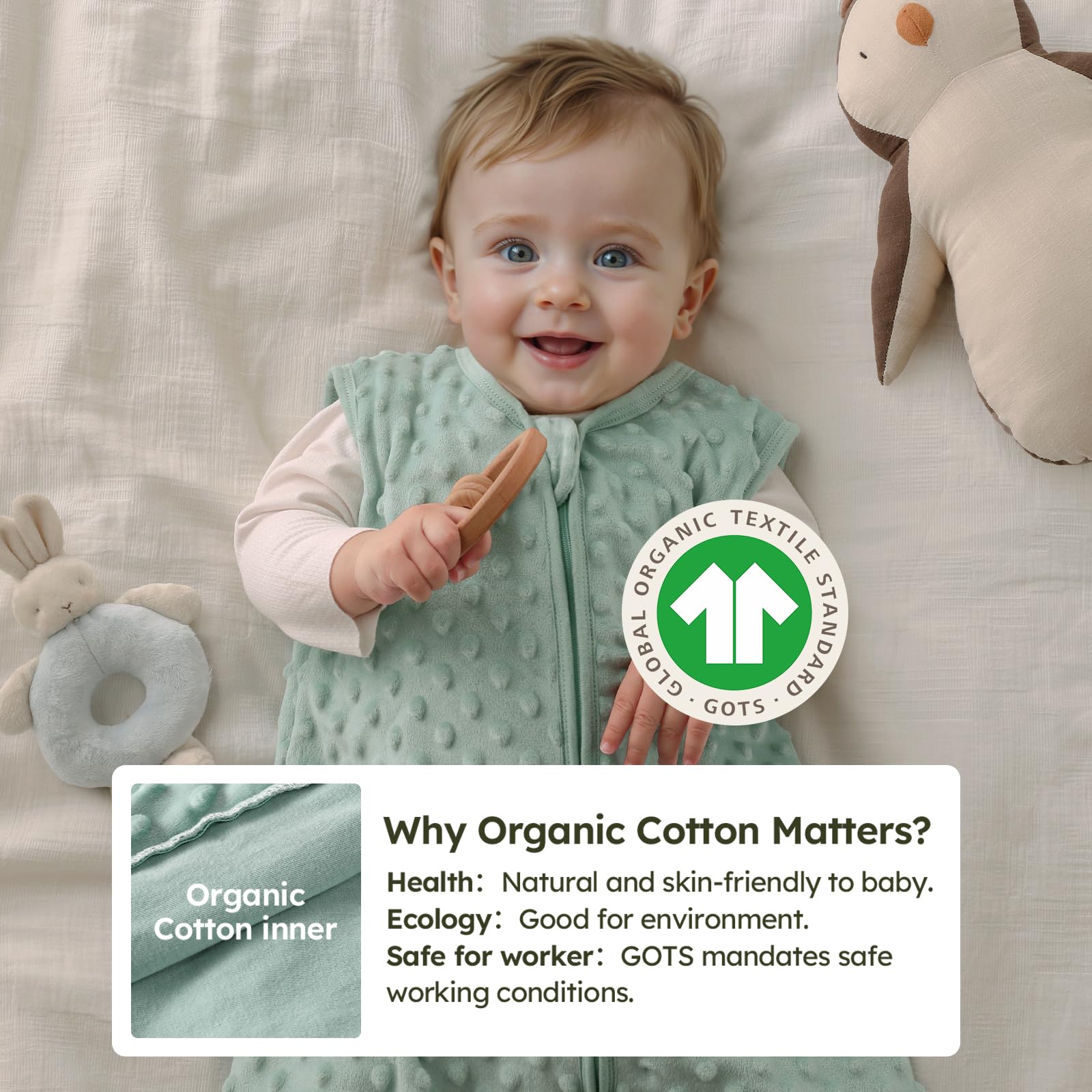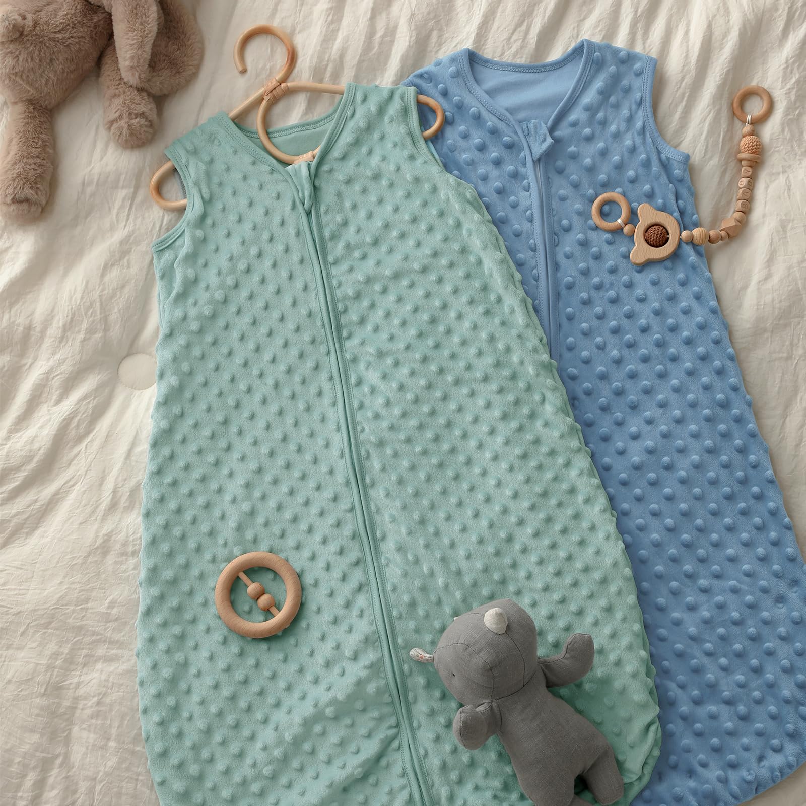 Healthy development - It's plush heart dots surface helps baby fall back to sleep quickly, transform the sleep sacks into an invaluable ally for moms, aiding in lulling their precious ones to sleep while fostering infants'cognitive development. Our baby sleeping sack provides ample room for kicking freely, ensuring your baby stays comfortable throughout the night while promoting healthy hip development.