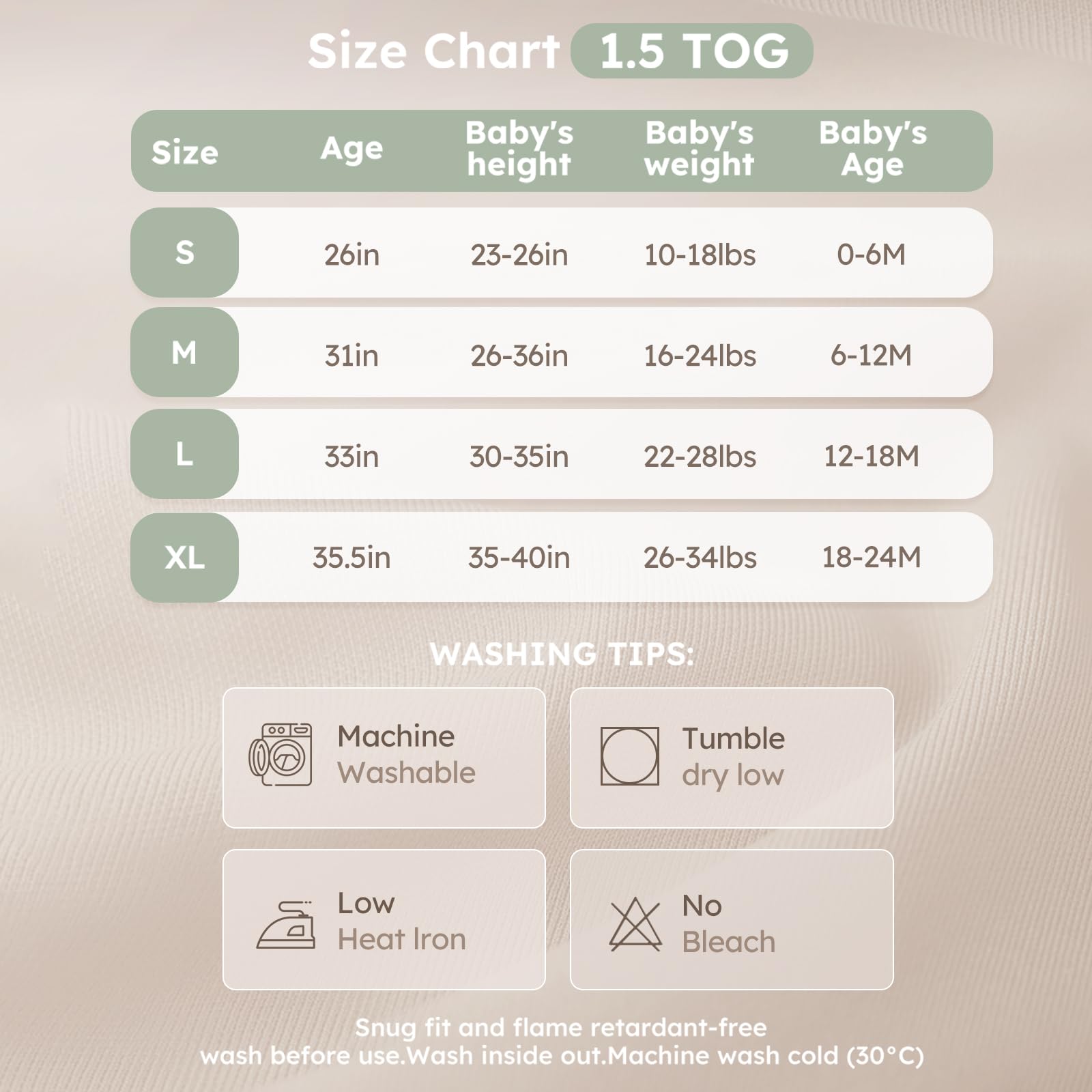 Machine Washable - The baby wearable blanket come with 2 pack, convenient for the baby to change at any time. There are 4 sizes available sleep sack for your choices: S for 0-6 Months; M for 6-12 Months; L for 12-18 Months; XL for 18-24 Months. Please measure your baby's height and weight and refer to our size chart carefully before choosing. These baby sleep sacks are machine washable, tumble dry at low temperatures(<30°C/ 86°F).