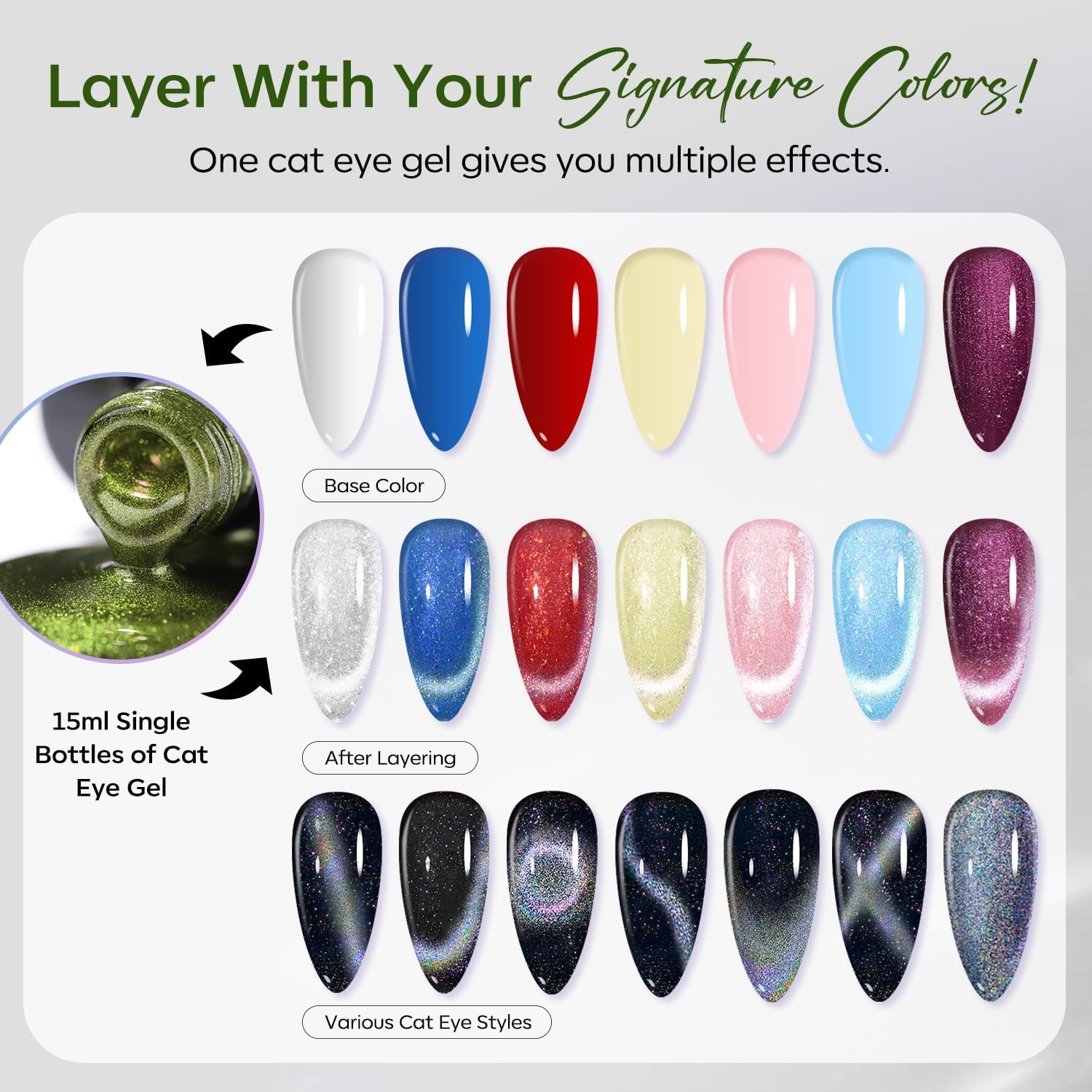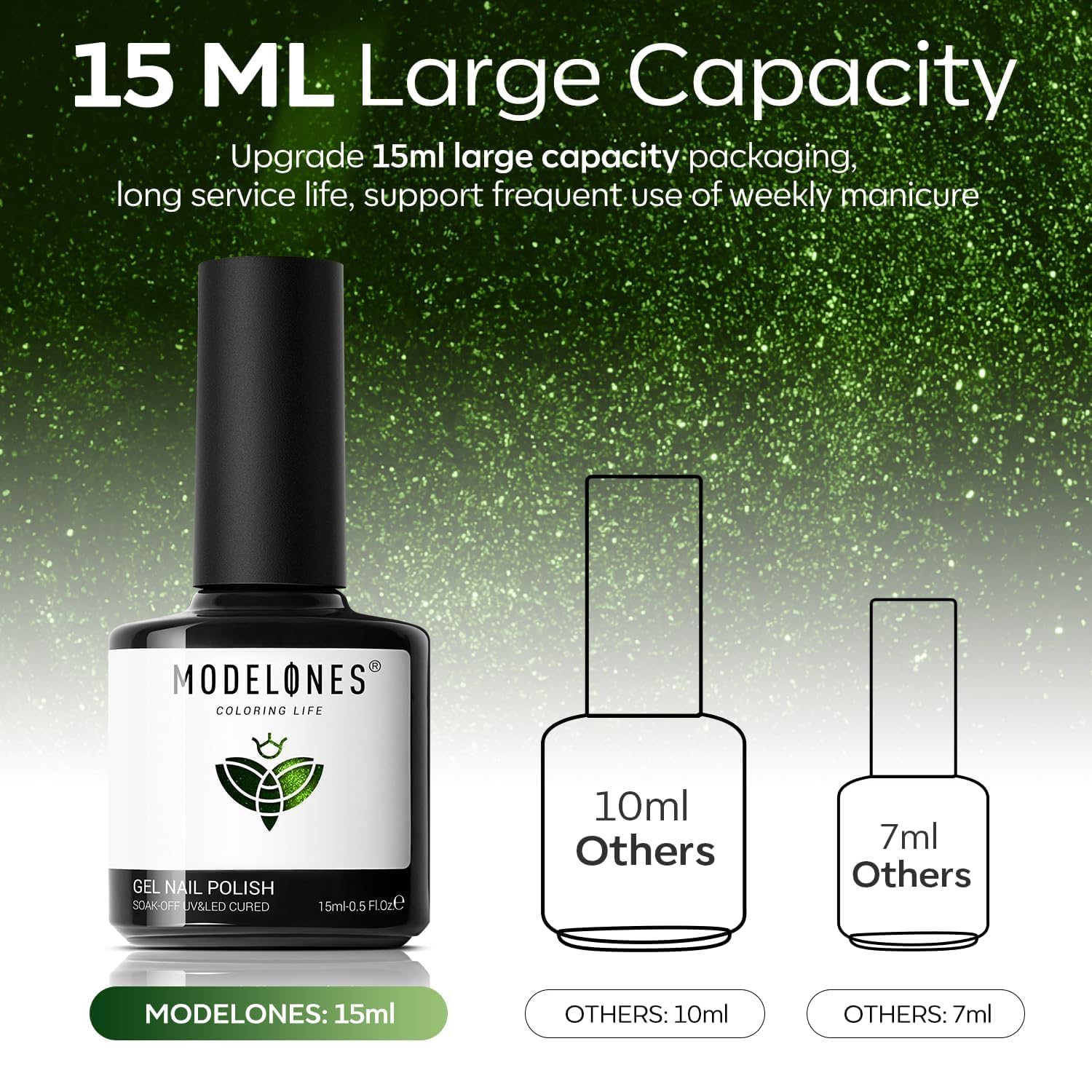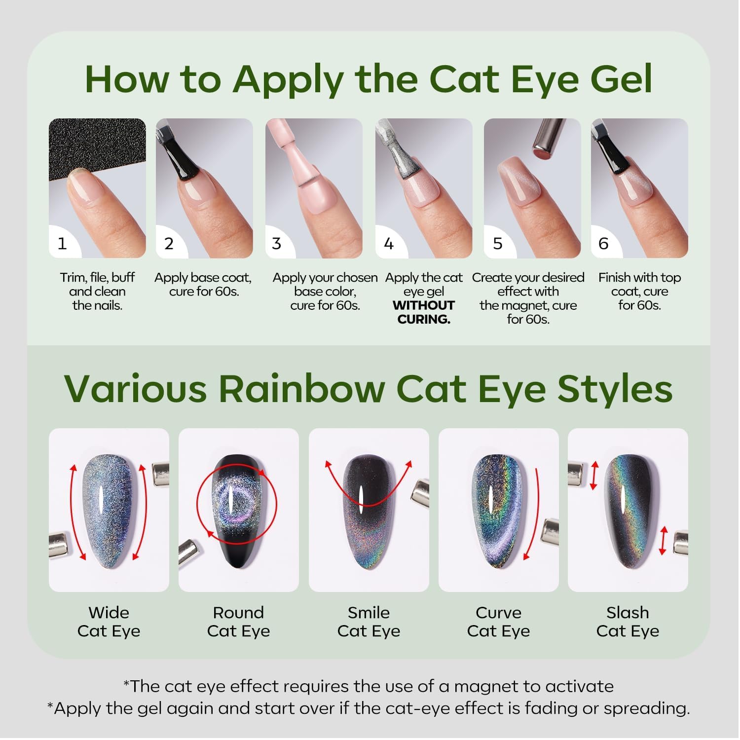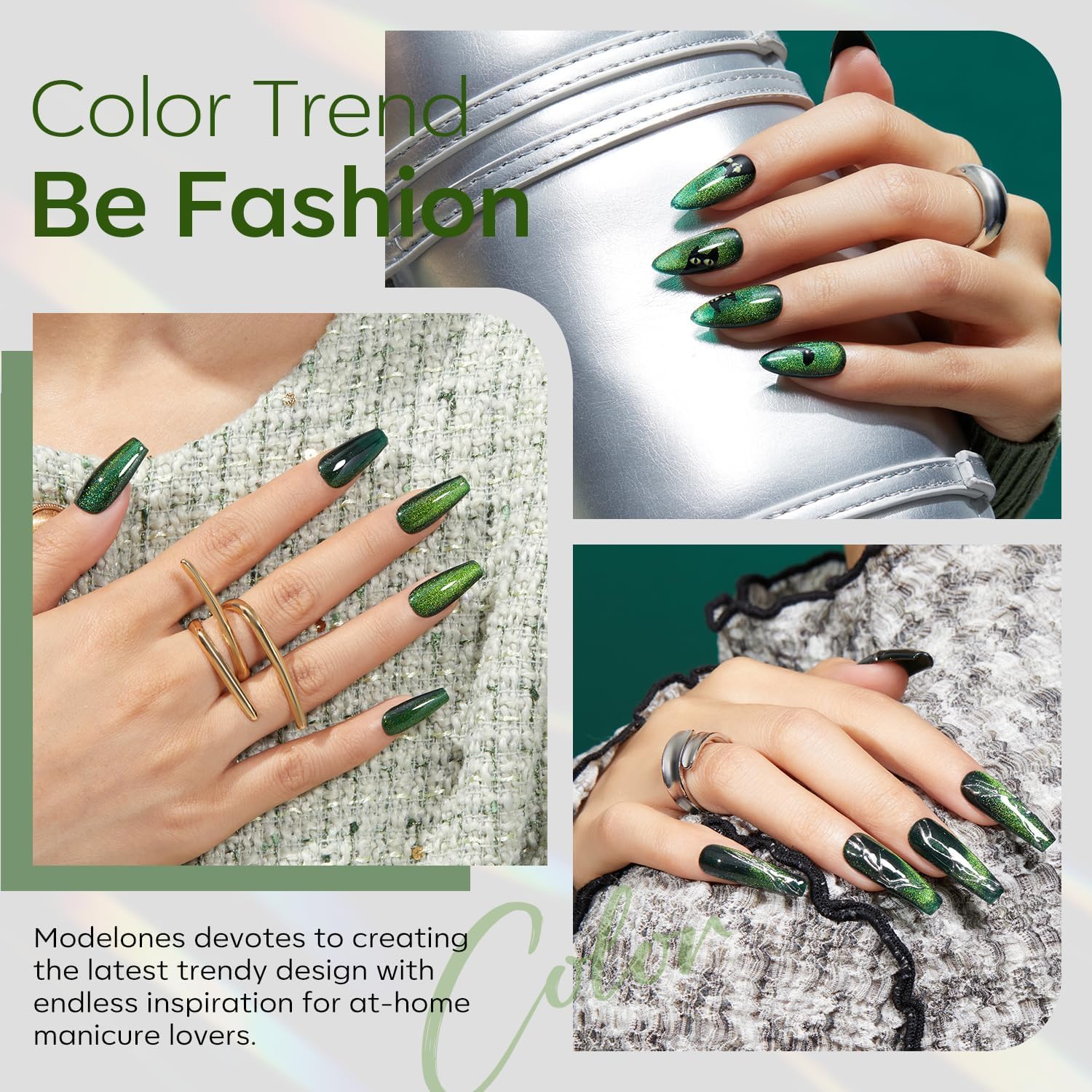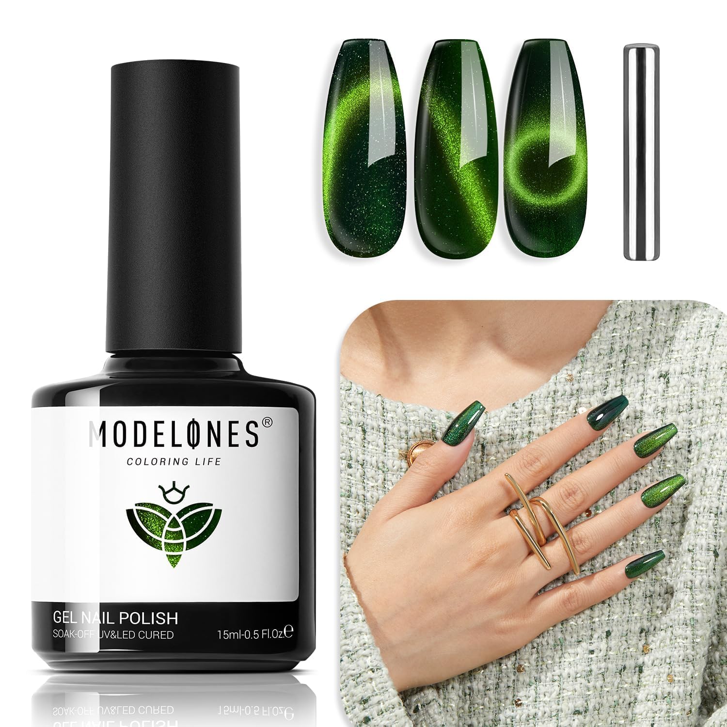 Tips: Hold the magnetic stick 3-5mm above the surface for 5-10 seconds to achieve your desired effect! [ What You Get]: 15ML Green Color of Semi-transparent Holographic Glitter Cat Eye Gel Nail Polish (15 ml/ 0.5 fl. oz each) + 1 Double-Head Magnetic Stick for various cat eye designs. Each shade of Modelones 9D cat eye gel polish is expertly mixed with metallic magnetic glitter powders for a stunning, shiny finish. Different angles create different visual effects. Practice makes perfect!