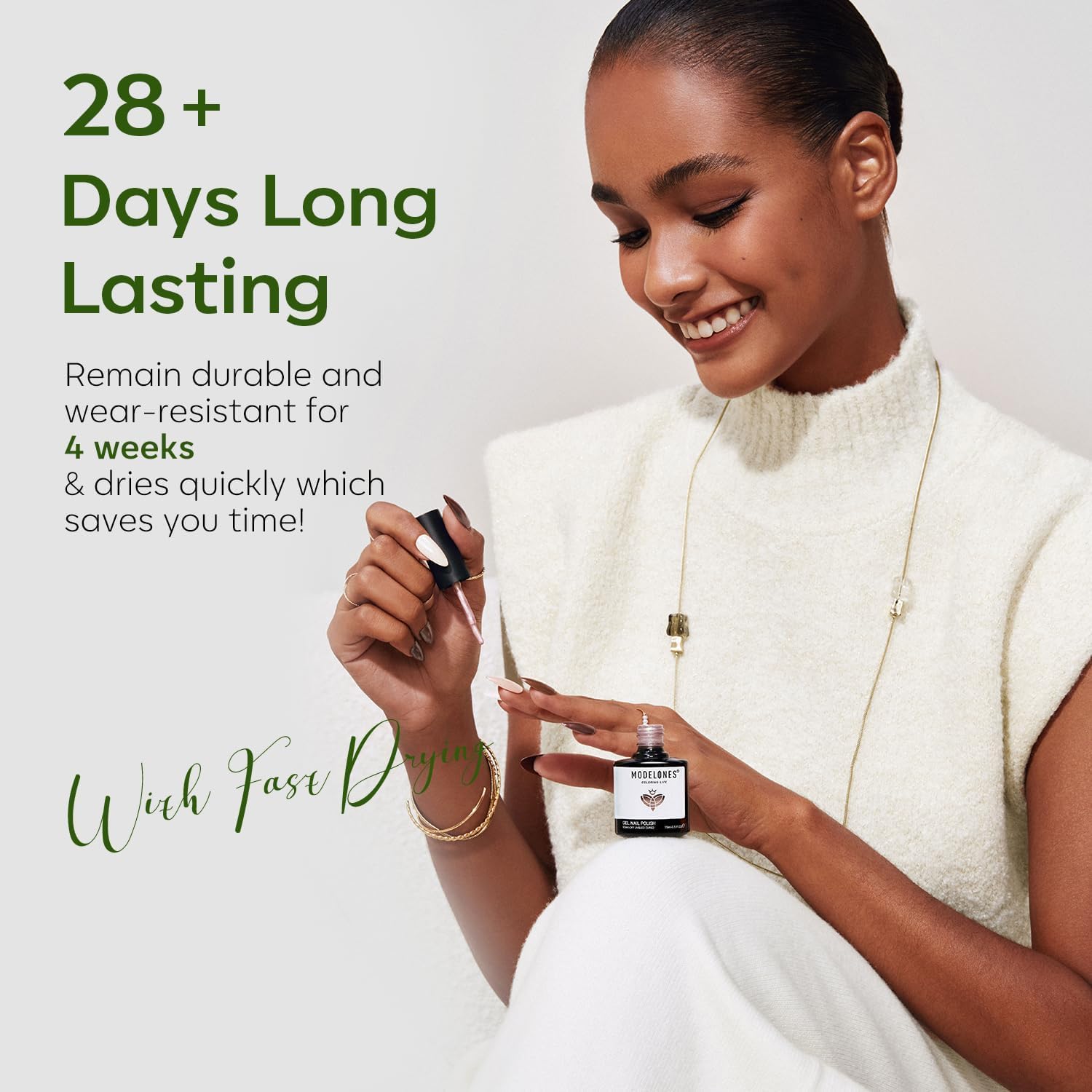 High Glossy Shine & 28 Days No Peel-off: Say goodbye to air bubbles and peel-off problems with Modelones' patented "Inspire Gel" technology and amazing gel finish. Our exclusive easy-glide brush ensures professional, quick, even, and easy application on nails. Achieve long-lasting shine for over 28 days with just 3 minutes of application under proper conditions