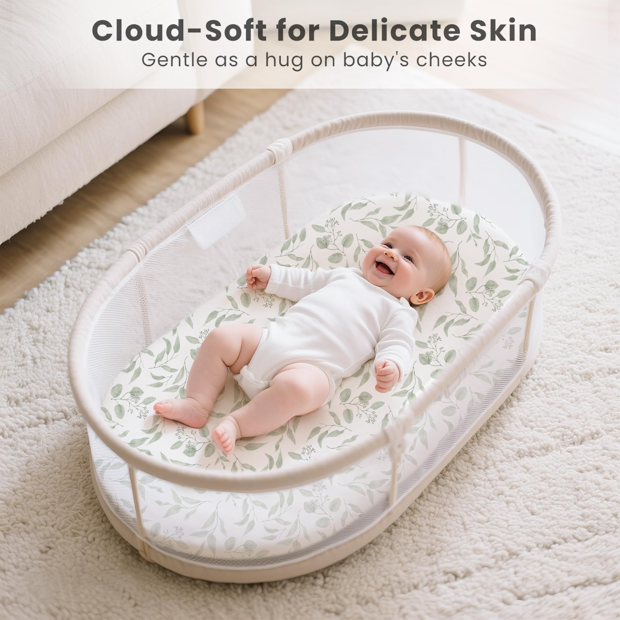 Stretchy & Soft: Made from 89% polyester and 11% spandex, Konssy bassinet sheets are ultra-soft and stretchy. They offer a breathable feel, absorb sweat, and promote airflow, ensuring your baby stays cozy and comfortable for restful sleep
