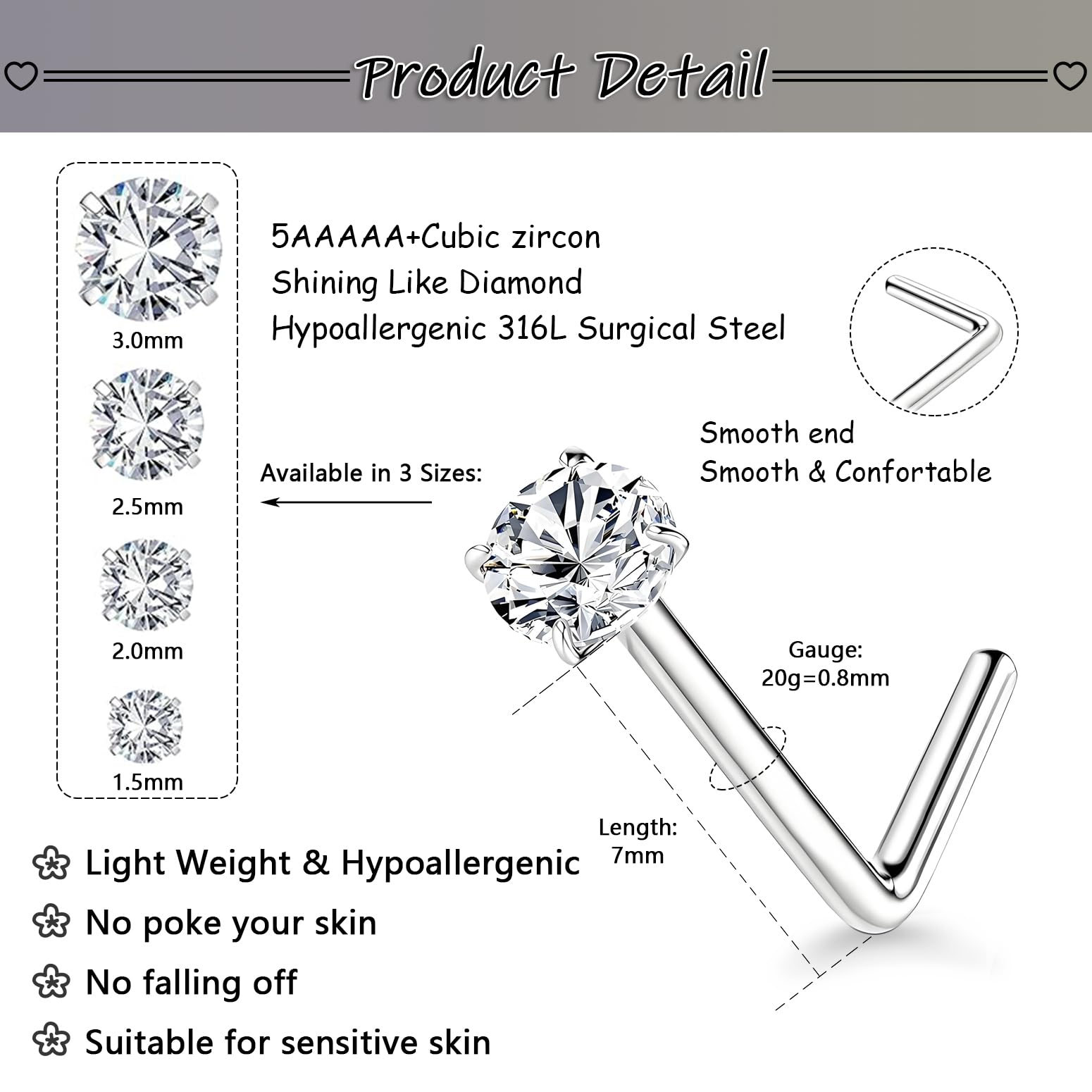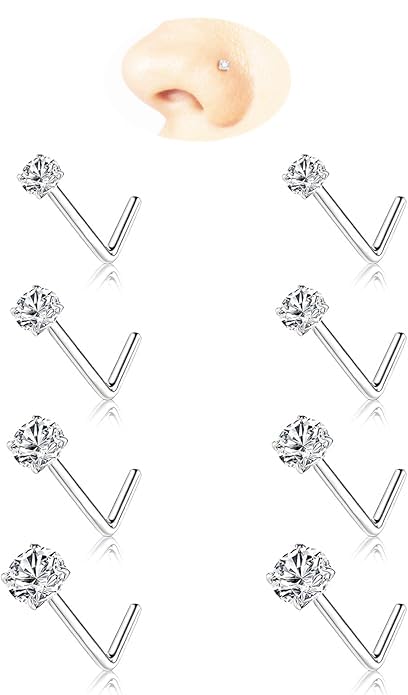 What You'll Get: A set of 8 exquisite L-shaped nose studs to add glamor to your nose piercing.