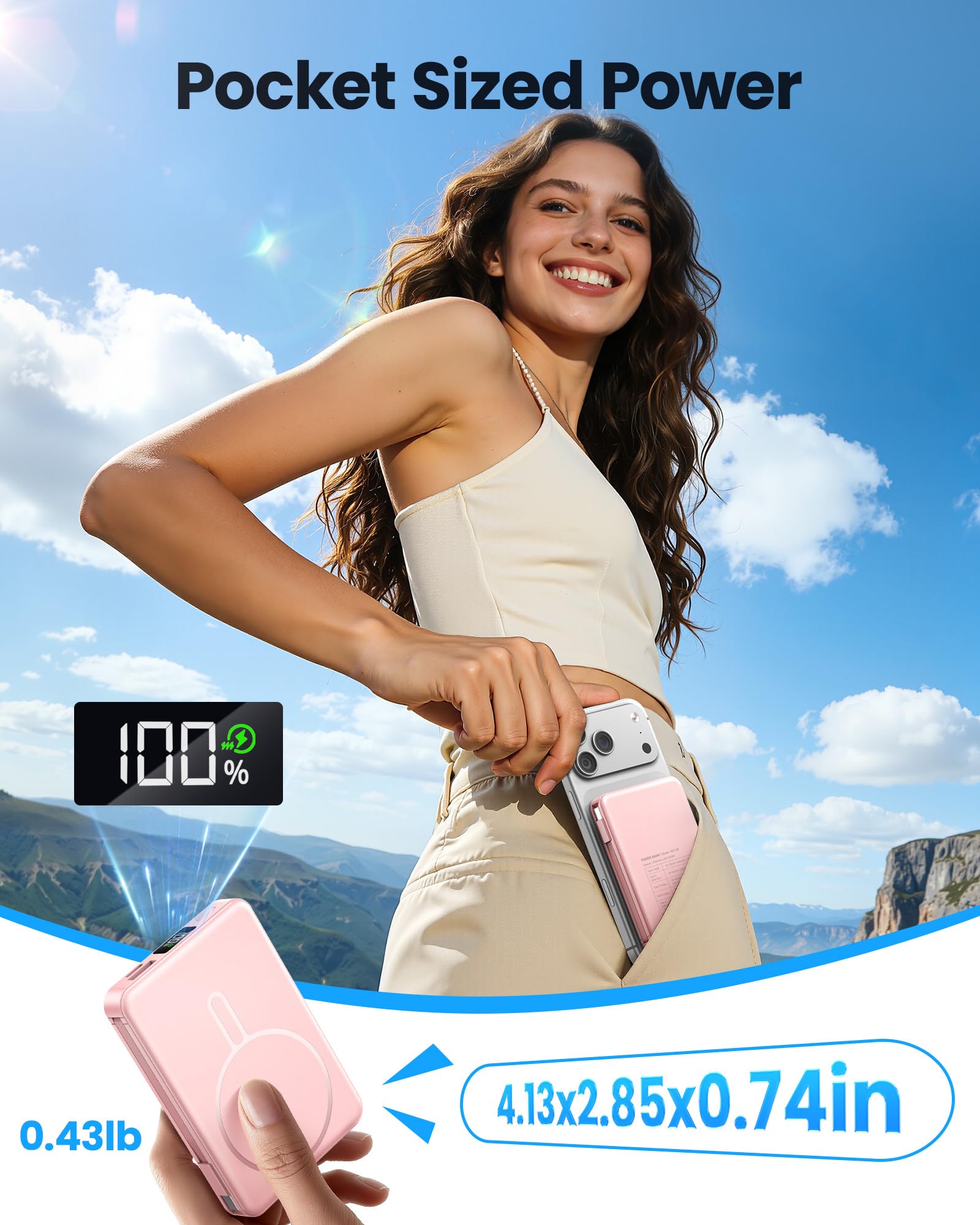 【Pocket size & Easy to carry】 The iphone portable charger weighing only 0.43LB (4.13*2.85*0.74 inch), the mini design allows you to easily put the wireless power bank in your pocket or backpack, and the lighter weight allows you to use it smoothly with your phone