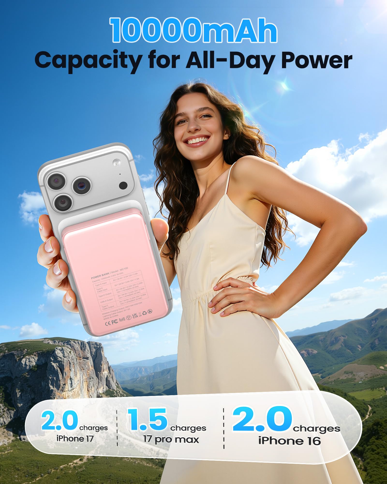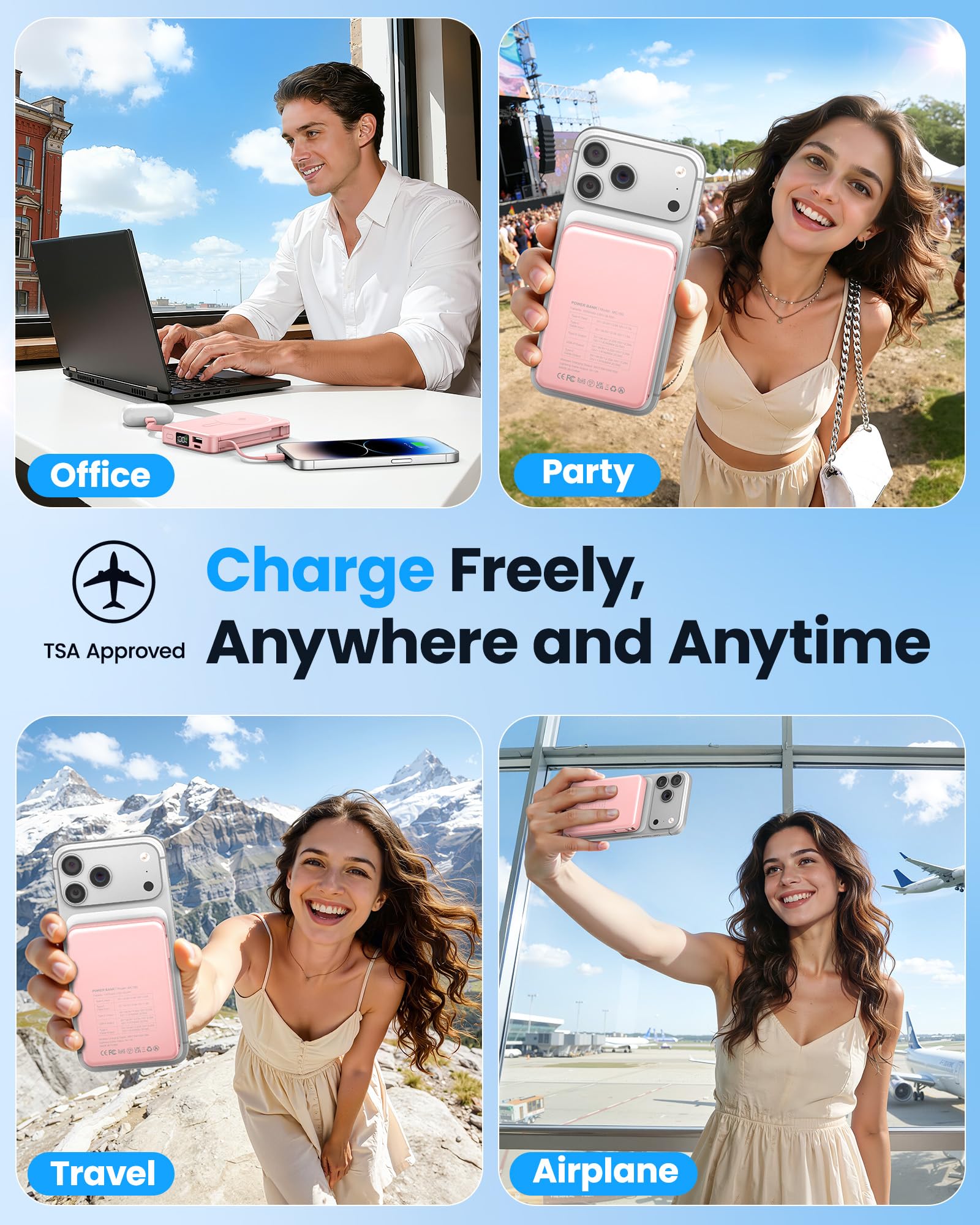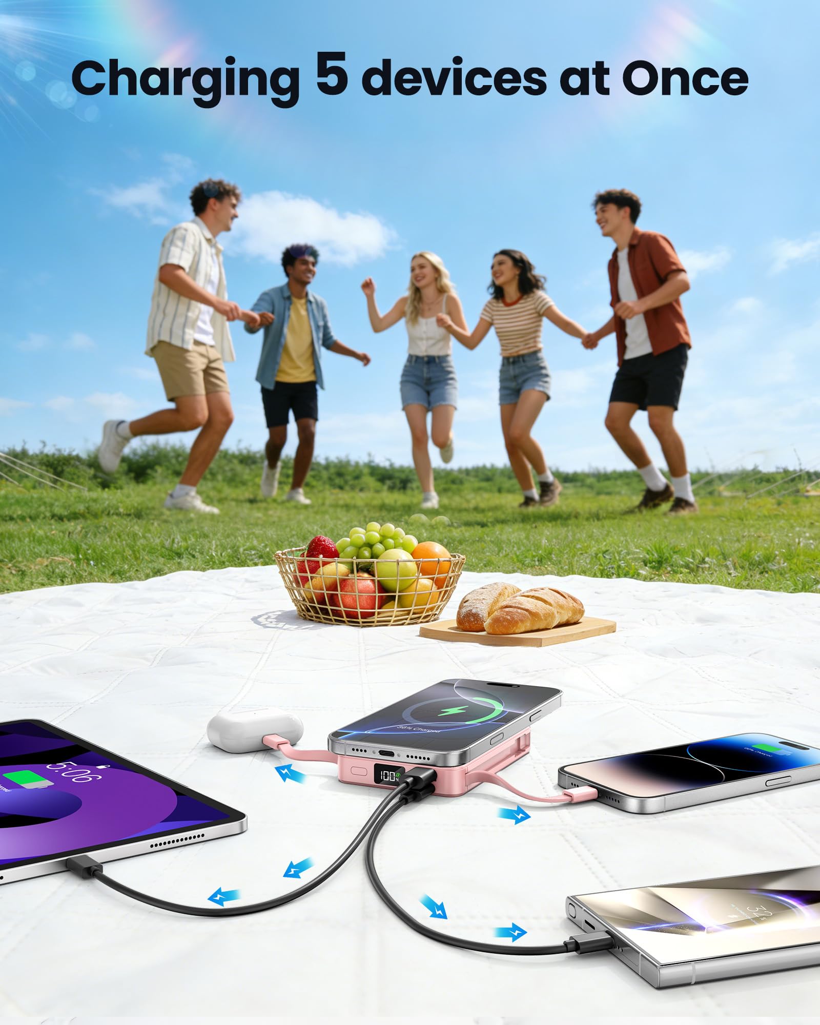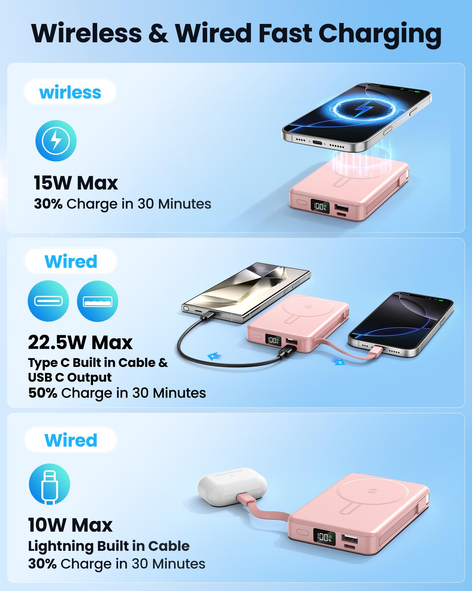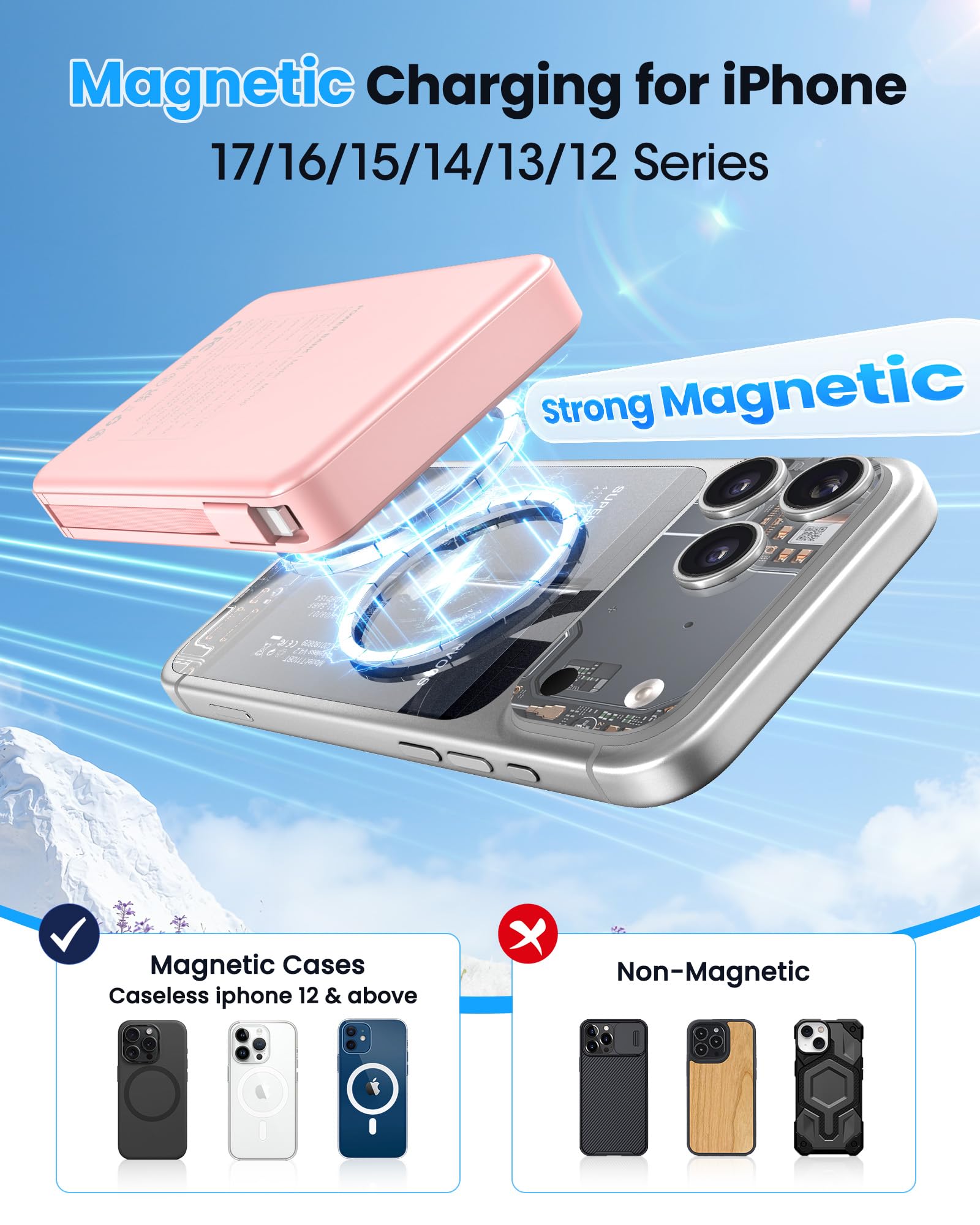【Built-in Cables & Super Strong Magnetic】This portable charger iphone has built-in type c charging and Lightning cables, compatible with iPhone or Type-C devices; Besides portable phone charger with the newest stronger magnetic technology can directly hold the back of your iPhone 17/16/15/14/13/12 Series and it is also Compatible with other phone like Samsung S23,S22,S21,S20, Google, Pixel, Android, iPad, Tablet and more with type C Cable