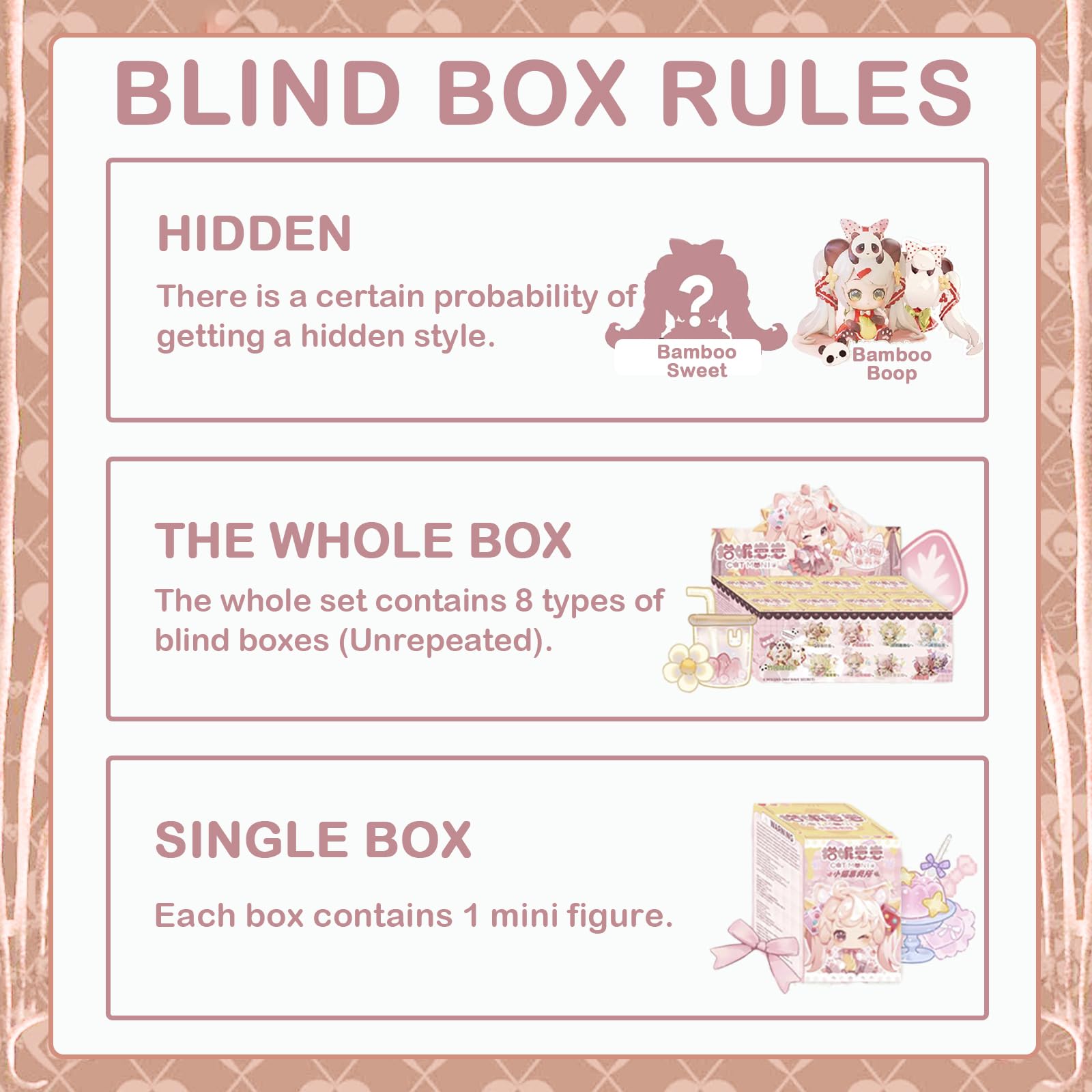 【About Random】NOTE: each blind bag is randomly arranged. You may get the figure in any single piece in probability of (1/8 for regulars, 1/16 for each two special editions, 3/320 for Bamboo Boop and 2/320 for Bamboo Sweet)