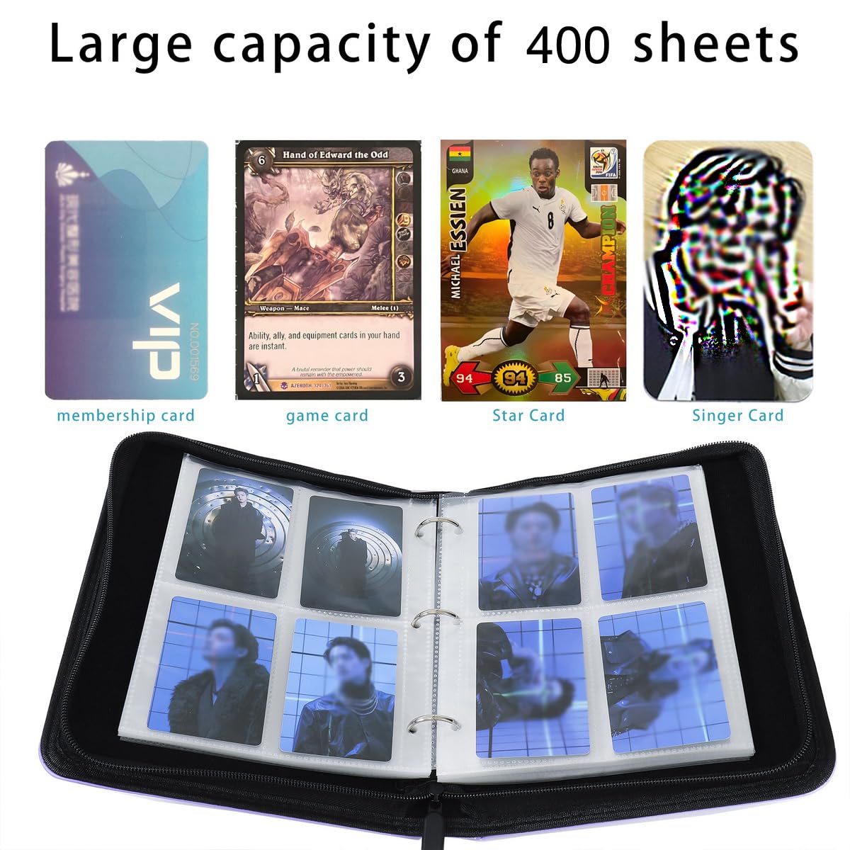 The 3-ring design is convenient for you to add or remove sheets at will. 4-Pocket binder with 50 pages of sheets can hold up to 400 cards, Sleeves with Zipper, Double Sided Pockets Card Holder.