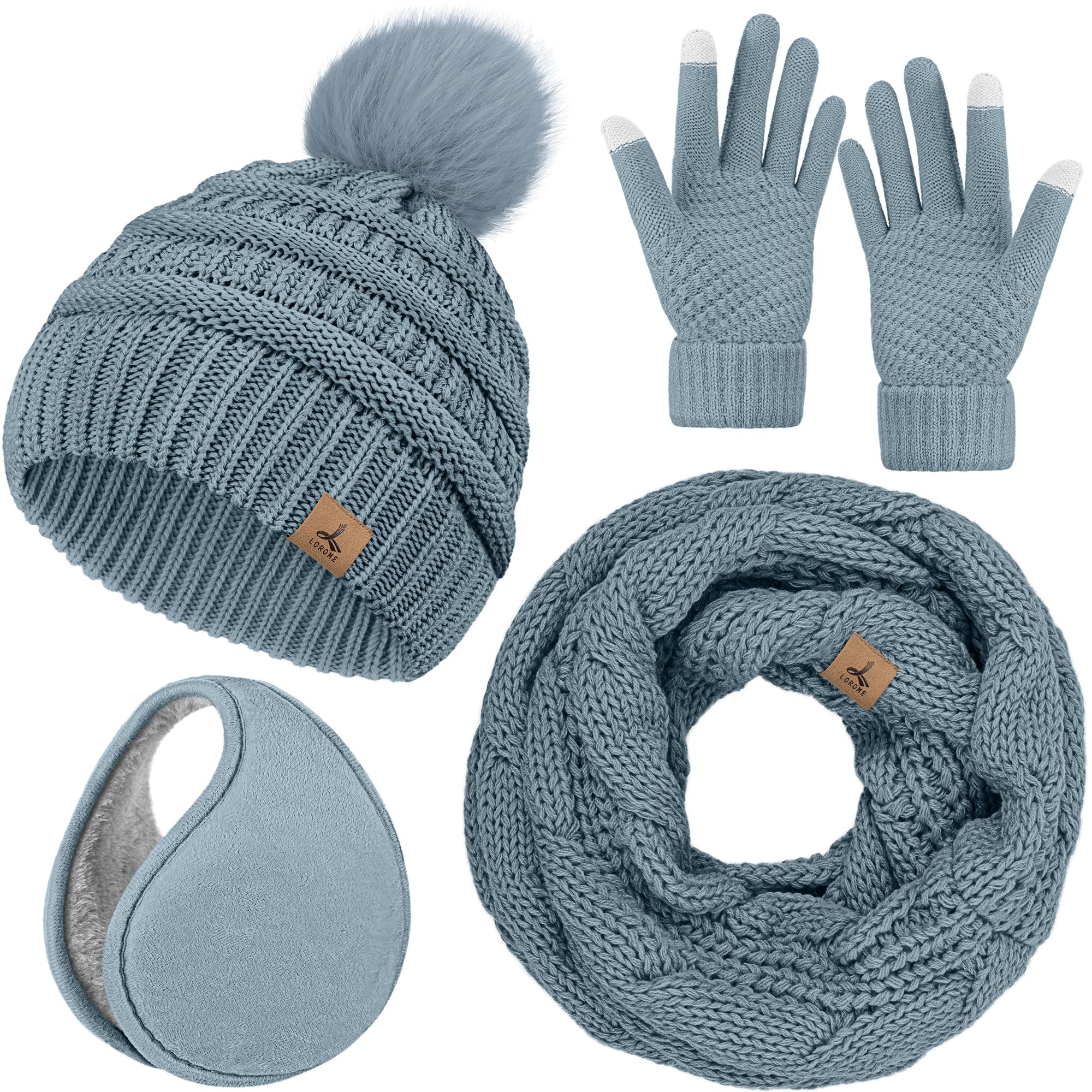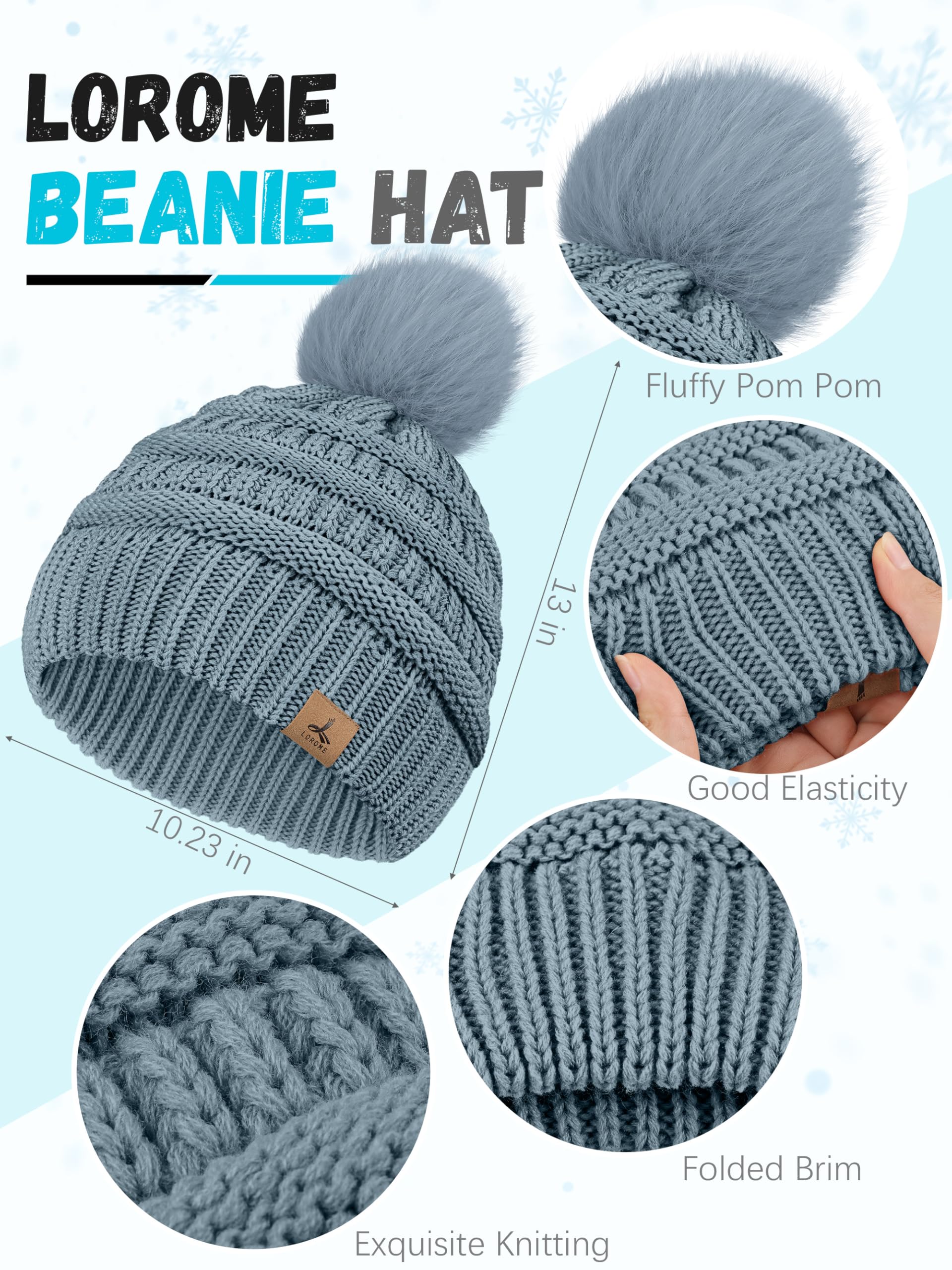 Unique Design - This women hat and gloves set is your wonderful choice for winter, featuring knitting process, soft pom pom on hat, double layered and flanging brim design, exquisite LOROME label, light blue color, thick cuff and touch-screen design of gloves.