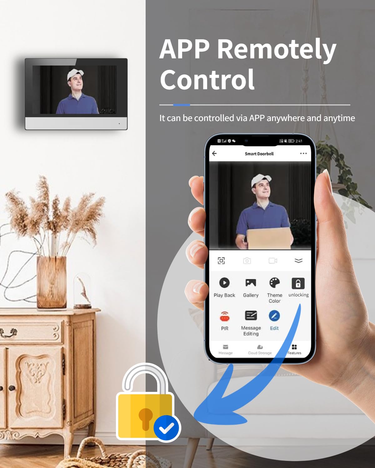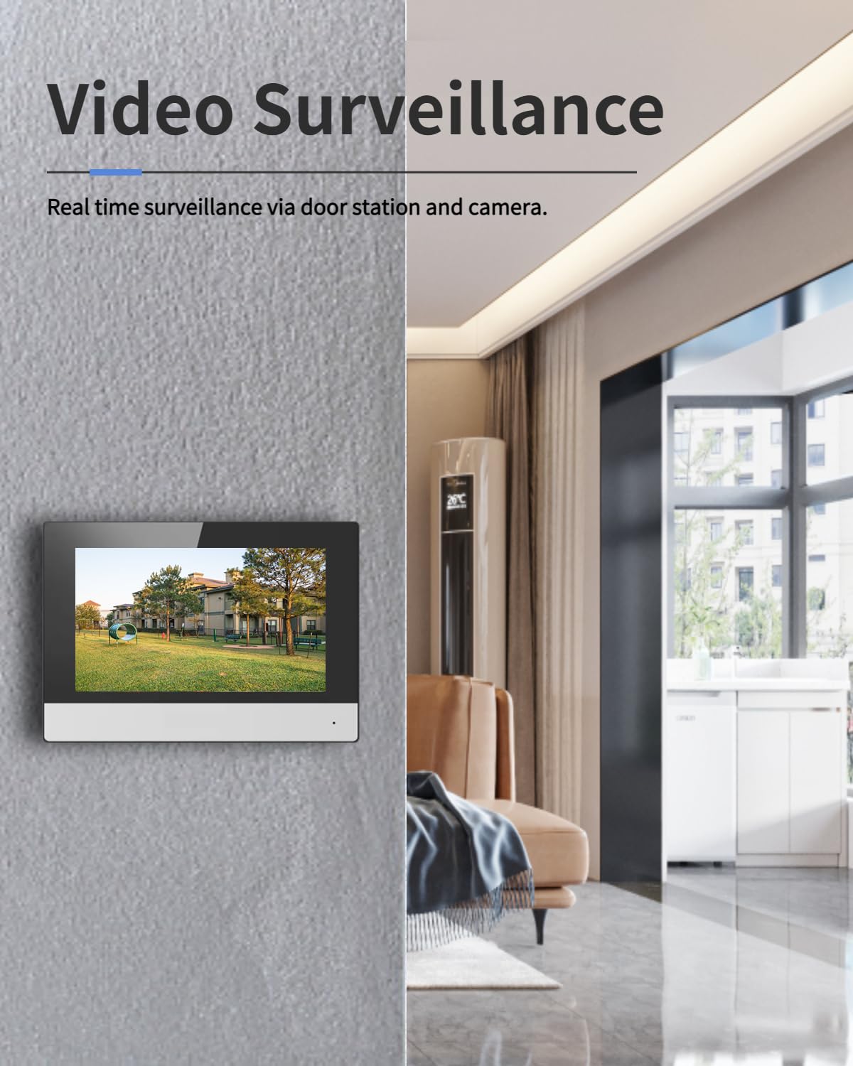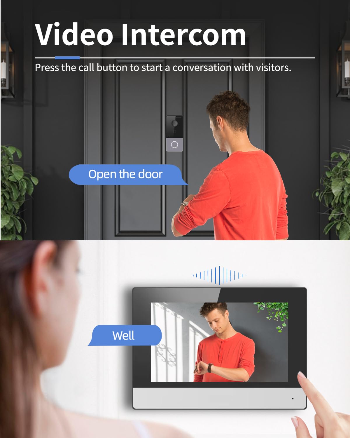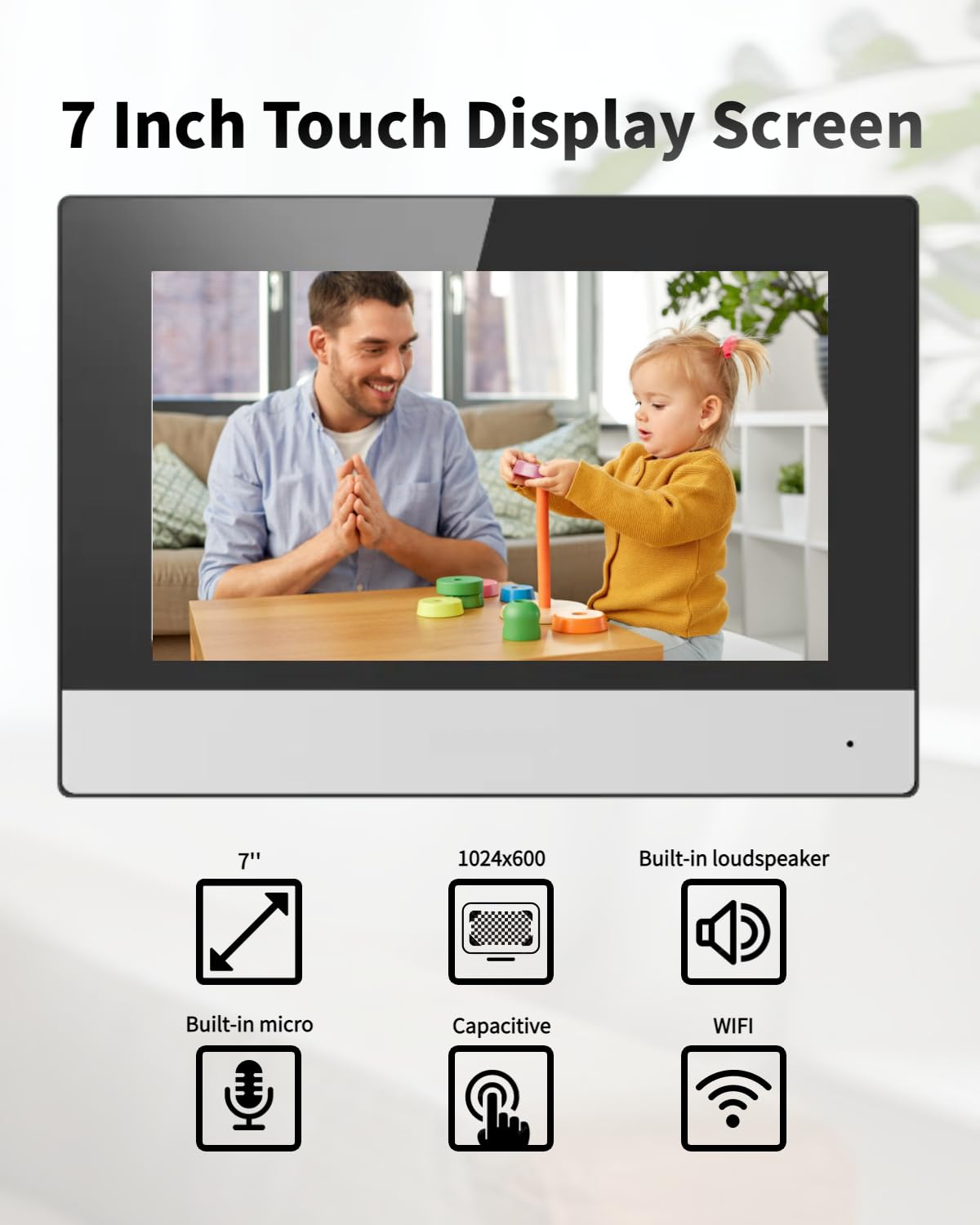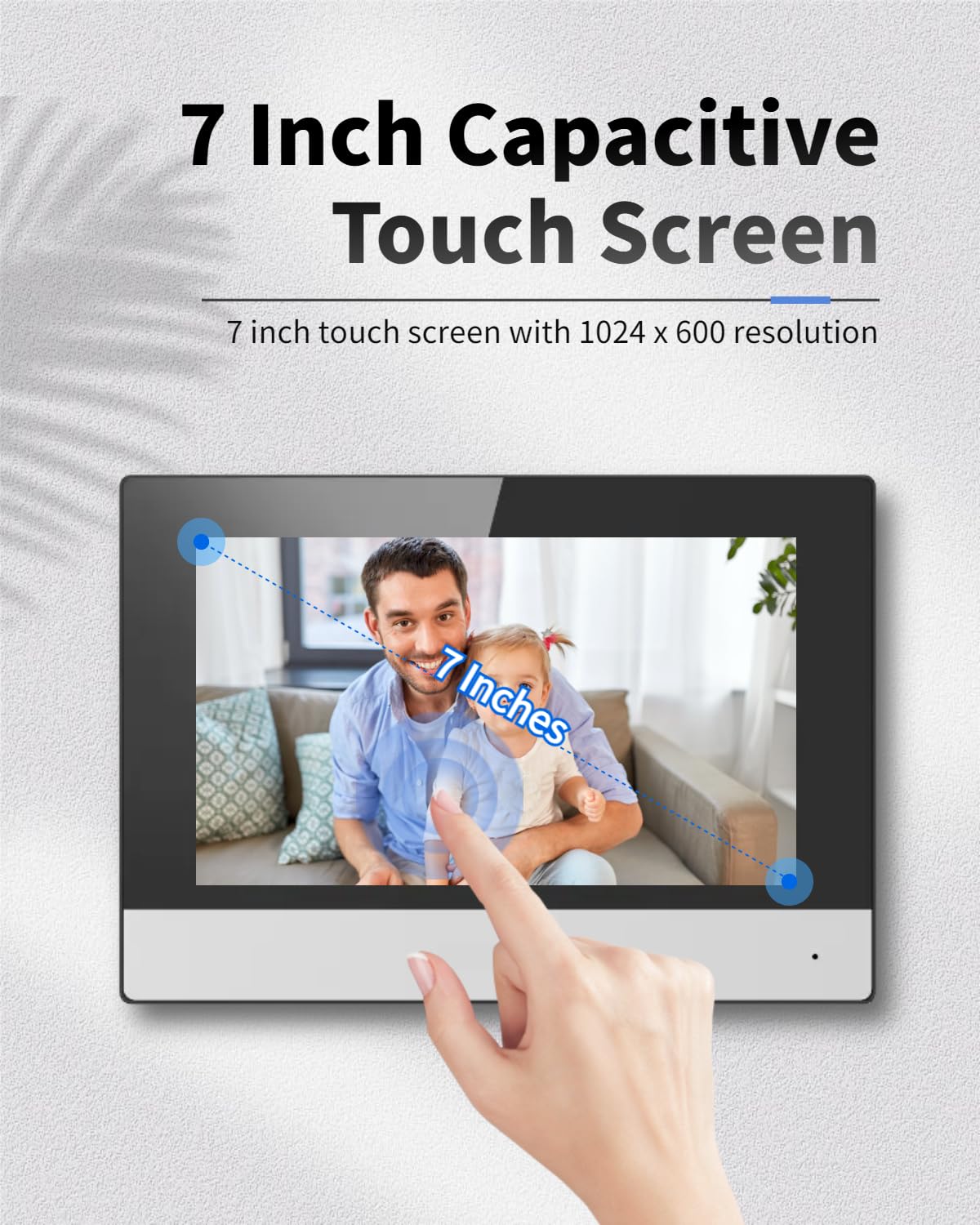 【7 Inch Colorful Touch Screen】 It's designed with 7 inch capacitive touch screen, you can click screen by your fingers, it's much smarter than traditional key operation. resolution of the screen is 1024x600 pixel, image is very clear from the display screen, when someone visits you, you can see visitor's appearance clearly.