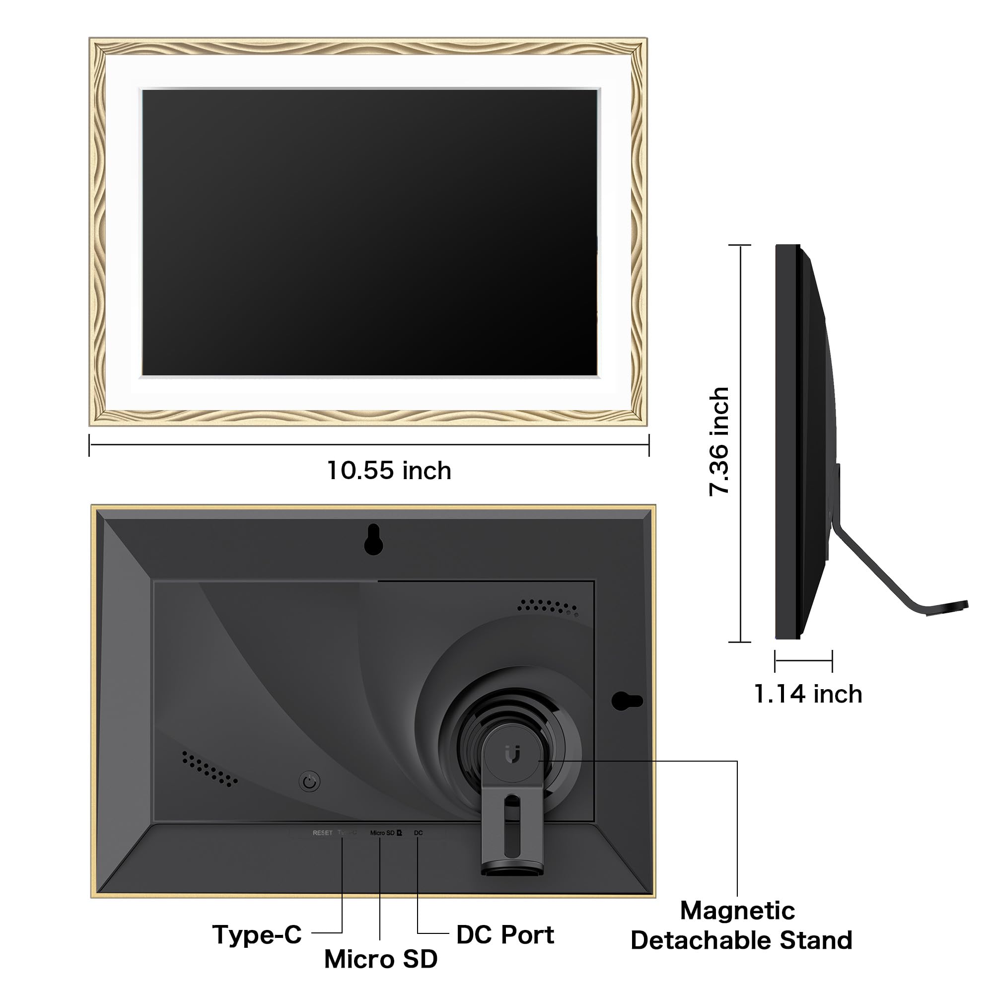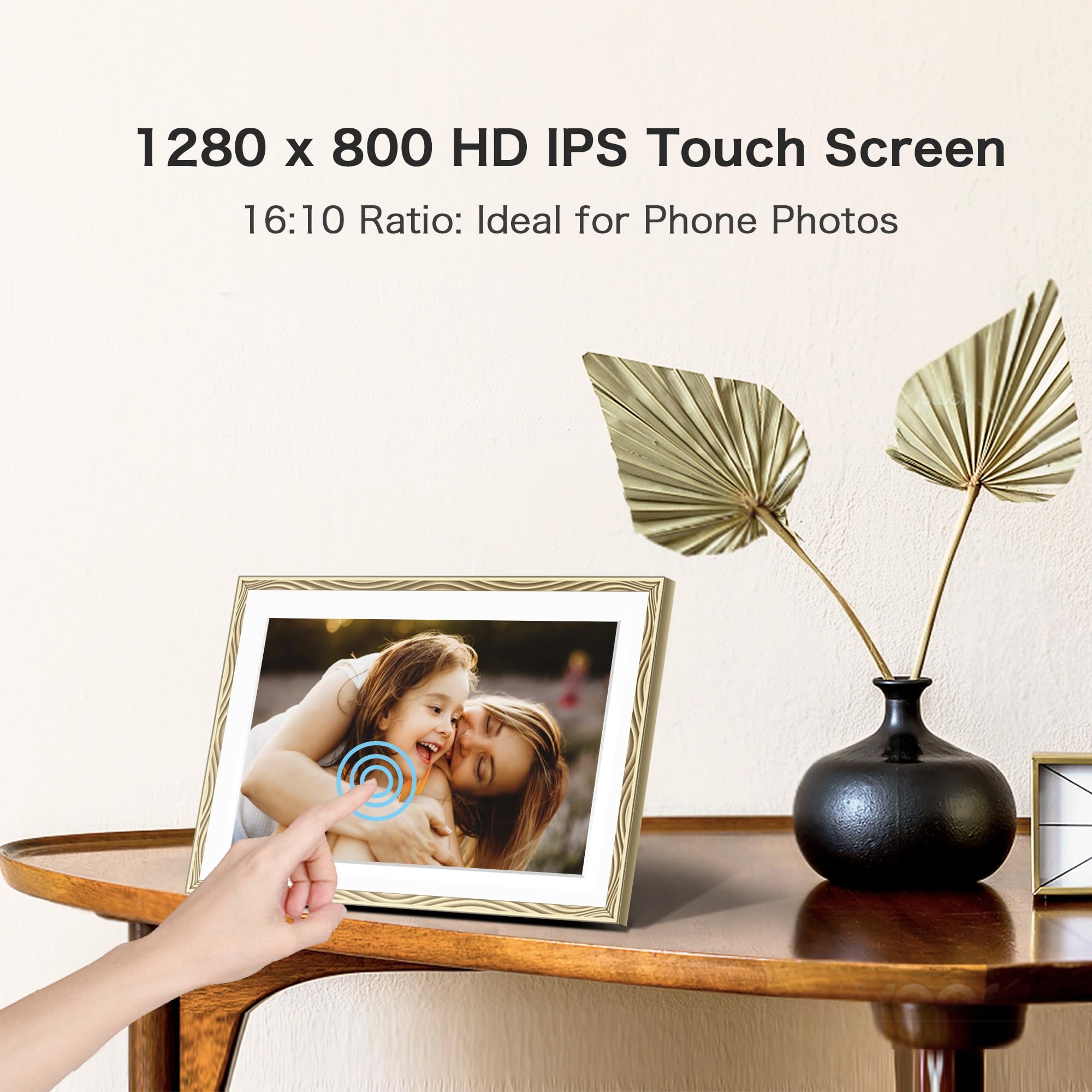 Sleek Design, Smart Features - This award-winning electronic picture frame enhances any room with its premium embossed design. The Frameo 10.1 inch smart WiFi digital photo frame boasts a 1280x800P HD touchscreen for crisp, vibrant images and easy navigation. Its versatile magnetic stand allows quick orientation changes, while wall-mount options provide flexible placement. Designed for lasting quality, this electric frame beautifully displays your favorite memories as stunning slideshows.
