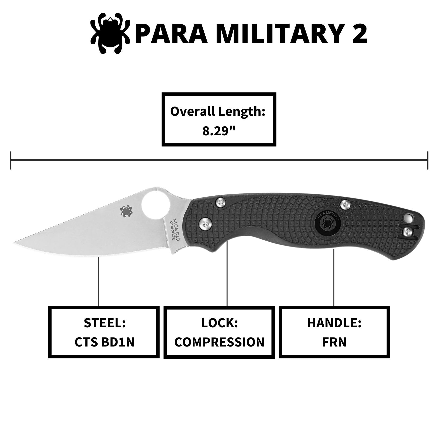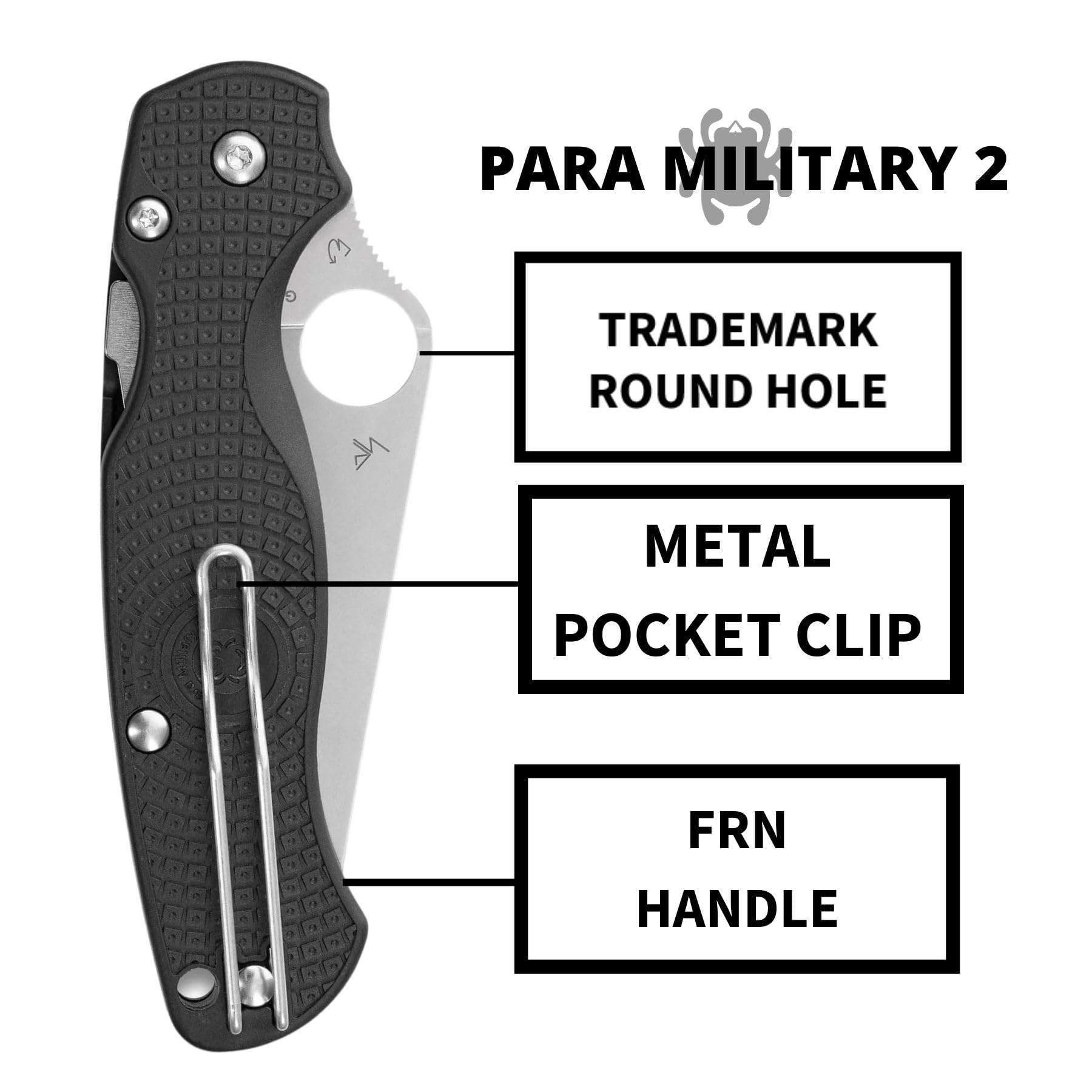 The Spyderco Para Military 2 Lightweight takes the legendary design of the Para Military 2 and refines it into an even lighter, more pocket-friendly everyday carry knife. Crafted in the USA with premium materials, this model features a 3.47″ CTS BD1N full-flat-ground blade that delivers sharp, consistent cutting performance with excellent corrosion resistance and durability. Its lightweight FRN handle with Bi-Directional Texture ensures a confident grip during detail work and heavy use, while the Compression Lock system provides secure blade deployment and lockup. The signature Spyderco Round Hole enables smooth ambidextrous one-hand opening, making this knife a reliable choice for everyday tasks, outdoor use, and tactical carry. Founded in 1976, Spyderco is a leading innovator in high-performance knives, known for their signature round hole and ergonomic designs.