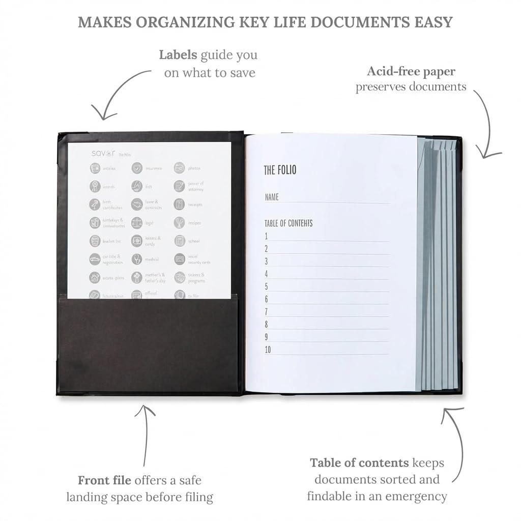 Easy to organize and find: Folders with pockets and a table of contents help track where documents live, while 33 hand-illustrated labels show what to save. Acid-free materials protect your papers for years to come.