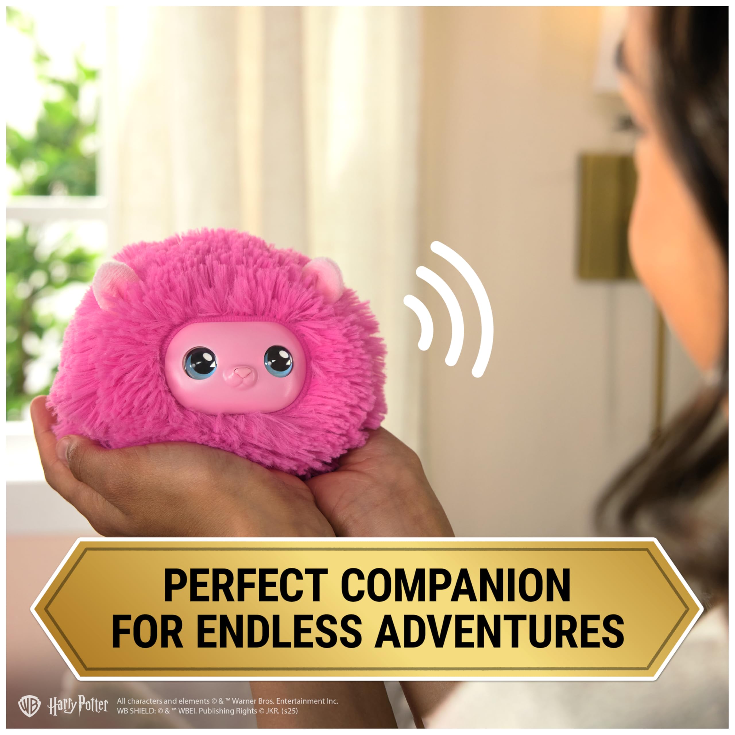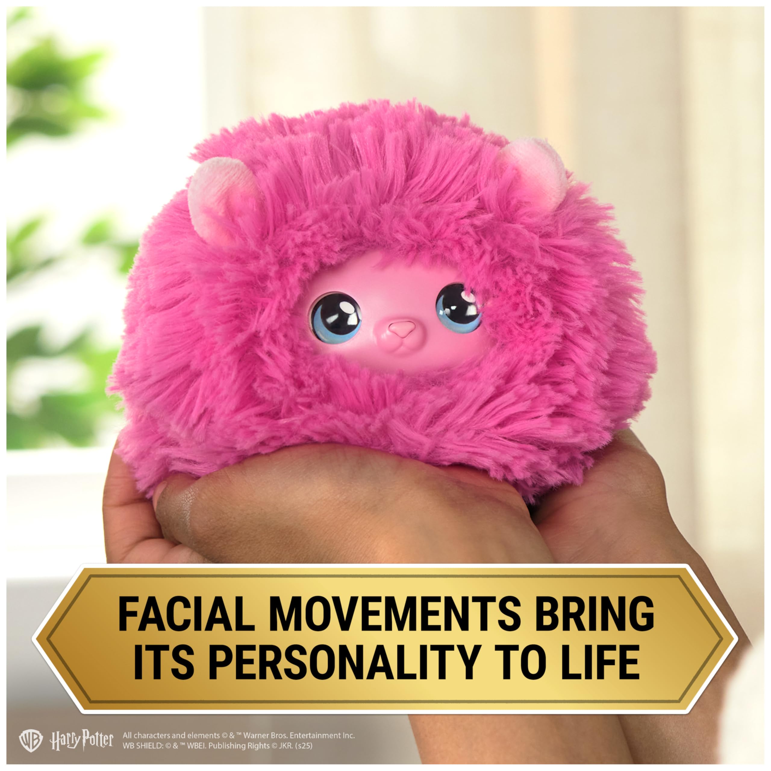 Interactive Pygmy Puff toy: This fluffy, interactive Pygmy Puff features authentic details, including plush pink fur & expressive eyes. Its playful personality comes to life with facial movements & over 35 sounds & reactions