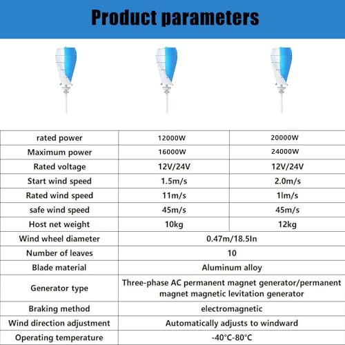 Introducing the Helix Magnetic Levitation Wind Mill Generator, engineered for exceptional performance in wind-rich environments. This innovative wind turbine is designed to maximize energy capture, making it perfect for a variety of applications such as telecommunications, water pumping, outdoor lighting, off-grid living, and low-energy battery charging. With its ability to generate power even at low wind speeds, this turbine efficiently harnesses wind energy, ensuring reliable performance year-round. Imagine pairing this generator with solar panels to create a hybrid energy system that balances seasonal energy demands, offering a consistent energy supply for your home or business. Built from high-strength fiberglass, the turbine blades are crafted for durability and provide smooth, quiet operation. The three-phase permanent magnet generator optimizes energy utilization, significantly boosting annual power generation. Installation is a breeze with our user-friendly flange design, allowing you to set up the turbine in various locations, including boats, gazebos, cabins, mobile homes, and both residential and commercial spaces. Key specifications include a starting wind speed of 1.3 m/s, cut-in wind speed of 2.3 m/s, and a rated wind speed of 12 m/s, with voltage options available in 12V and 24V. Your package comes complete with 10 blades, a generator, bolts and nuts, a spindle and arm, and a wind controller, ensuring you have everything you need for a seamless setup. As a dedicated international seller, we value your satisfaction. If you have any questions or need assistance, don’t hesitate to reach out to us via email. We are here to provide prompt support and enhance your experience with our product.