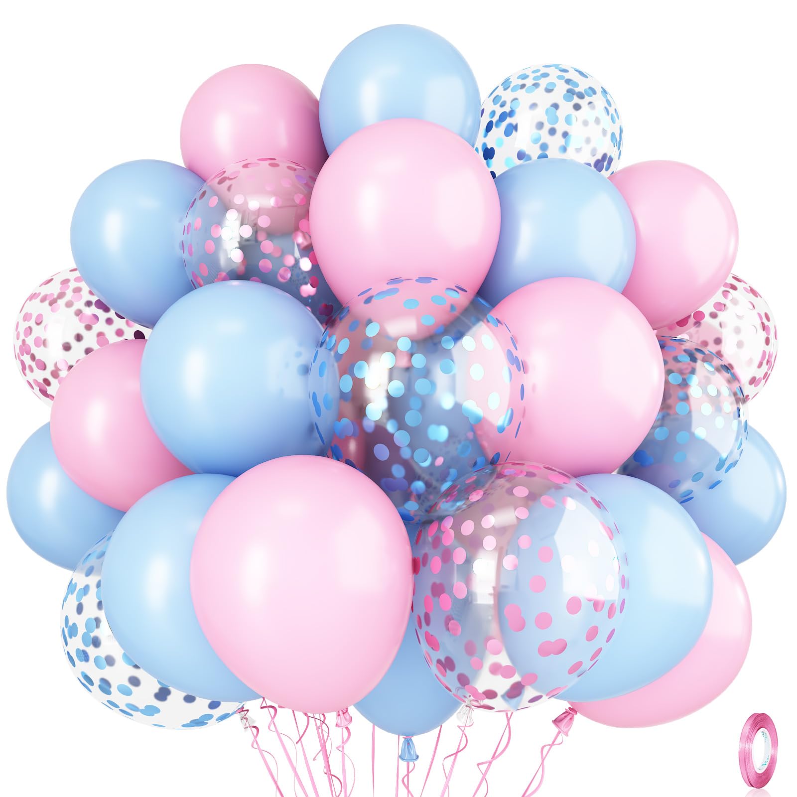 🎉 Pink Blue Confetti Balloons - You will get 35 pieces 12 inch latex party balloons set, includes pastel baby blue 13pcs, pastel baby pink 12pcs, blue confetti 5pcs, pink confetti 5pcs, come with 1pc pink balloon ribbon. Perfect for girls or boys gender reveal birthday baby bridal shower wedding party decorations supplies.