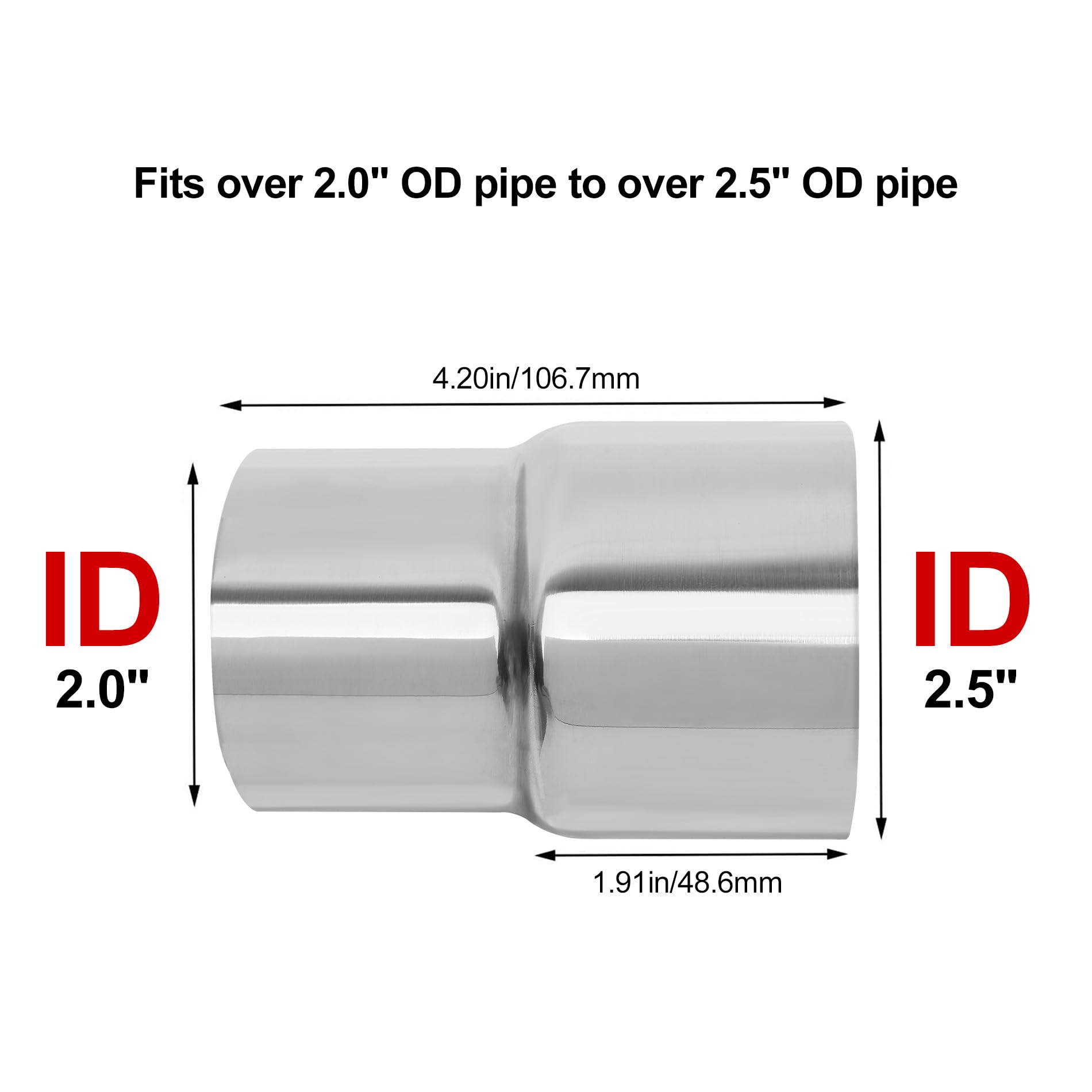 Size: This 2.0" ID to 2.5" ID exhaust reducer joint connects a 2.0" OD pipe to a 2.5" OD pipe, with a total length of 4.2 inches. Please measure before purchasing.