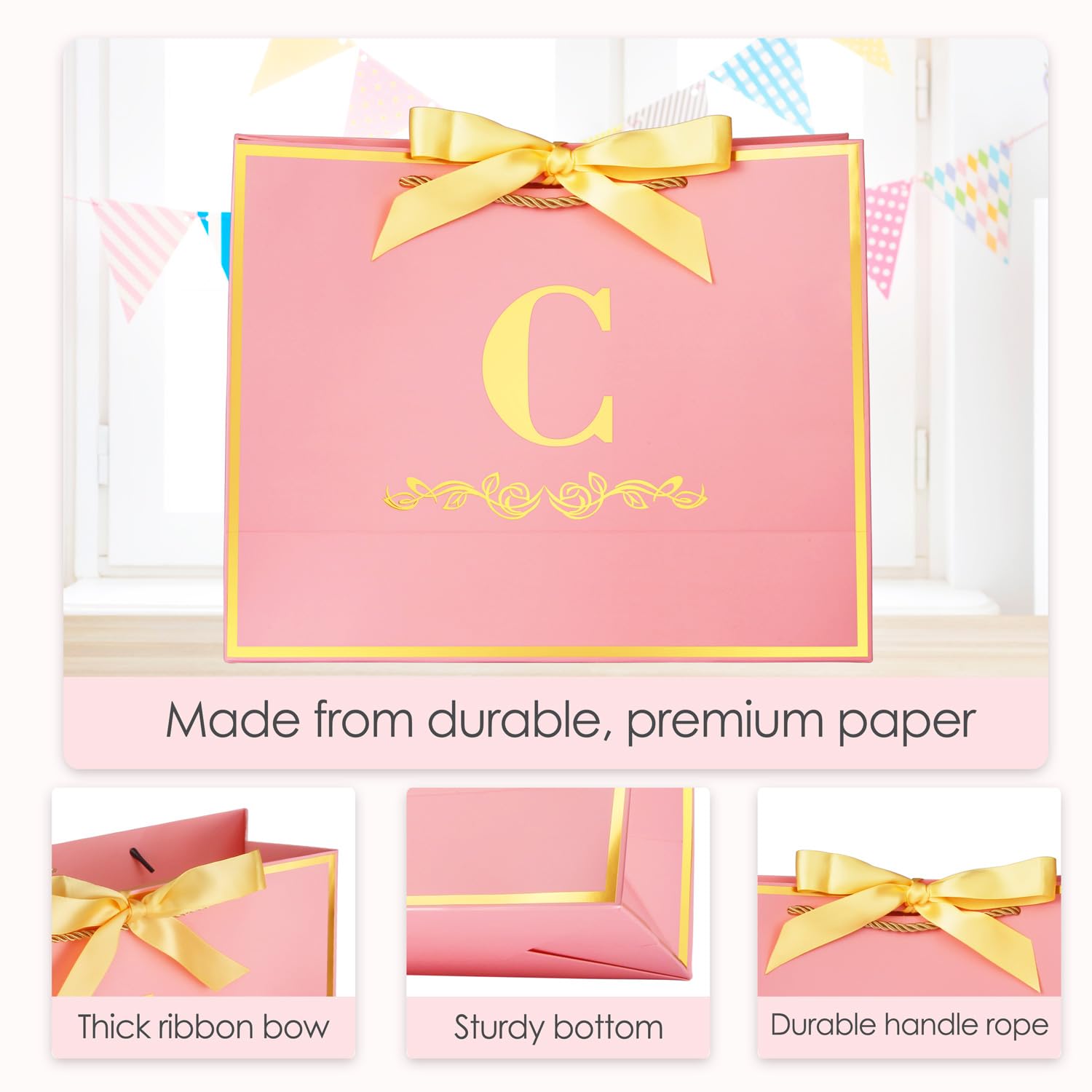 Gift Bag for Her: The gift bag is with unique letter from A to Z, in elegant gold cursive lettering on both sides. This is letter C gift bag. The bag is crafted to be both fashionable and practical, making it a keepsake that will be cherished for years. Perfect for bridesmaids, anniversaries,or even as a fashion statement, this bag is sure to impress. Don't miss the chance to bring joy to someone's special day with this unique, personalized gift bag.