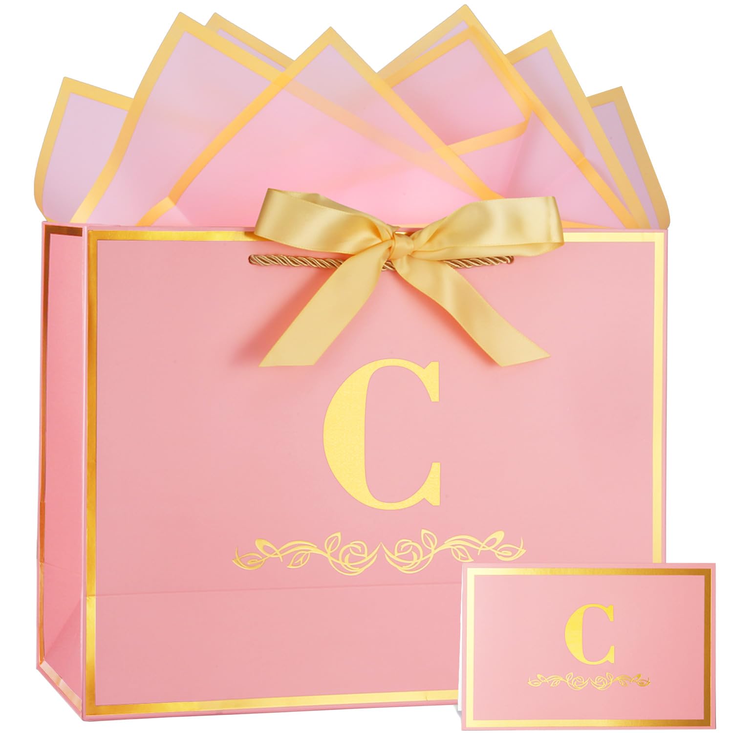 Initial Birthday Gift Bag with Card and Tissue Paper for Women/ Her, 13" Large Pink Gold Personalized Alphabet Bag for Women, Bridal Party Gift Paper Bow Gift Bag for Gifts Wrapping
