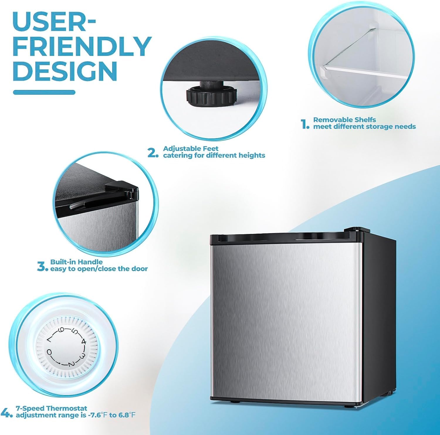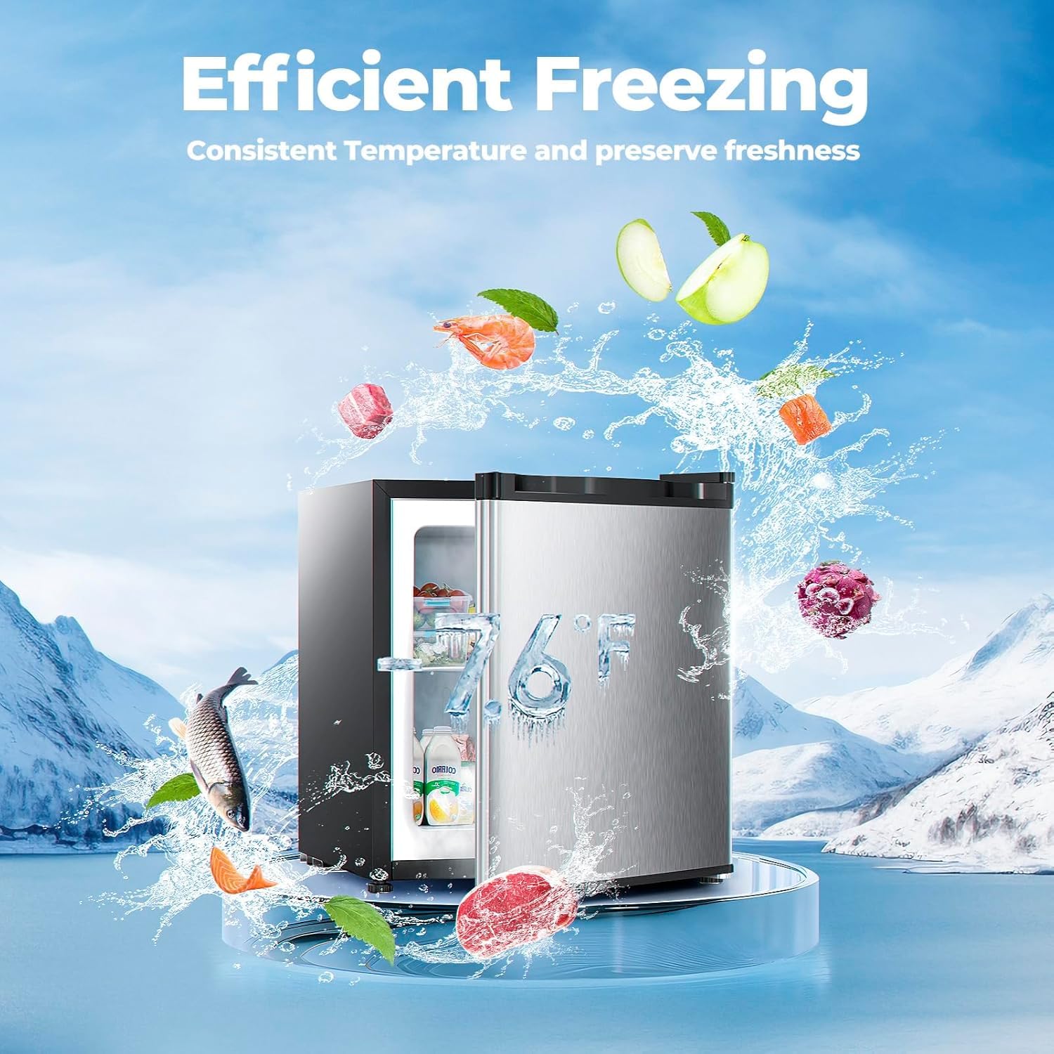 🧊ALL-ROUND FAST COOLING:1.1 Cu.ft high capacity upright freezer with powerful refrigeration. Faster and more thorough freezing, ten minutes of extremely fast freezing, to ensure the freshness of the ingredients. Compact Freezer is saving space design.Large Capacity is Great using for breast milk, meat, ice cream, aquatic products, cold drinks, quick-freezing and other purposes.Perfect for Home,Dorms,Kitchen and Office.
