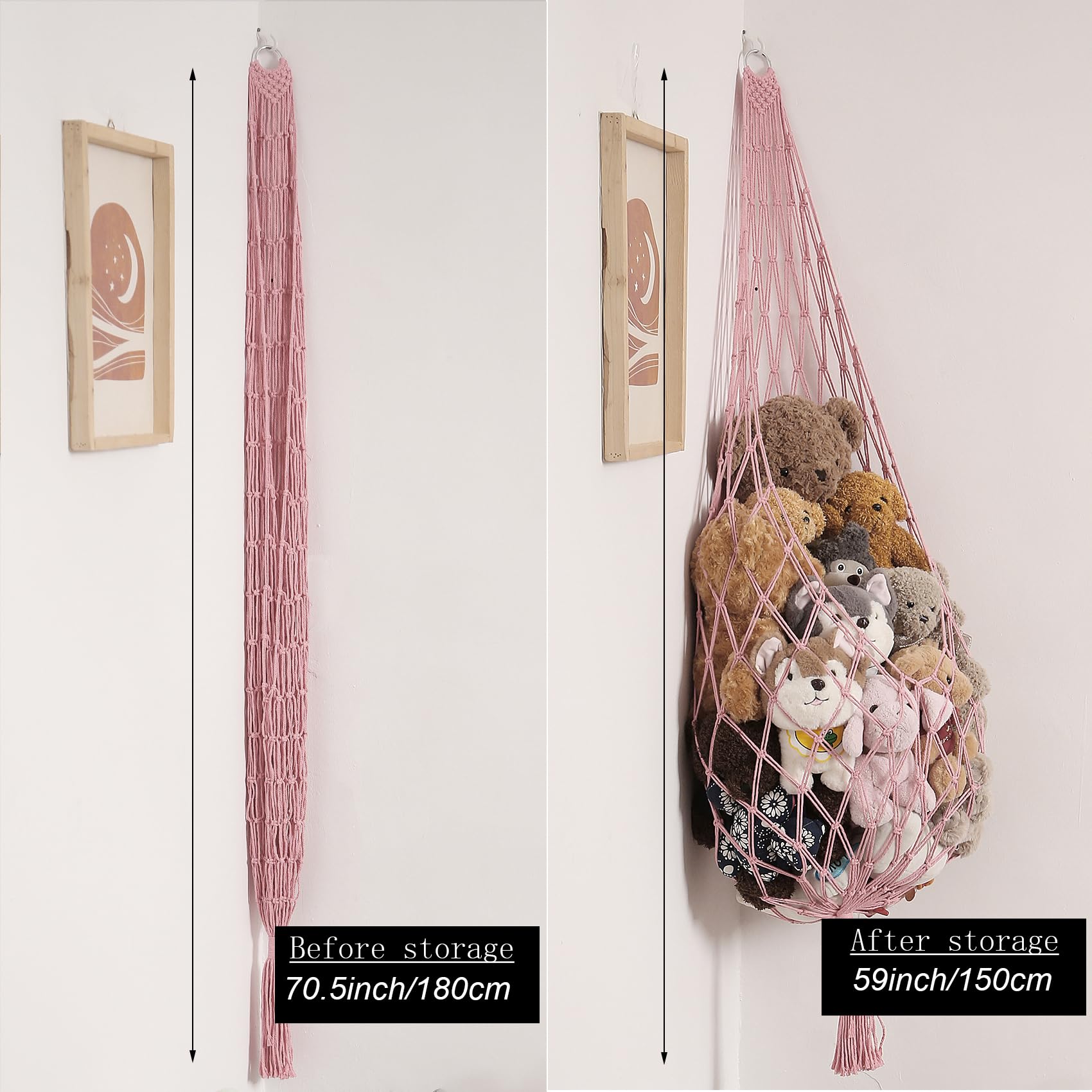 Installation space saved by 30% in comparison with other hammocks. No need to worry about insufficient space to store plush toys in your home. Ingenious single hanging vertical design for all kinds of spaces - ceilings, narrow walls, small corners, even a corner 10 inches wide or an small empty wall.