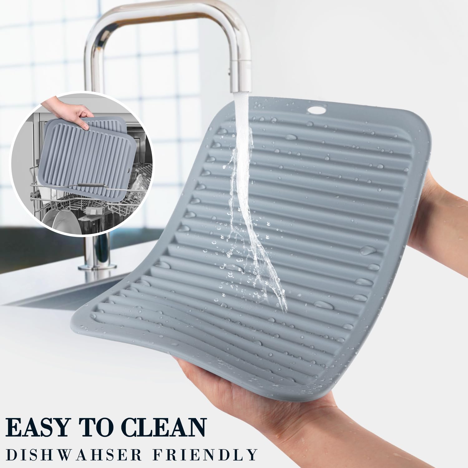 🍳【EASY TO CLEAN & STORE】: The grey silicone pot holders for kitchen are easy to clean, wipeable, and dishwasher safe. Almost everything can be easily washed off from surfaces and dry quickly. Roll up or hang it on a hook; save valued kitchen space!
