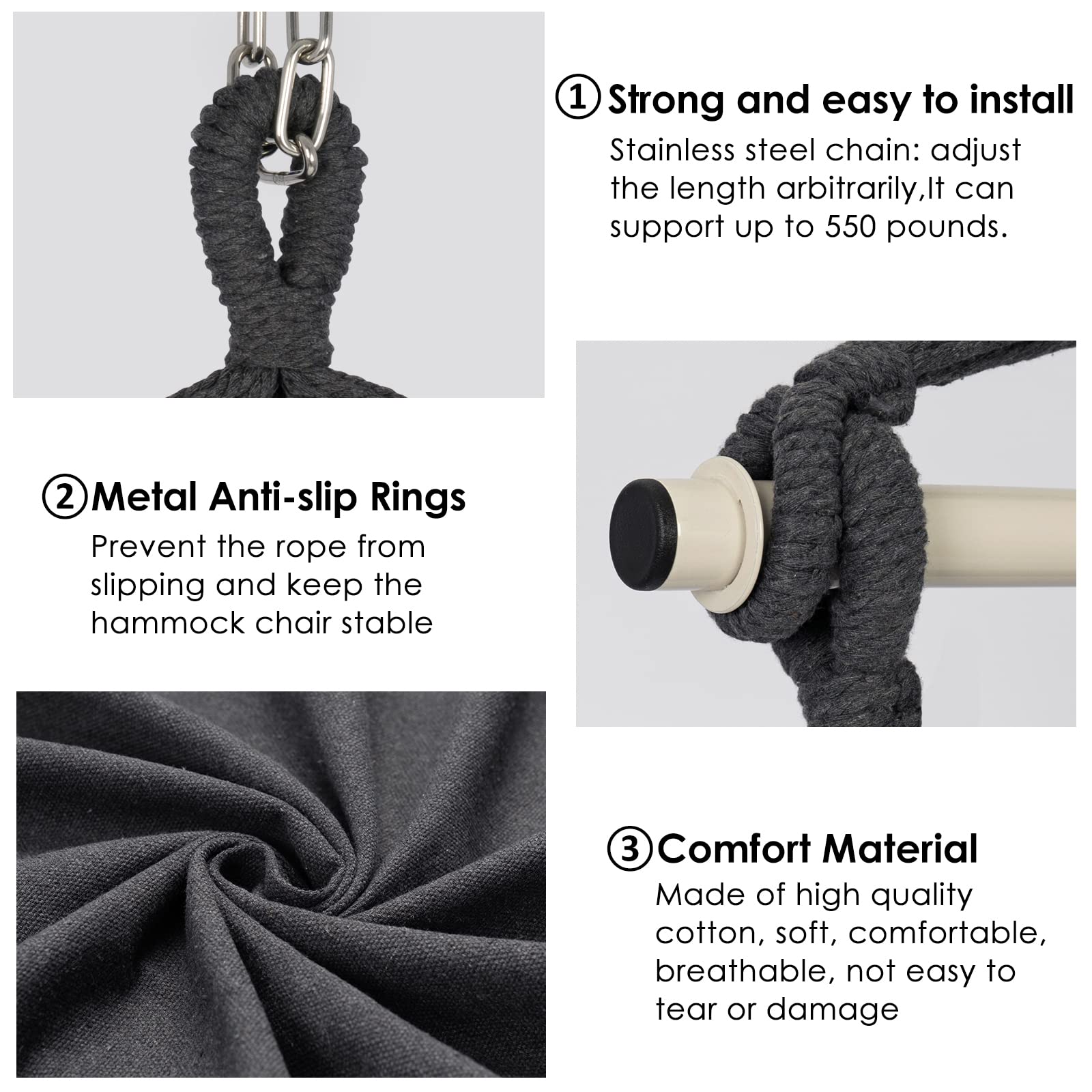 Hanging chair: Safe and strong , the sturdy spreader bar makes the hammock chair more stable. The anti-slip grooves on both sides can effectively prevent the rope from sliding, and the maximum weight is up to 500 Lbs
