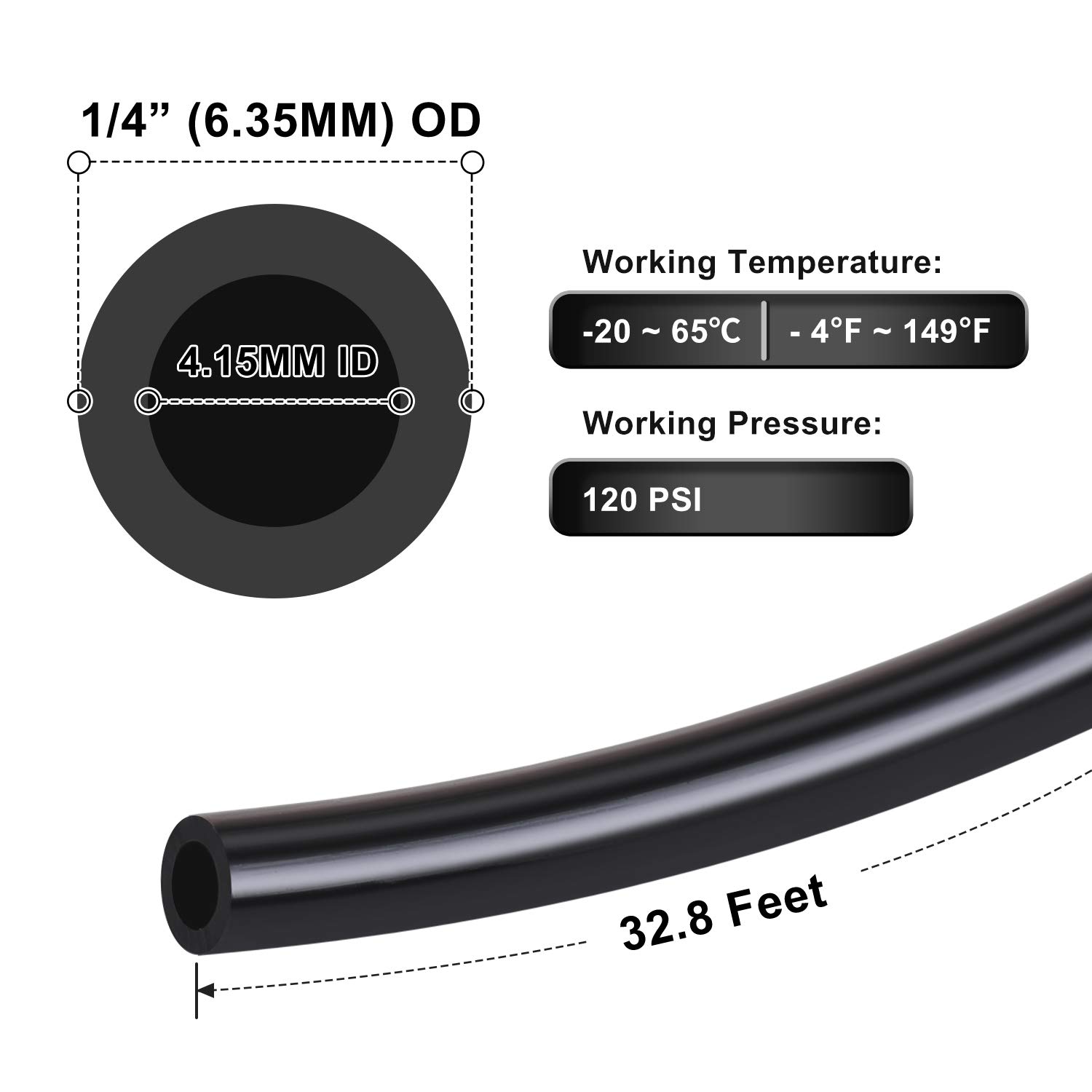 PU AIR TUBING - Length: 32.8 Feet (10M); Outer Diameter: 1/4” (6.35mm); Inner Diameter: 4.15mm. Max Working Pressure: 120 PSI; Bursting Pressure: 360 PSI. Working Temperature: -4℉- 149℉. PU material provides the high flexible and oil resistant.