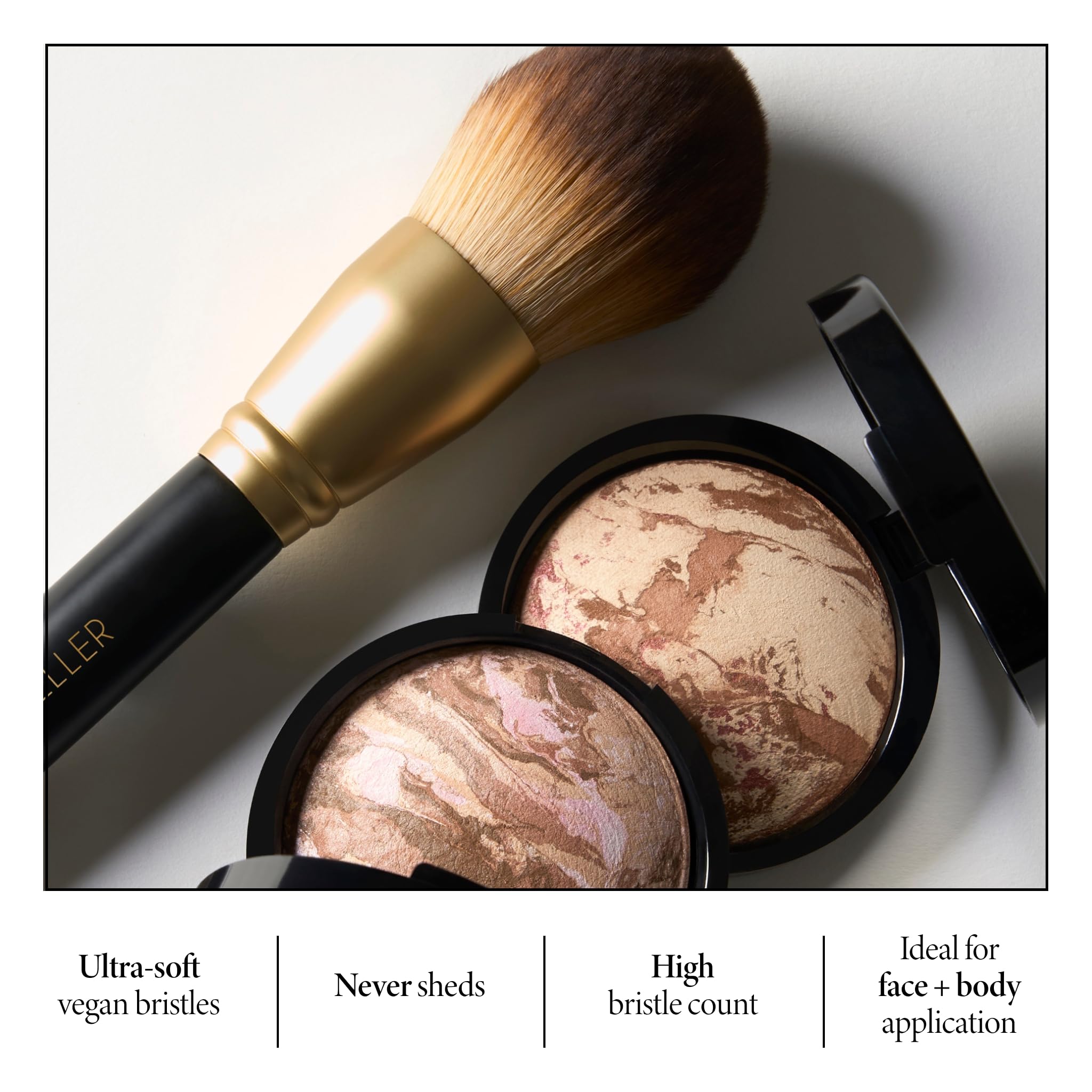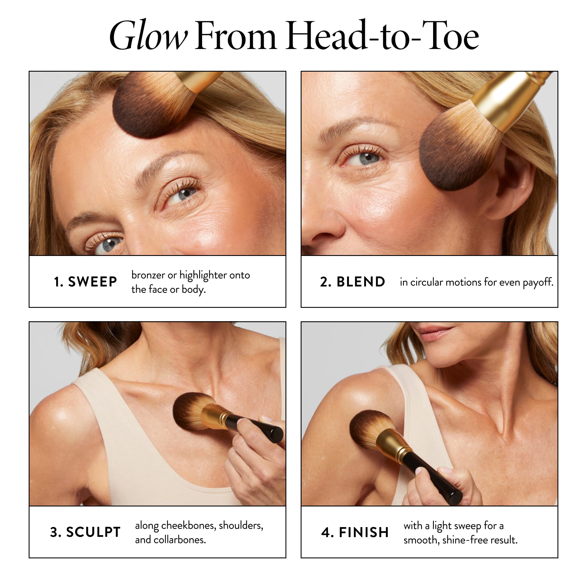 HOW TO APPLY: Sweep the bristles over the high points of the face for an all-over glow. To sculpt and define, focus on the hollows of your cheeks.