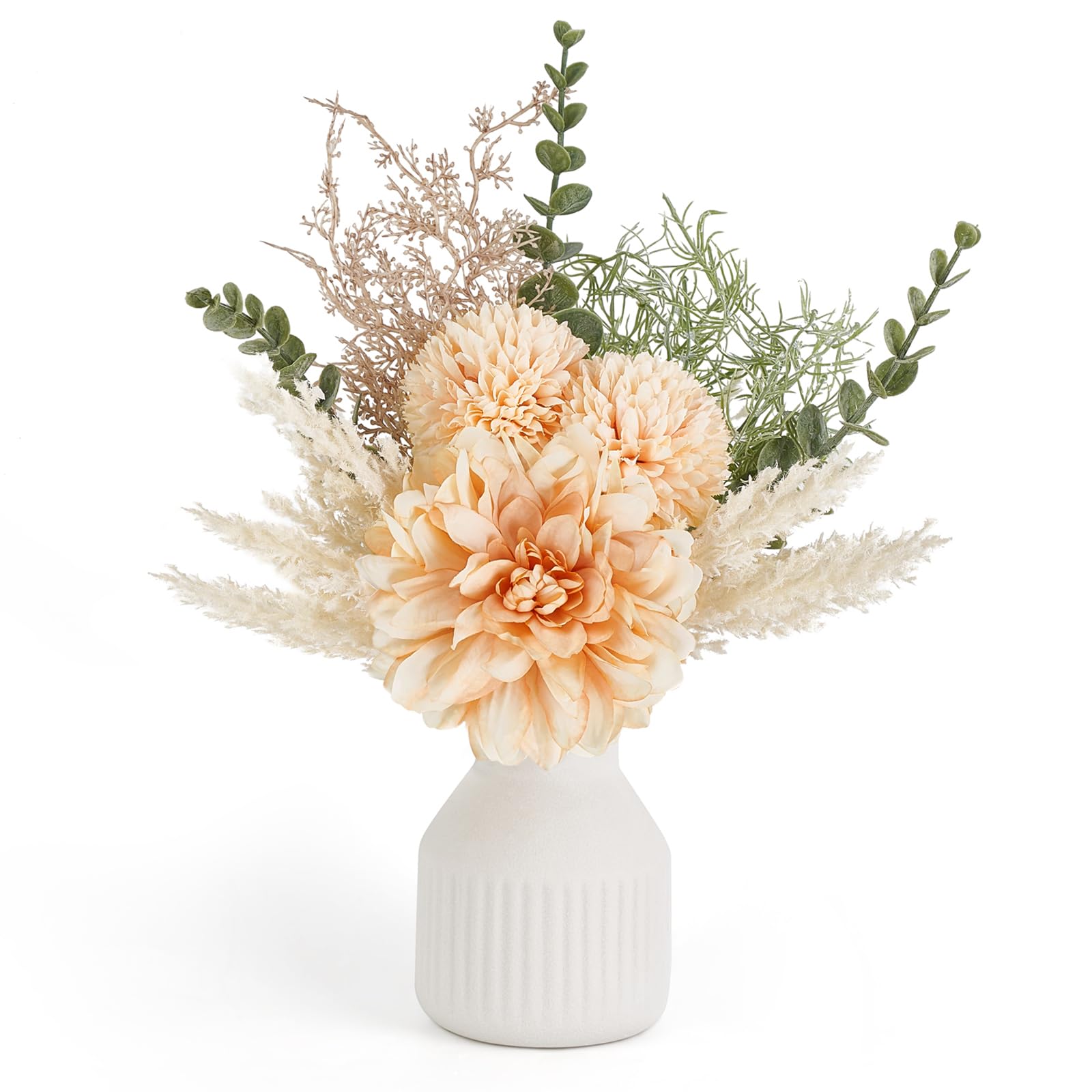 Small Faux Flowers in Vase: The artificial flowers for decoration include fake dahlia, dandelion, eucalyptus plants, and a matte white ceramic vase with vertical stripe. Putting the fake flower bouquet in the vase will create a poetic atmosphere, suitable for table centerpieces, coffee table decor, farmhouse decor, living room decorations