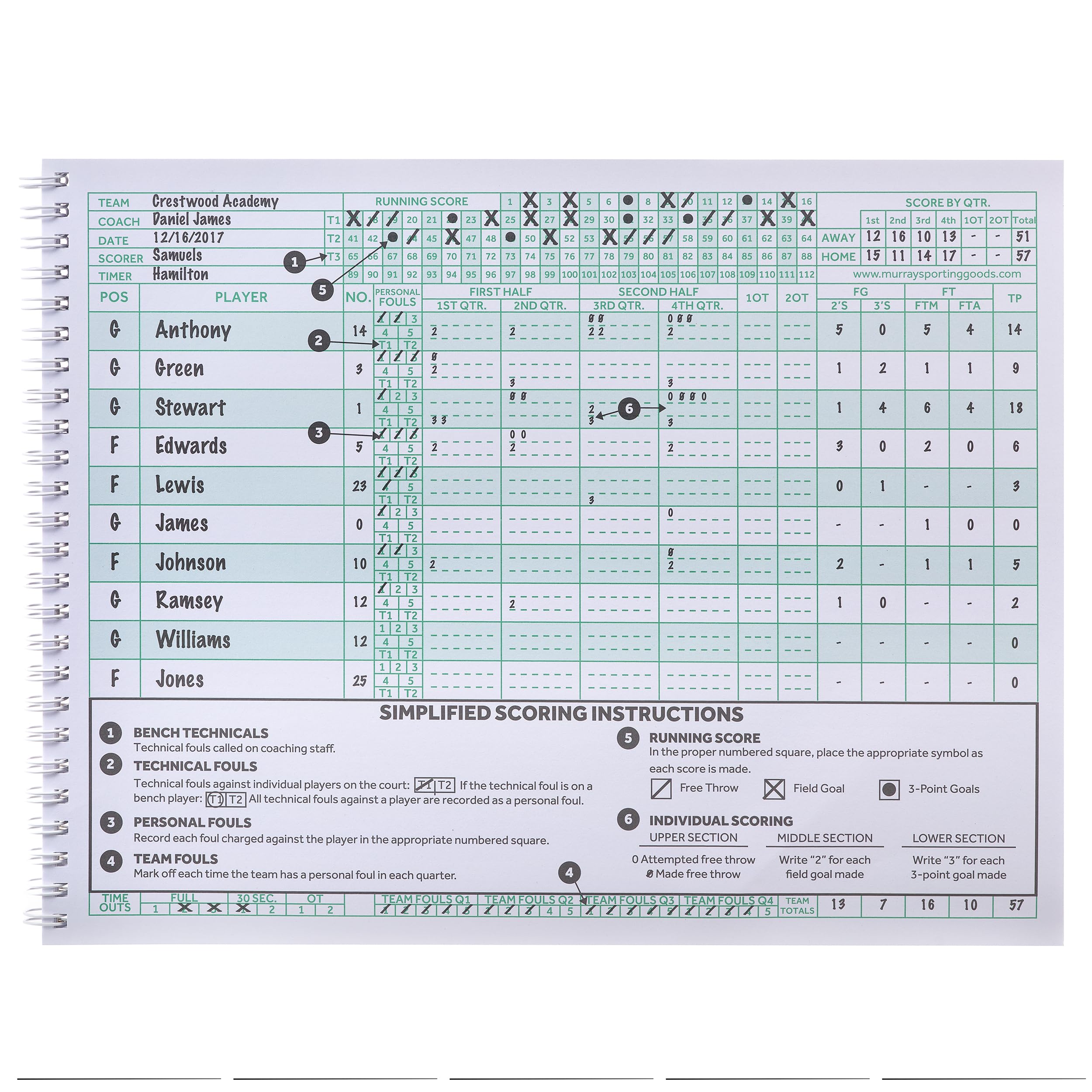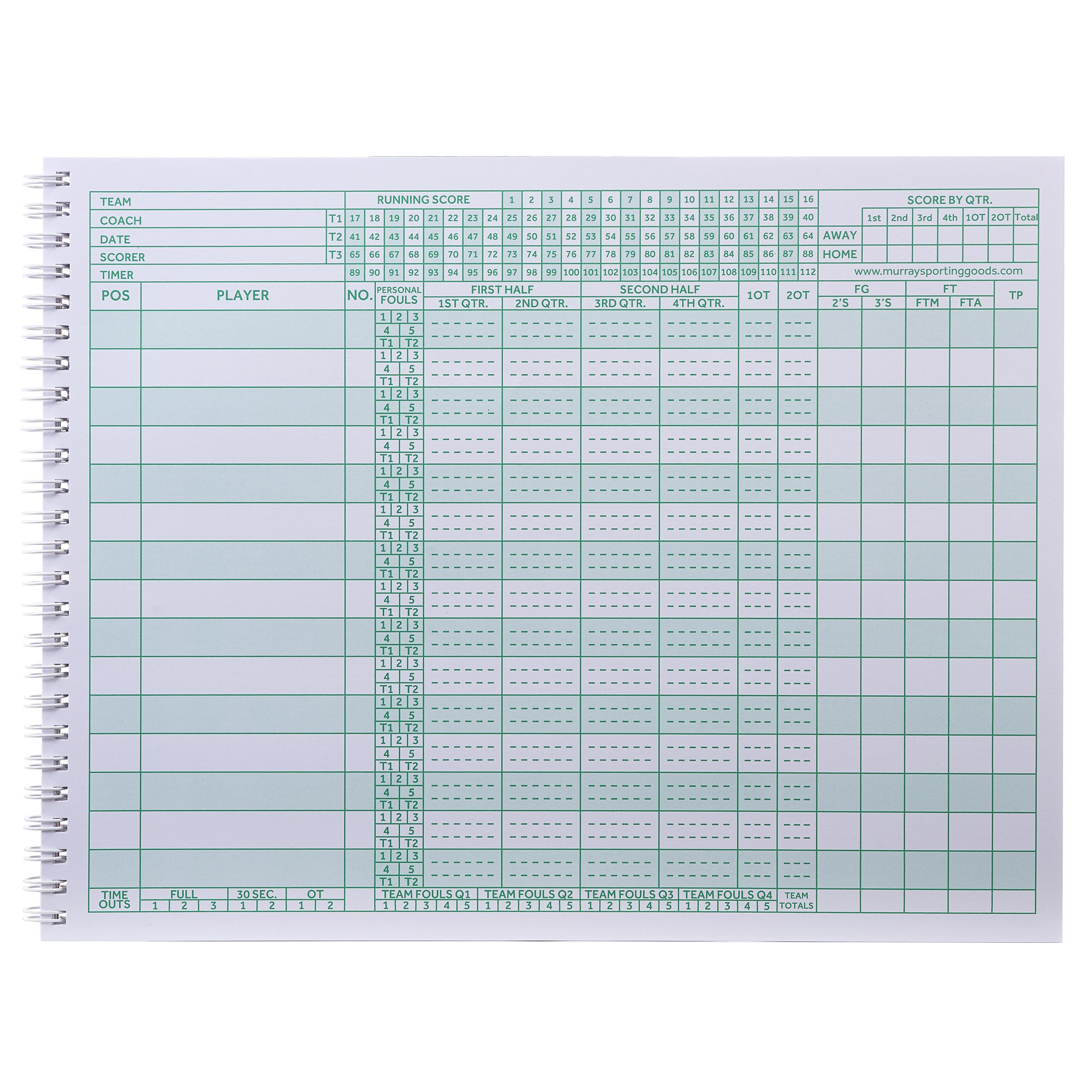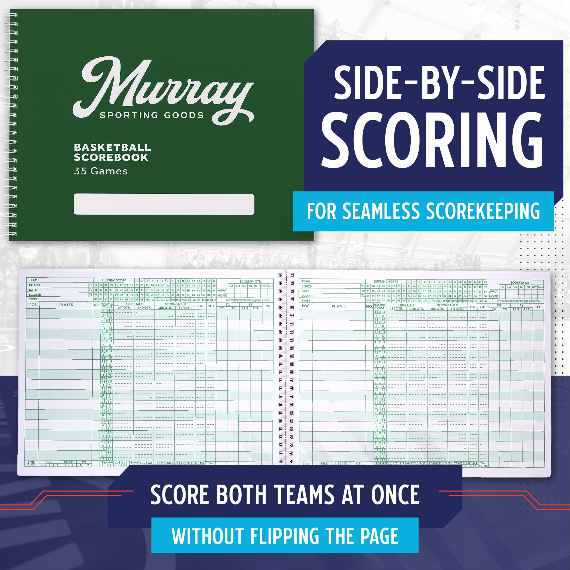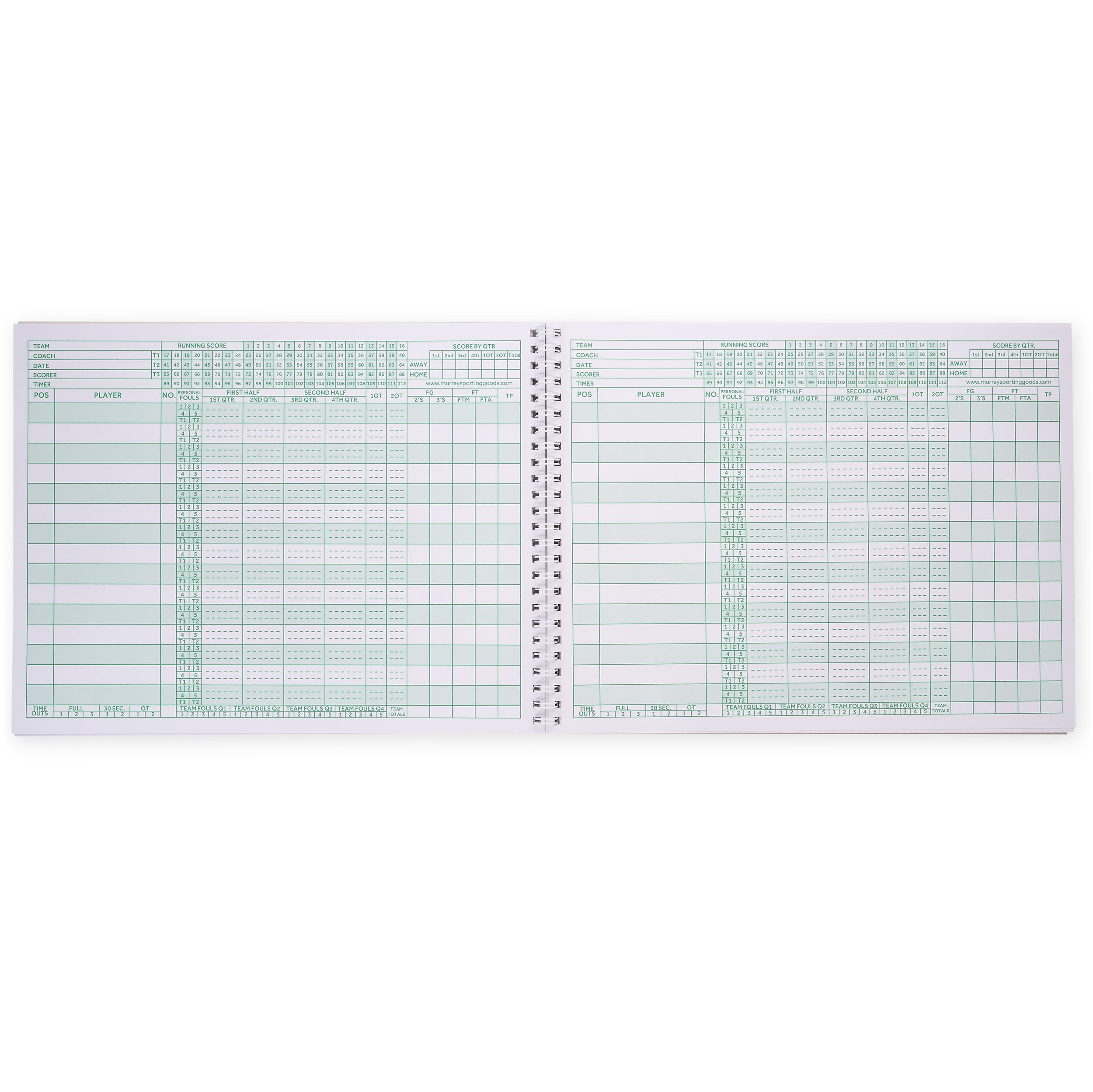 Spiral Bound Side-by-Side Green Scorekeeping Book: log score and stats for both home and away teams without having to flip through pages. Simply close the score keeper book - one side for the home team and the other side for the away team.