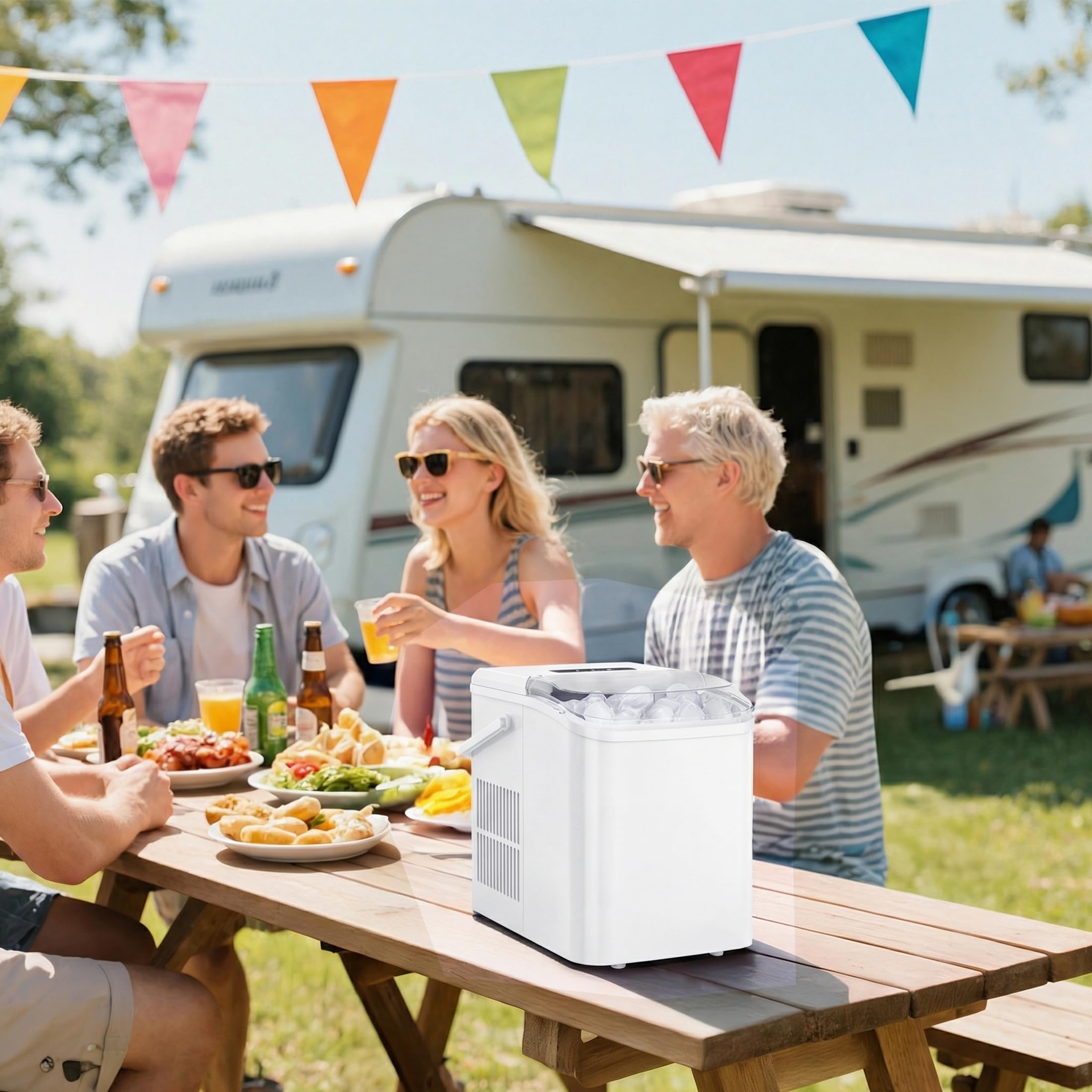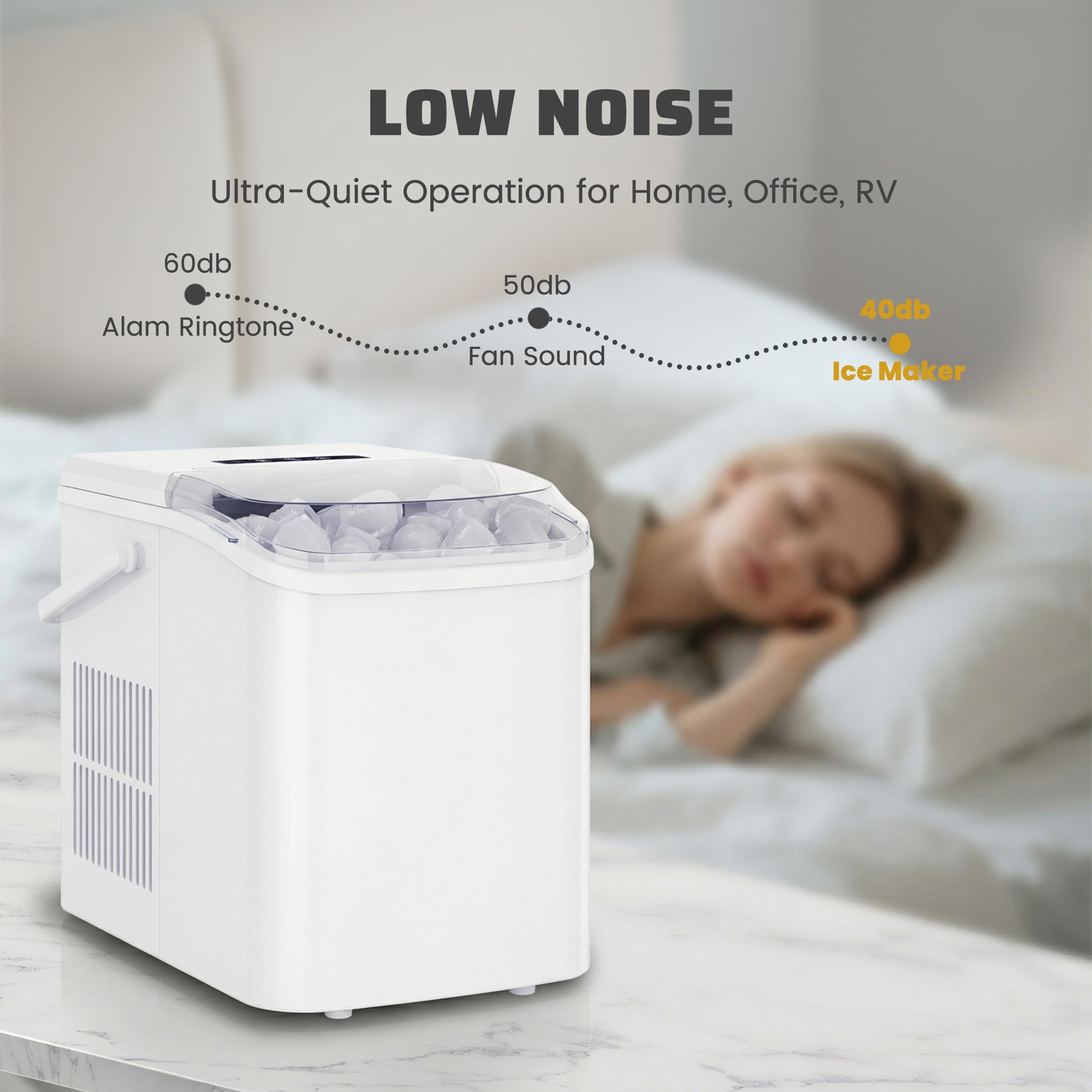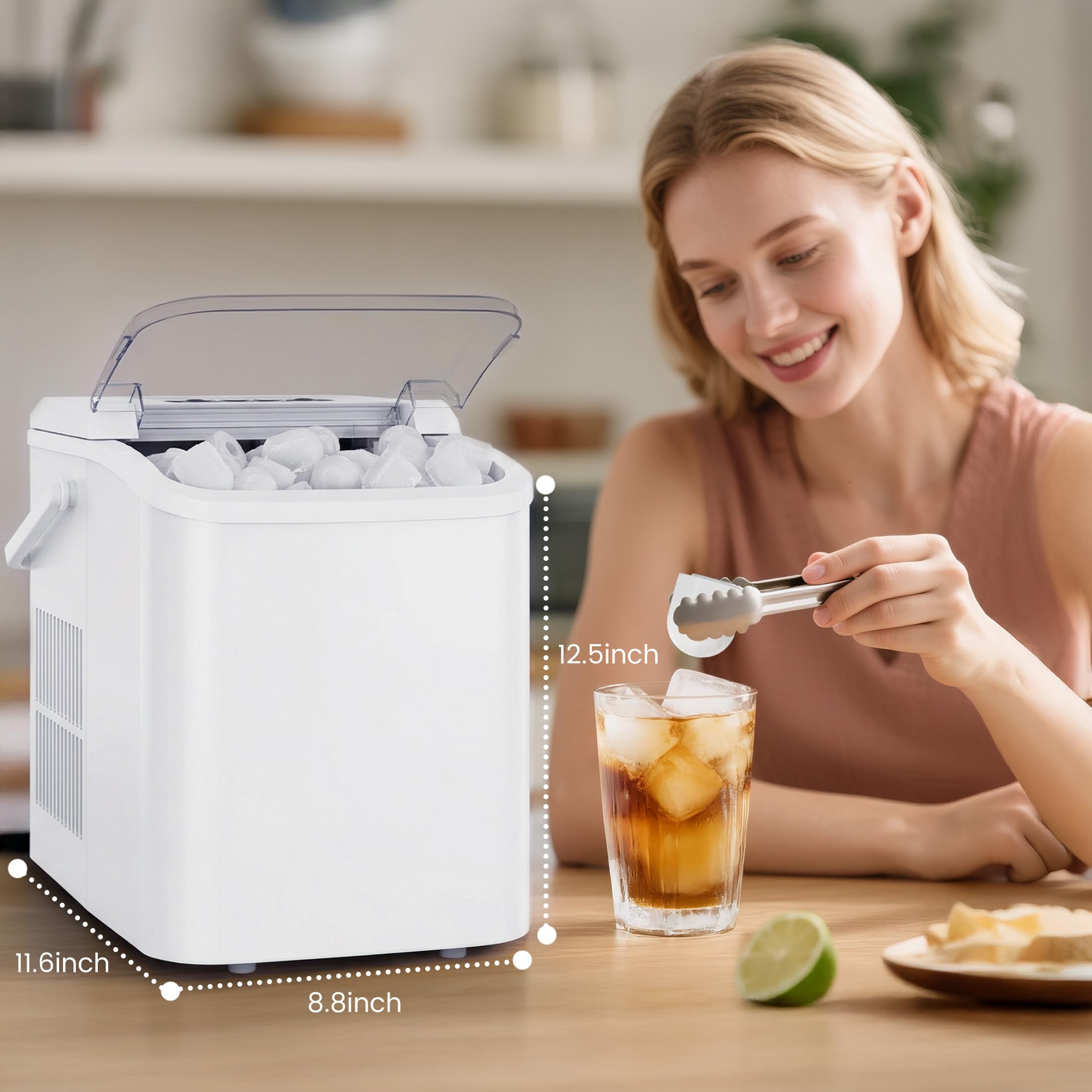 【Portable Ice Maker】 The countertop ice maker measures 8.8 x 11.6 x 12.5 inches, 15.4 pounds. and its compact size doesn't take up much space. Our small ice maker comes with a sturdy handle. Easy to carry, this mini ice machine maker countertop can be placed in your kitchen, patio, office or RV.Plus, these bullet ice won't stick together easily or hurt your hands or mouth, making them perfect for cold drinks, iced coffee or chewy snacks!