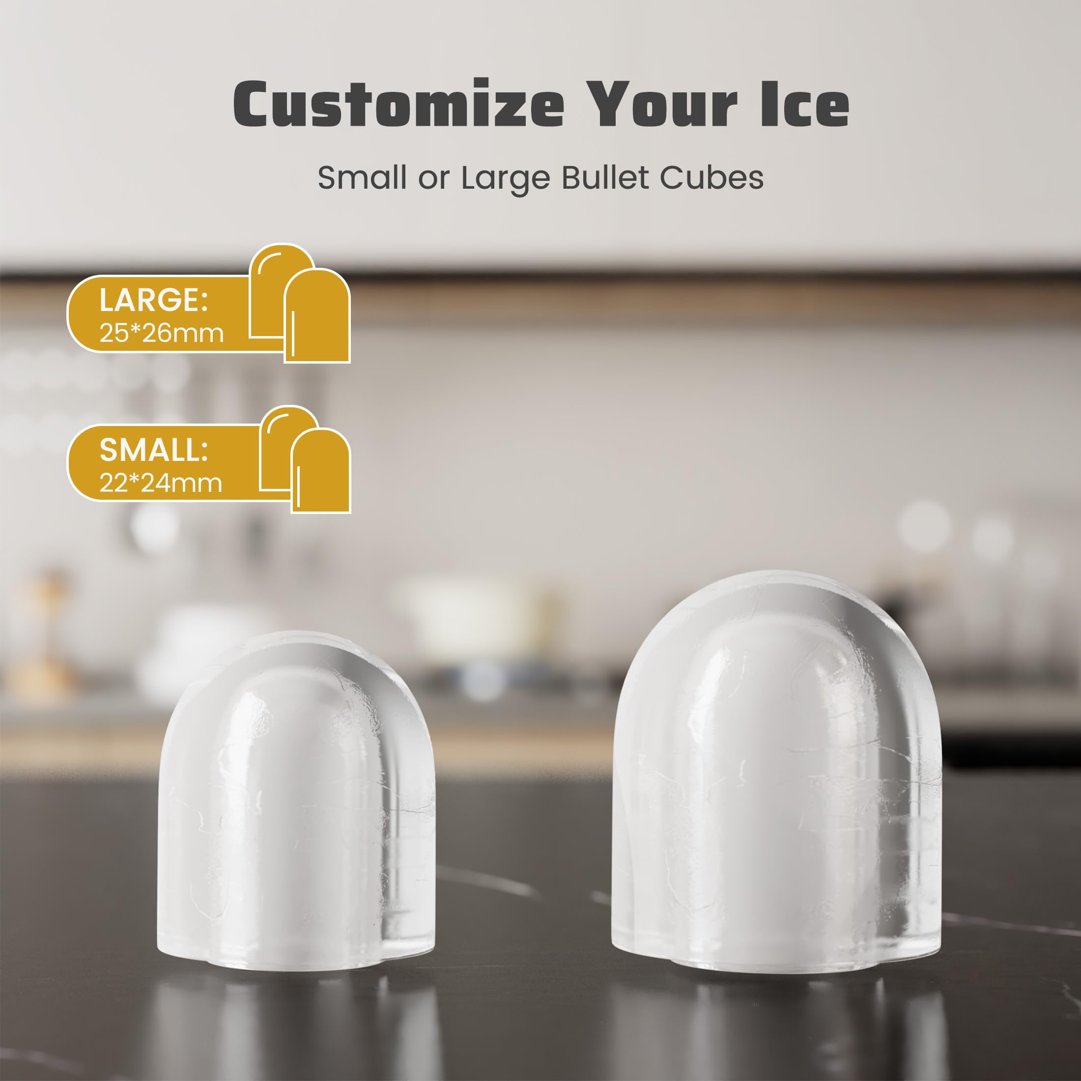【Two Sizes of Ice Cubes】 You can make two different sizes of ice cubes with this counter top ice machine maker. Small ice cubes are great for keeping seafood or beer fresh and cool for a long time. Large cubes are better for making iced coffee or cold drinks for a quick cooling effect. Smooth bullet ice that won't hurt your hands or mouth during use.
