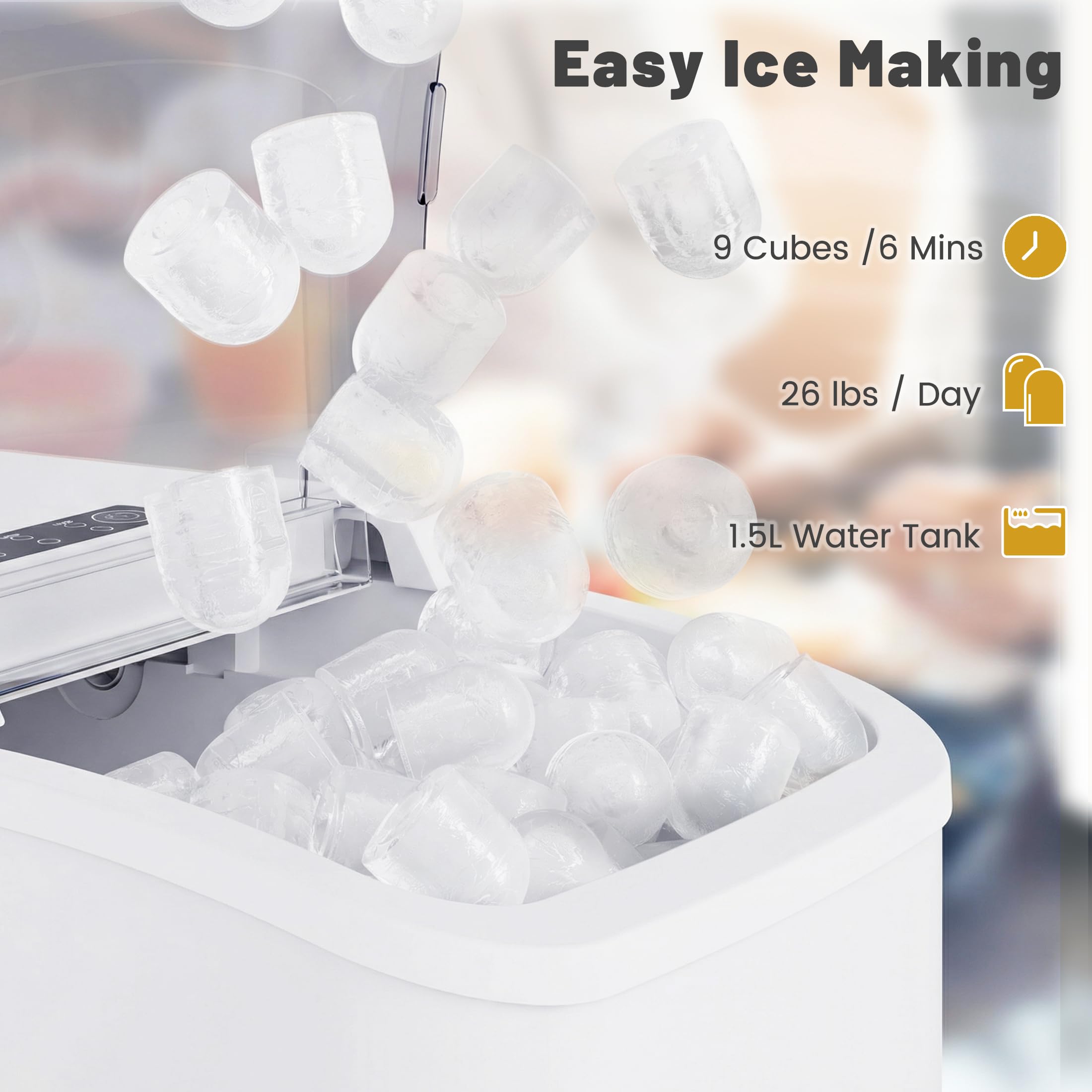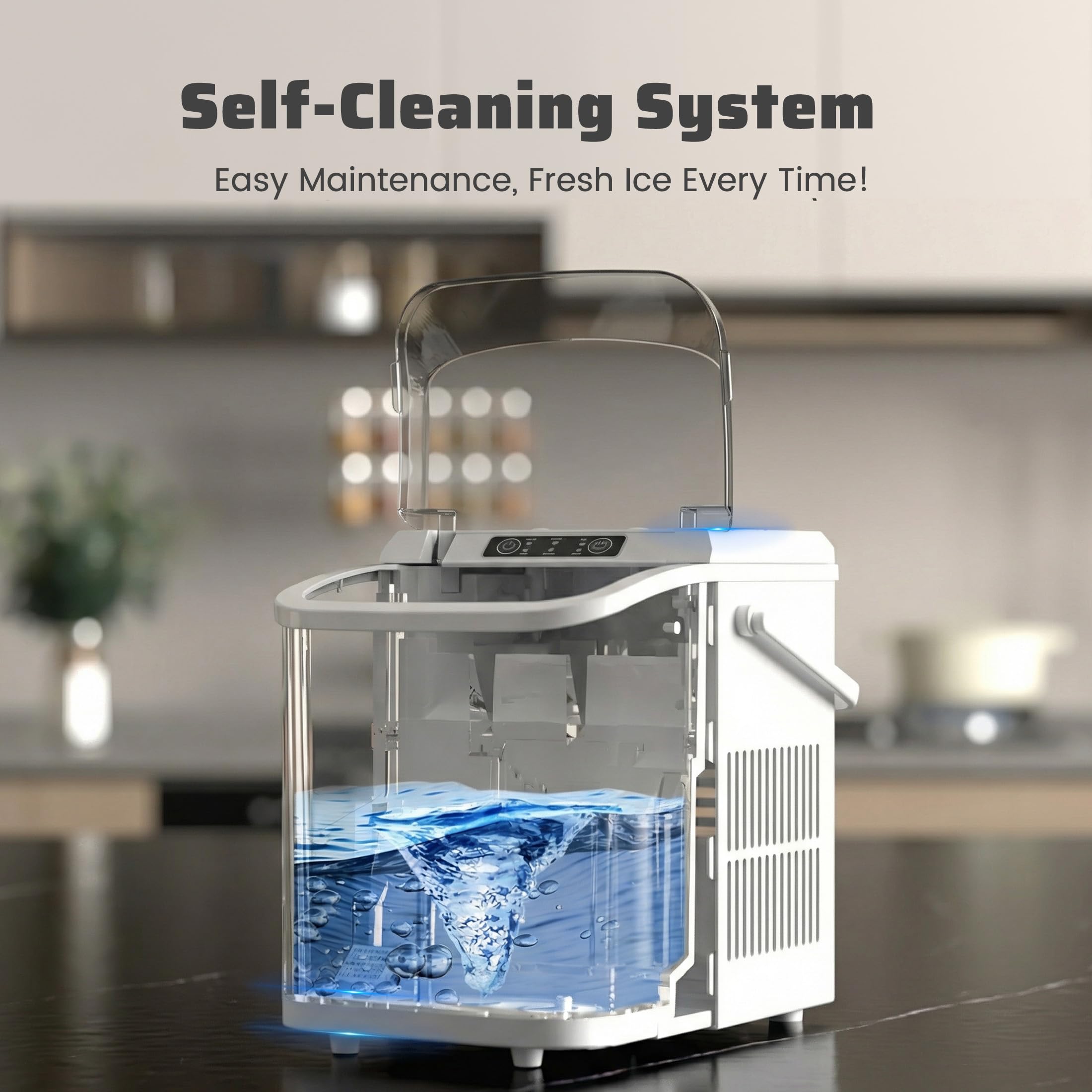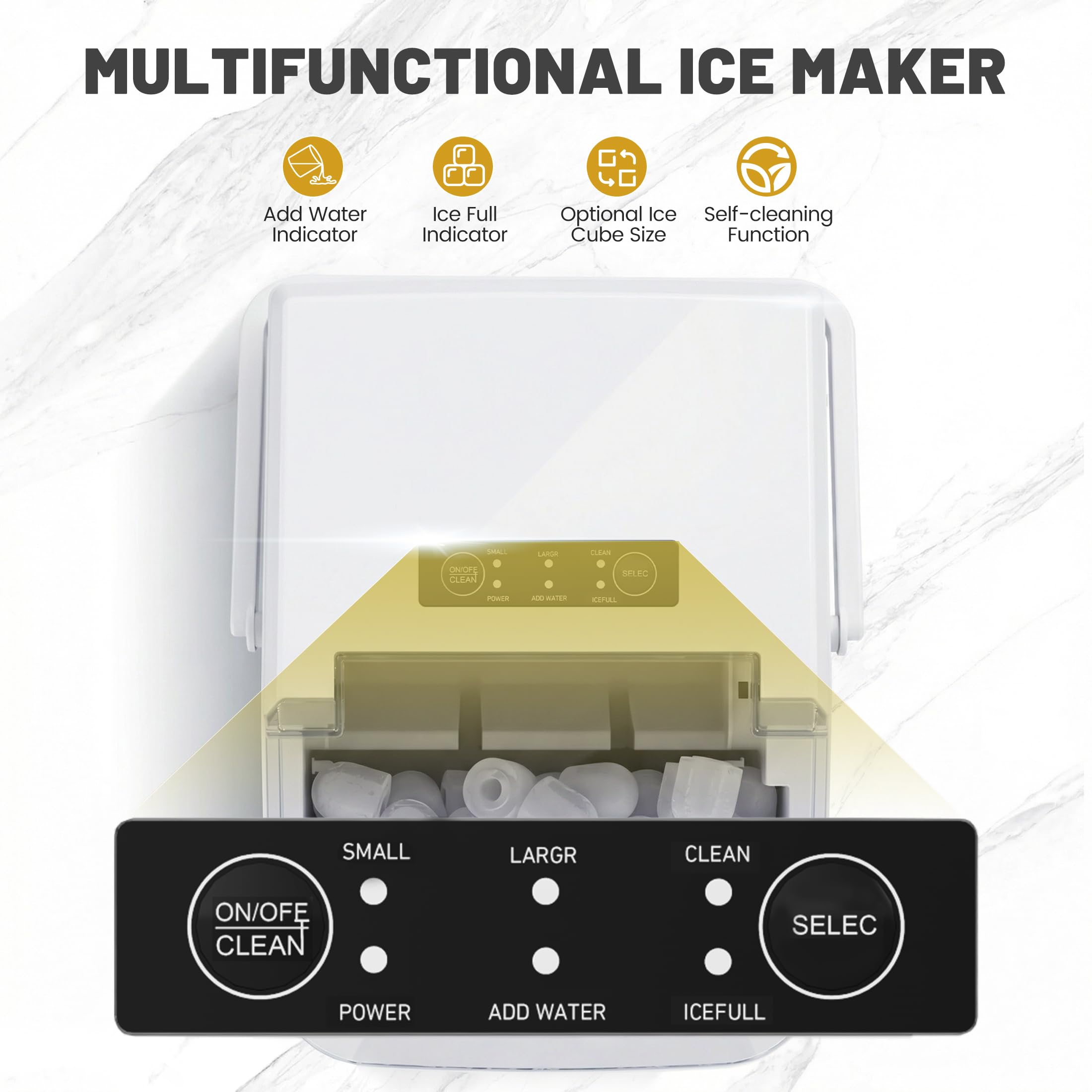 【Smart Operation & Self-Cleaning】The ice maker has an advanced infrared sensor. The "ICE FULL" indicator flashes to remind you to take out ice to prevent overflowing when the basket is full. And it'll remind you to add water by flashing "ADD WATER". Additionally, the table top ice maker machine has a one-touch auto-cleaning function. Press the “ON/OFF” for 5s after adding water to run automatic mode for 15mins. Not only are your hands-free but also you get a clean ice maker.