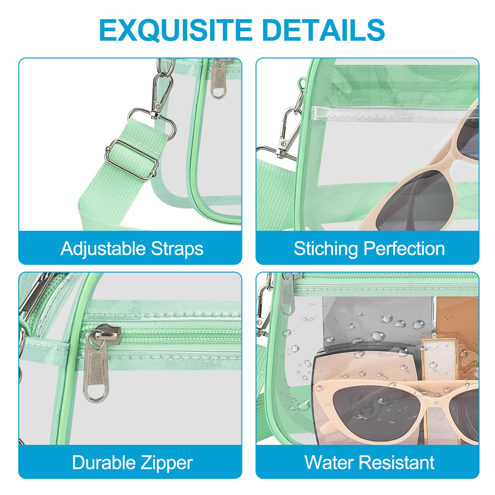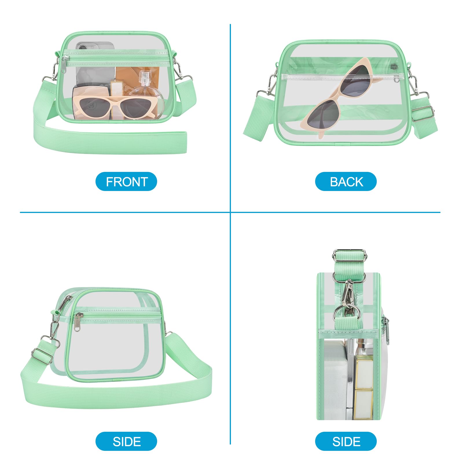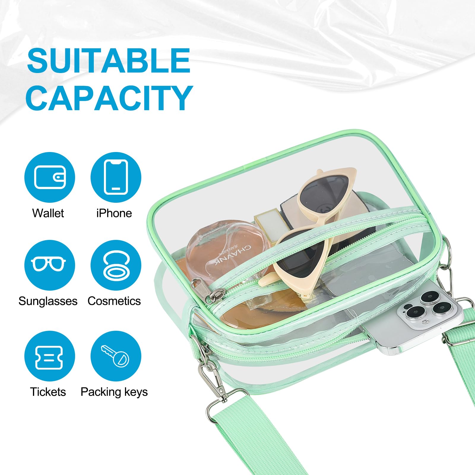 [Water-Resistant PVC Material] Made of durable 0.4mm thick PVC, this small mini clear bag is resistant to deformation and cracking. Its excellent water-resistant properties keep your belongings dry. Note: Avoid exposure to large amounts of water or heavy rain