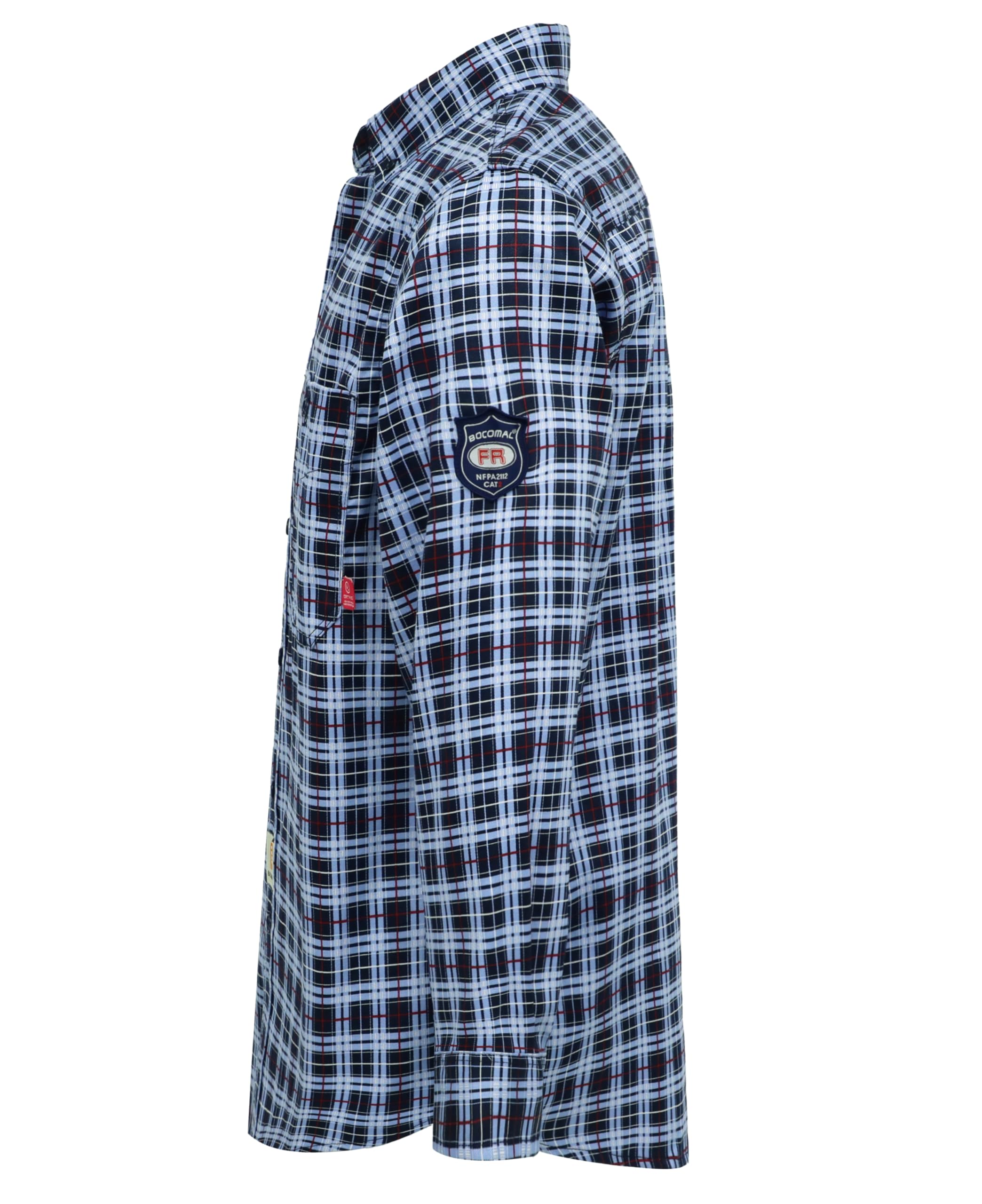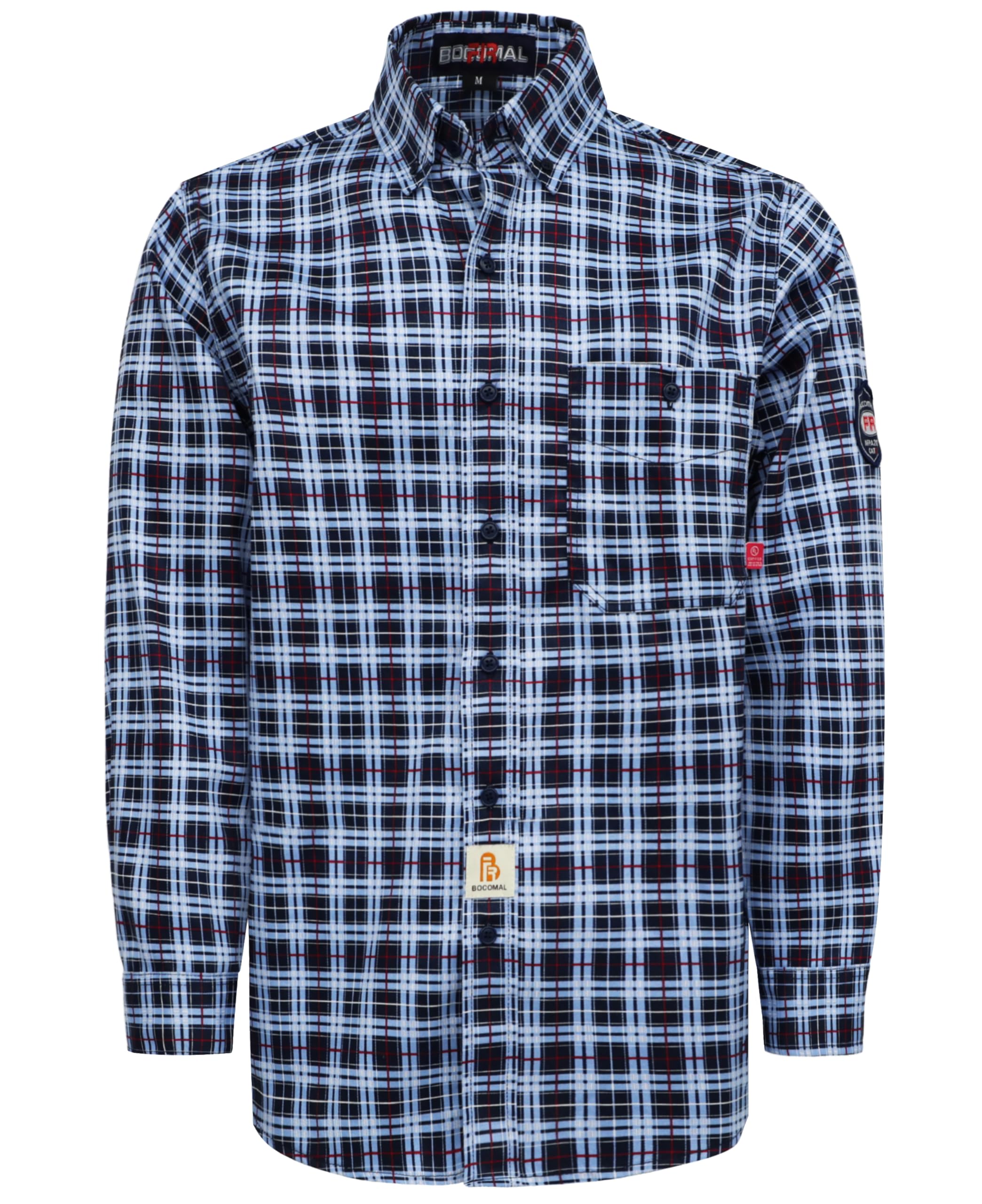 FR MATRIALS:6.5OZ Printed Plaid Cotton Twill FR Treated,FR Buttons,FR Sewing Threads!Clear FR Tag on arms and bottom front.More FR info On Tag About UL Certification.