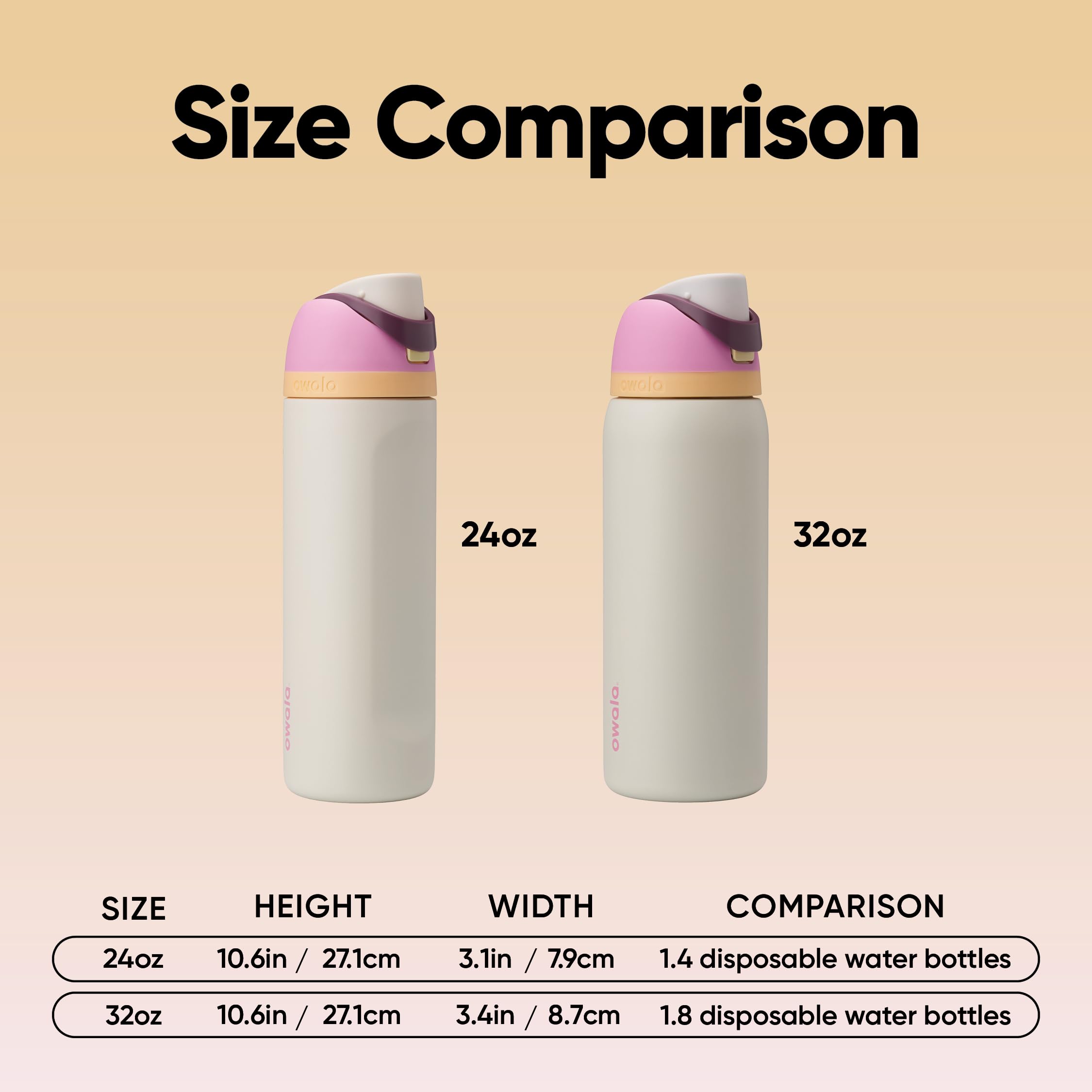 The Owala FreeSip Insulated Stainless-Steel Water Bottle with Locking Push-Button Lid easily tackles every thirst. With a built-in, easy-clean straw and a wide-mouth opening, the FreeSip reusable bottle is designed for drinking two different ways: sipping upright through the straw or tilting back to swig from the wide-mouth spout opening. Add in a push-to-open lid and playful colors, and staying hydrated has never been simpler—or more fun. Additional features include double-wall insulated stainless steel that keeps drinks cold up to 24 hours, a carry loop that doubles as a lock, a cup holder-friendly base, and a wide opening for easy cleaning and adding ice. The Owala FreeSip Insulated Stainless-Steel Water Bottle with Locking Push-Button Lid is available in three sizes: 24-Ounce, 32-Ounce, and 40-Ounce. Lid is dishwasher safe; hand wash cup. Not for use with hot liquids. Manufacturer’s limited lifetime warranty.