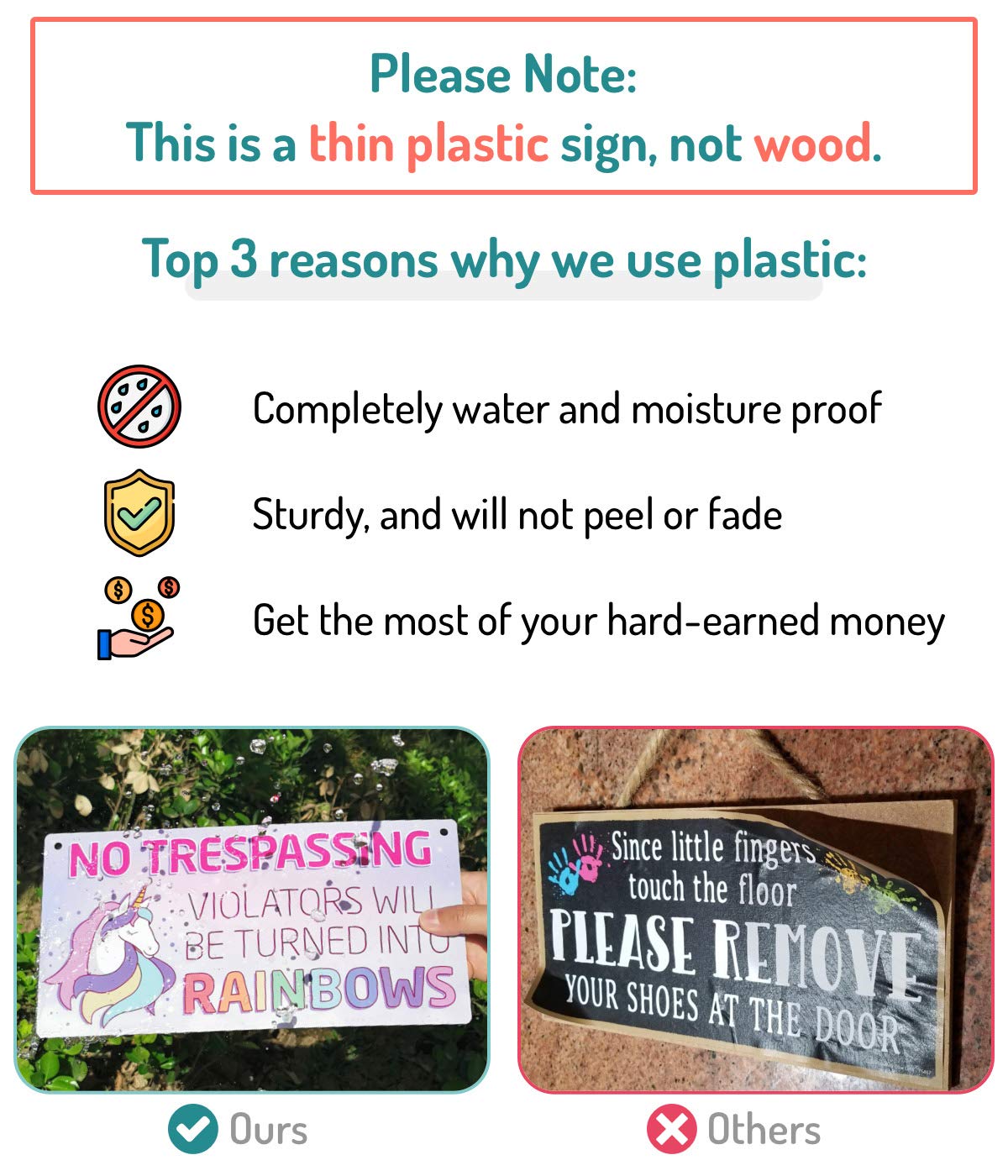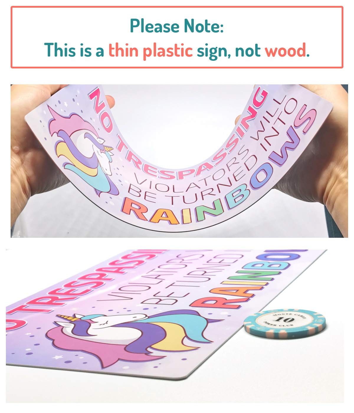【WHAT YOU’LL GET 】Please note, this is a thin plastic sign, not wood. 1 piece of plastic unicorn decor sign. High-quality PVC waterproof printing. Dimension: 12x6 inches. 0.04 inches thick, slightly thicker than a standard credit card.
