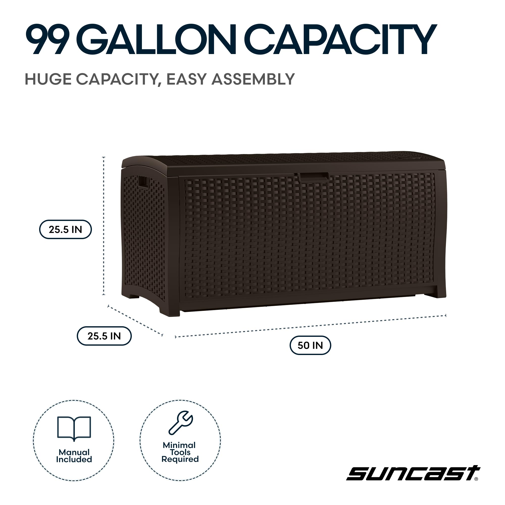The wicker plastic storage container from Suncast is an attractive and highly versatile solution for use throughout your home and yard. The chest design and hinged lid allow for easy access to your tools and accessories. With a holding capacity of 99 gallons (50" x 25.5"x 25.5"), the deck box is compact and space-efficient, easily tucked away in your laundry room or garage. Use it on your deck to stow away patio cushions, gardening tools and grill accessories, or in your house to store boots, gloves, hats, and more. The weatherproof body will resist fading, while the rain water flows off of the box without pooling to keep your belongings dry and mildew-free. Constructed with durable and waterproof resin that is built to last a lifetime.