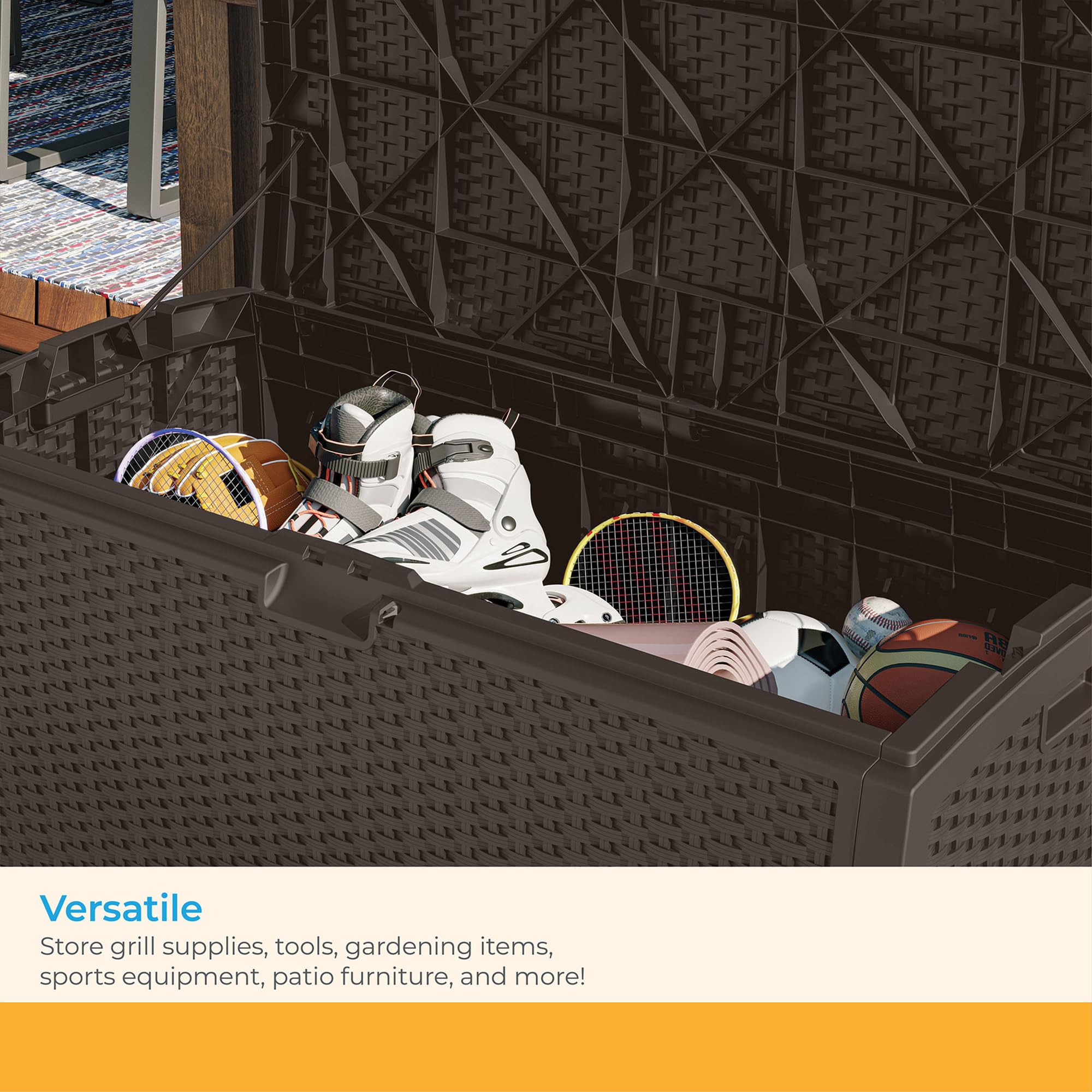 Deck Storage Box: Beautiful wicker resin outdoor box has a wide and spacious 99-gallon capacity for patio, deck, yard, porch, garage, and shed storage