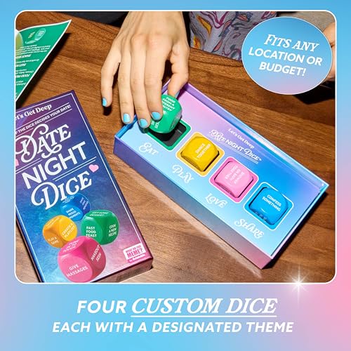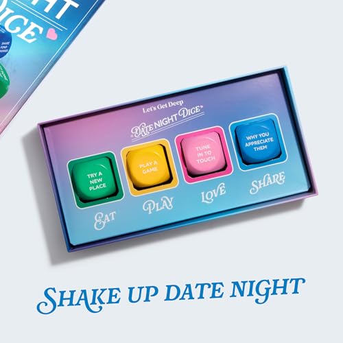 Let’s Get Deep® Date Night Dice by Relatable transforms date night planning into an exciting, spontaneous adventure for couples at any stage of their relationship. With themes like Eat, Play, Love, and Share, each roll of the dice guides partners to create fulfilling experiences that help build emotionally healthy relationships. Whether you choose to use only a few dice at a time or combine them all, Date Night Dice ensures every evening is a journey of discovery and meaningful connection. Inside you’ll find 4 custom dice, each with its own activity theme aimed at nurturing love and connection. Roll all 4 dice to create an original, well-rounded date night or just use a few to help get the ideas flowing. Our date night suggestions are designed to be accessible to everyone and work for both new and long-term couples alike. Roll the dice to find exciting couples stuff you can create together. The Eat die delivers nighttime dining inspiration, while the Play die offers suggestions for fun activities to share. The Love die helps heat things up in the romance department and the Share theme prompts deeper conversations to strengthen your bond. So whether you’re starting the dance party or playing a game, having a major makeout session, trying a new recipe, or sharing your fondest memories, you’re in for a night like no other. These fun Dice create an easy way to plan memorable dates that bring more variety and excitement to your relationship. By encouraging meaningful connections and shared experiences, Date Night Dice helps couples break out of the routine and explore new ways to bond. And if you’re looking for date night gifts for couples, Date Night Dice also makes for an excellent engagement gift, bridal shower gift, wedding gift, or anniversary gift for your favorite duo. It's a great way to add fun and romance to your life. Surprise your loved one with this dating dice for a special occasion, like Valentine's Day, or use it to make any date night feel like a celebration.