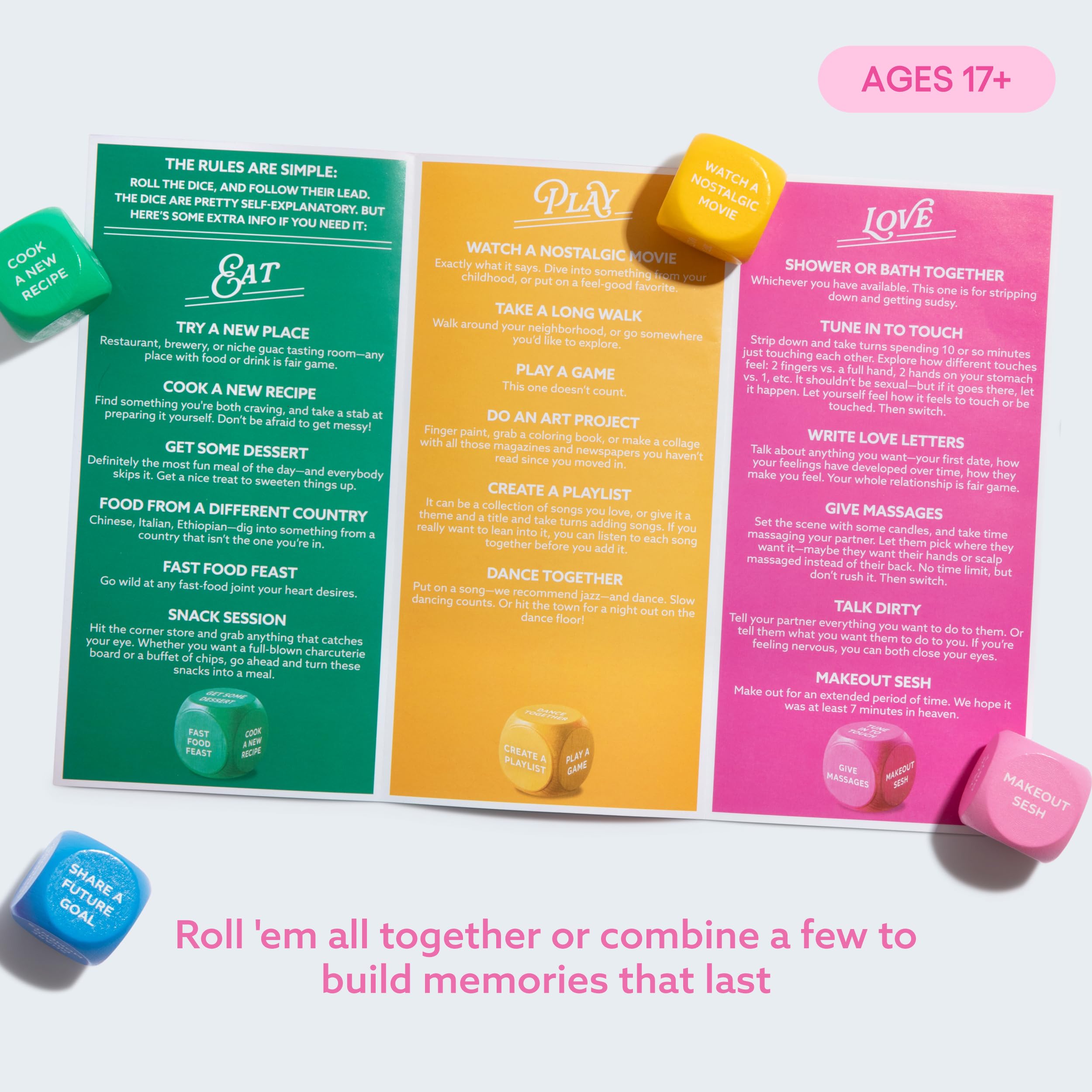 One Romantic Date: The EAT die gives dining inspo. The PLAY die provides a playful activity. A roll of the LOVE die delivers romantic gestures and SHARE suggests thoughtful conversation starters.