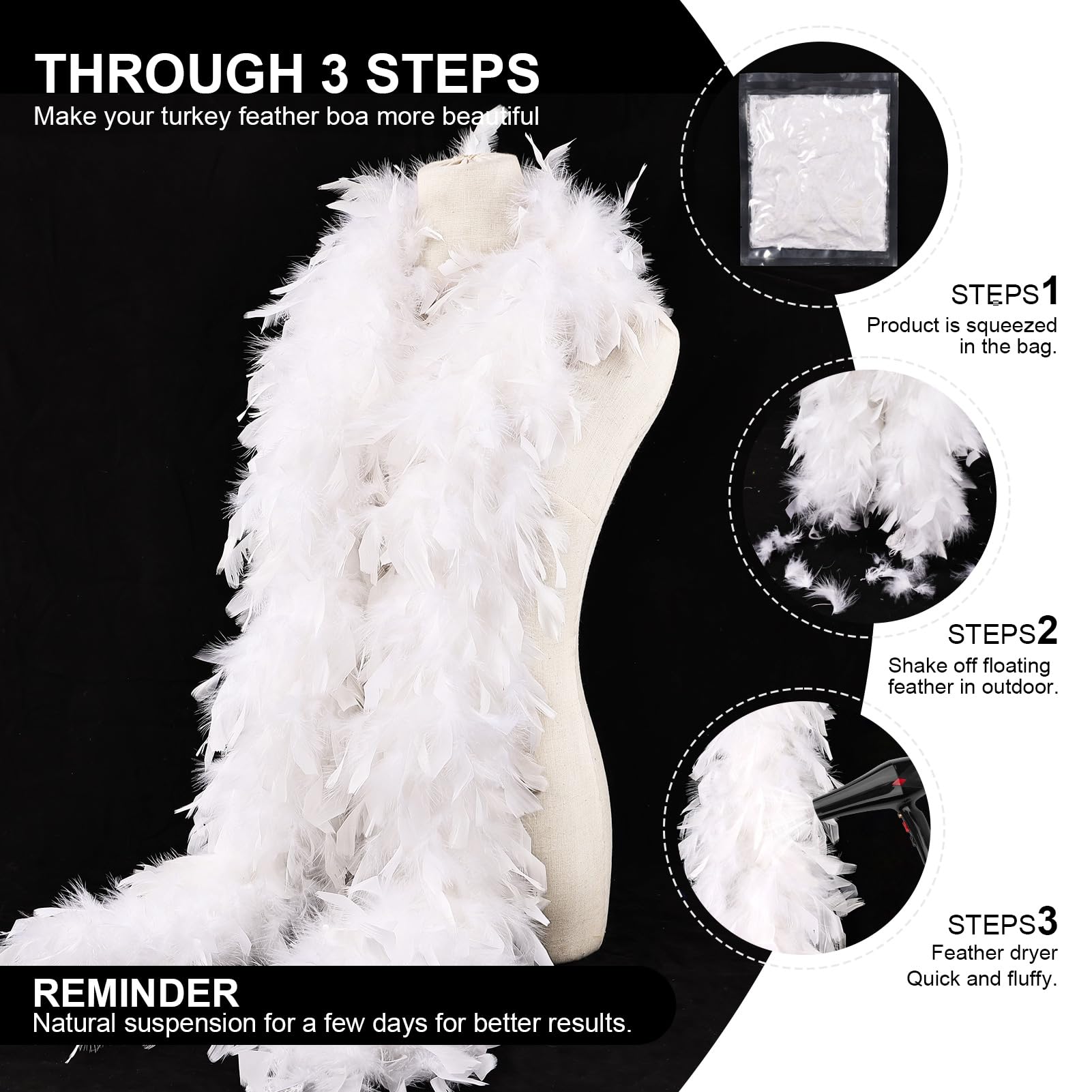 ❤️Precautions before use:Since our feathers are all natural and handcrafted,After you receive the boas, take them out of the package and shake them outdoor first, in order to get rid of debris and fallen feathers.Then hang it up for few hours before wearing. If you can hang up blowed few days, it will looks as the picture full and big.Of course,the longer you hang them up, the turkey feather boa will be more fluffy and the effect will be more stunning.