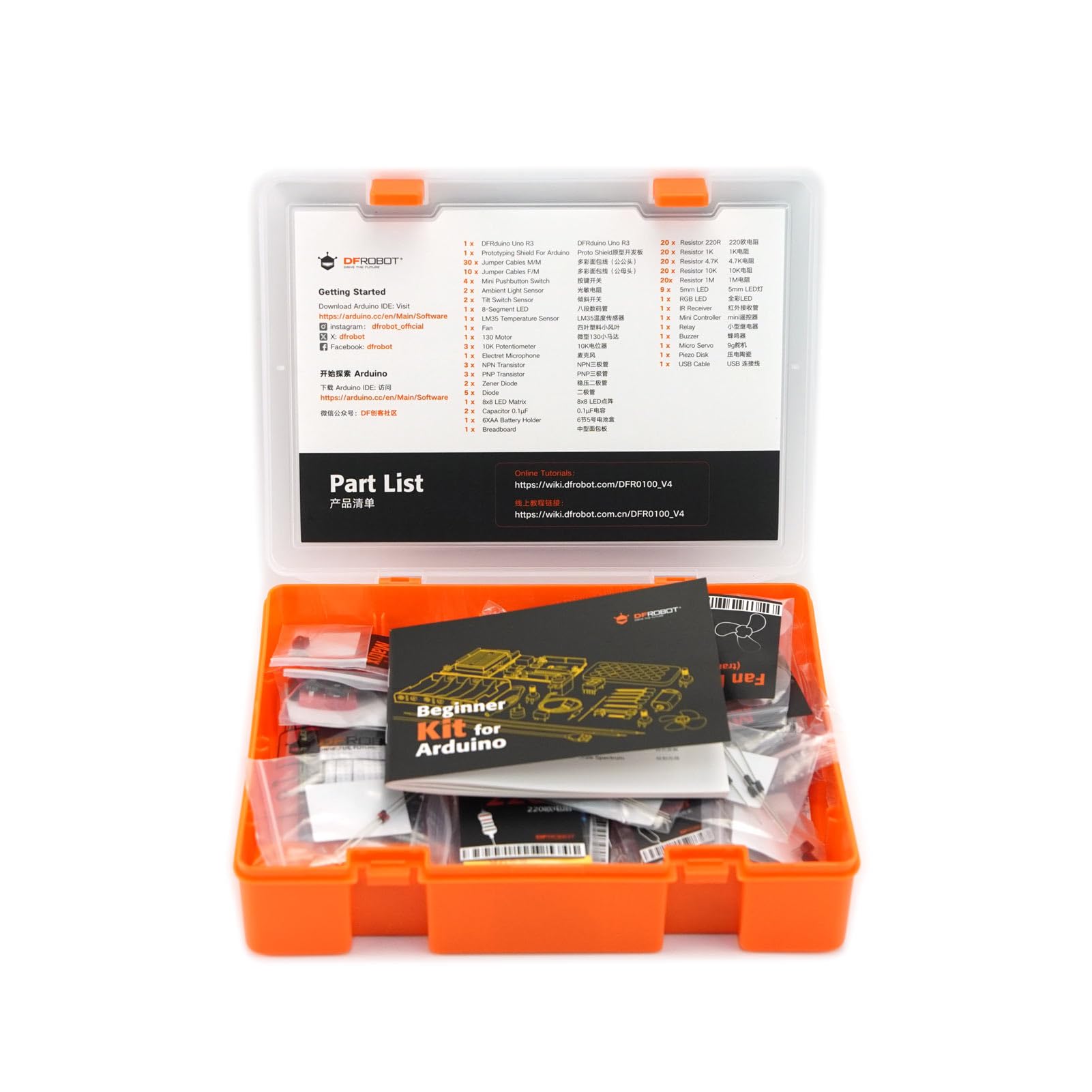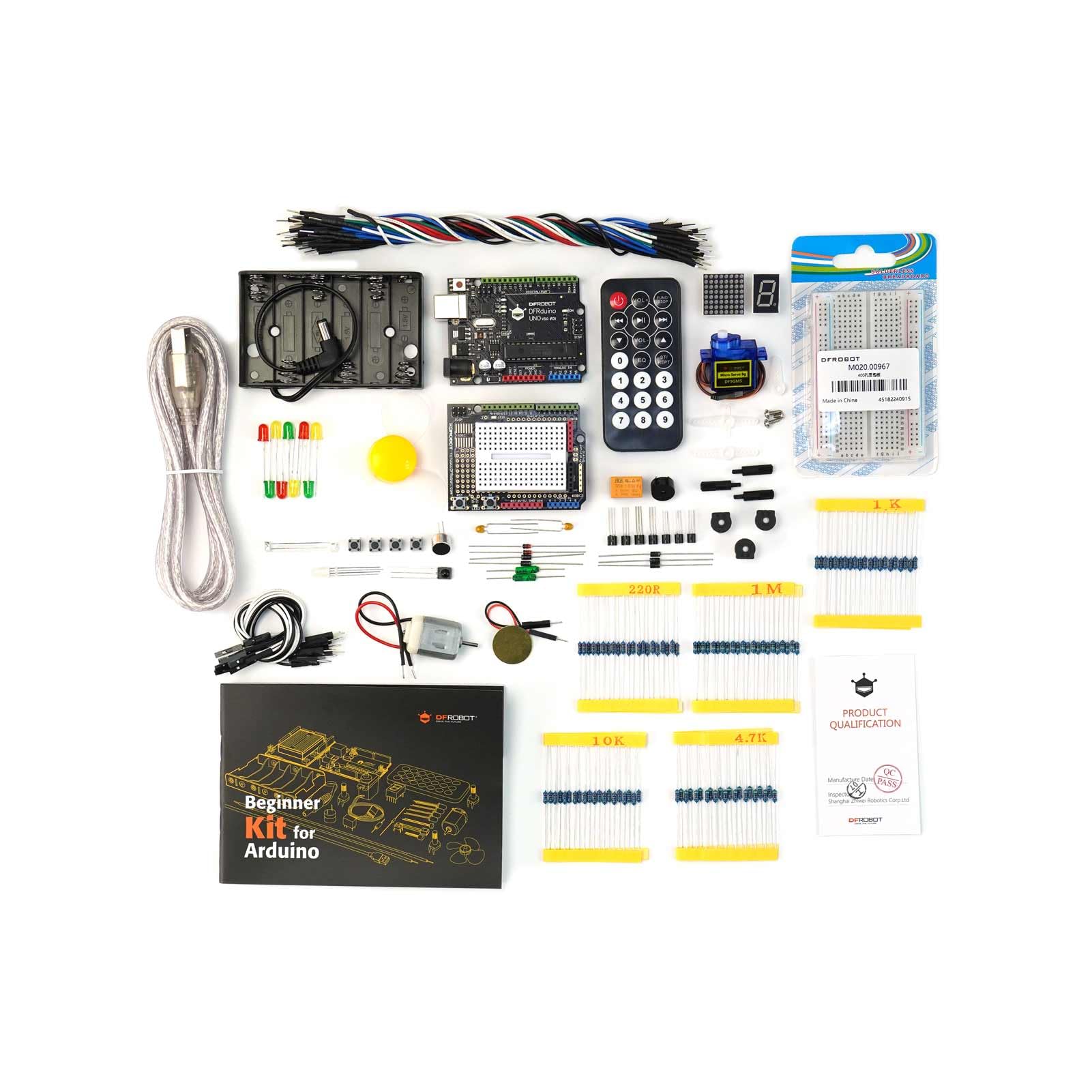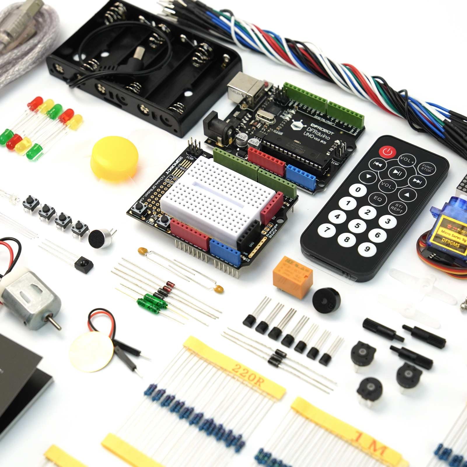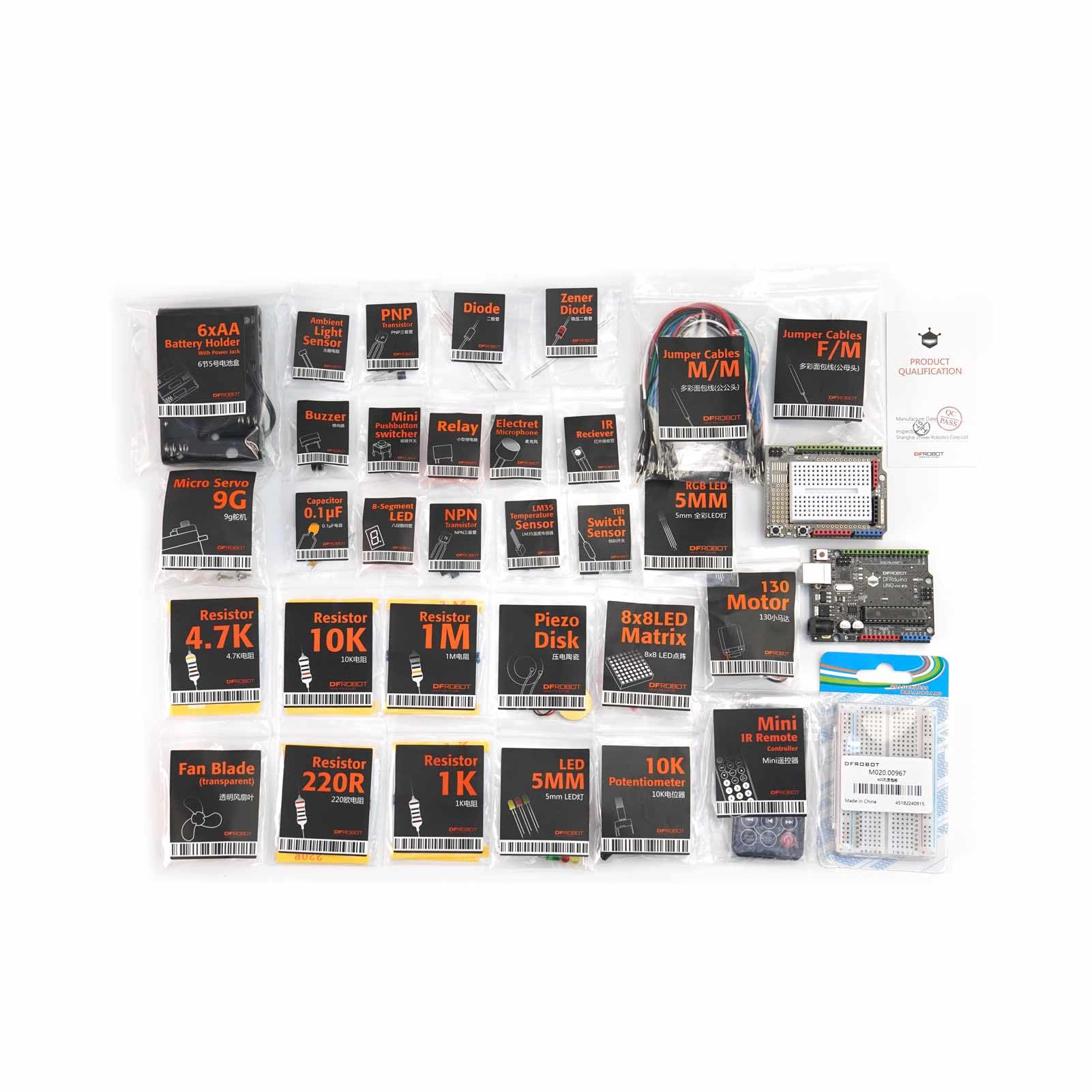 Comes with all components required, including DFRduino R3 control board with USB Cable, Resistors, LED, Motor, Servo, Relay, Fan ,Jumper Cables, sensors, Buzzer and Potentiometer.