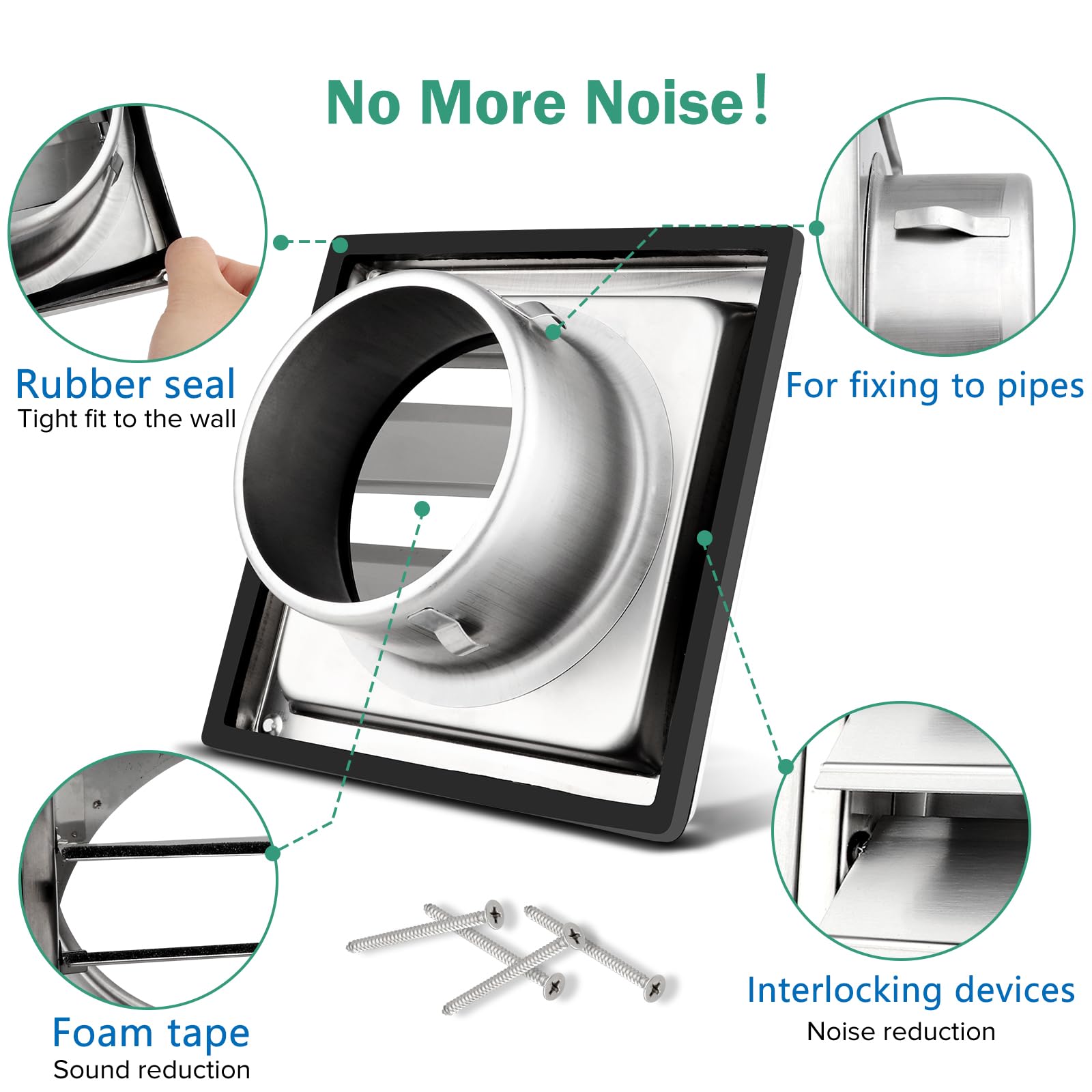 ✅[Upgrade Design]No screen, when it is used for the vent of the dryer, stainless steel dryer vent cover will not be blocked by lint. We are the only company using interlocking design and foam tape to achieve noise reduction. Outlasts the plastic type! Tip: Please measure the size before purchasing