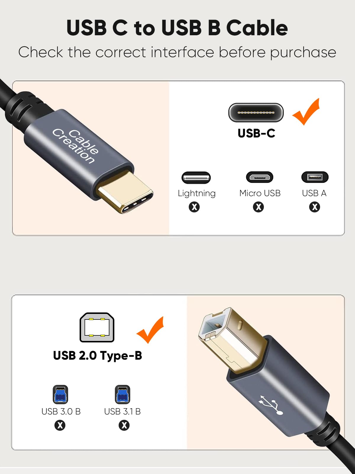 USB C to USB B Cable: Connects USB-C enabled devices (MacBook, Surface Book 2, Chromebook Pixel) to USB-B 2.0 devices and peripherals (legacy printers, hubs, and hard drives, Yamaha Casio Digital Piano MIDI Controller Electric Keyboard)