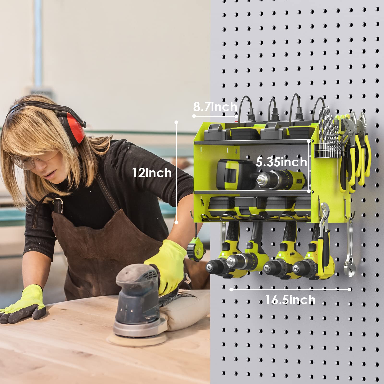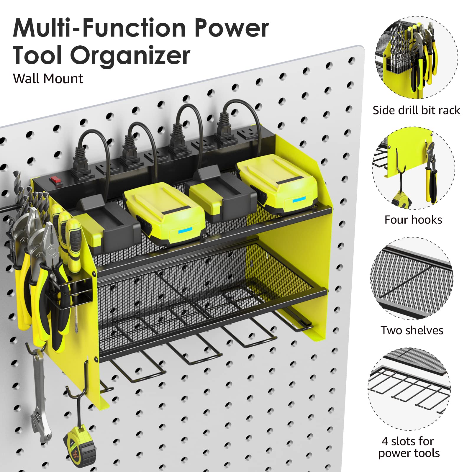Wall mount power tools organizer come with 4 slots, 4 hooks and drill bit rack, built-in power strip, double layer structure can keep rechargeable tools organized in the work area and save your bench space. The tools in the picture are for demonstration purposes only and are not included.
