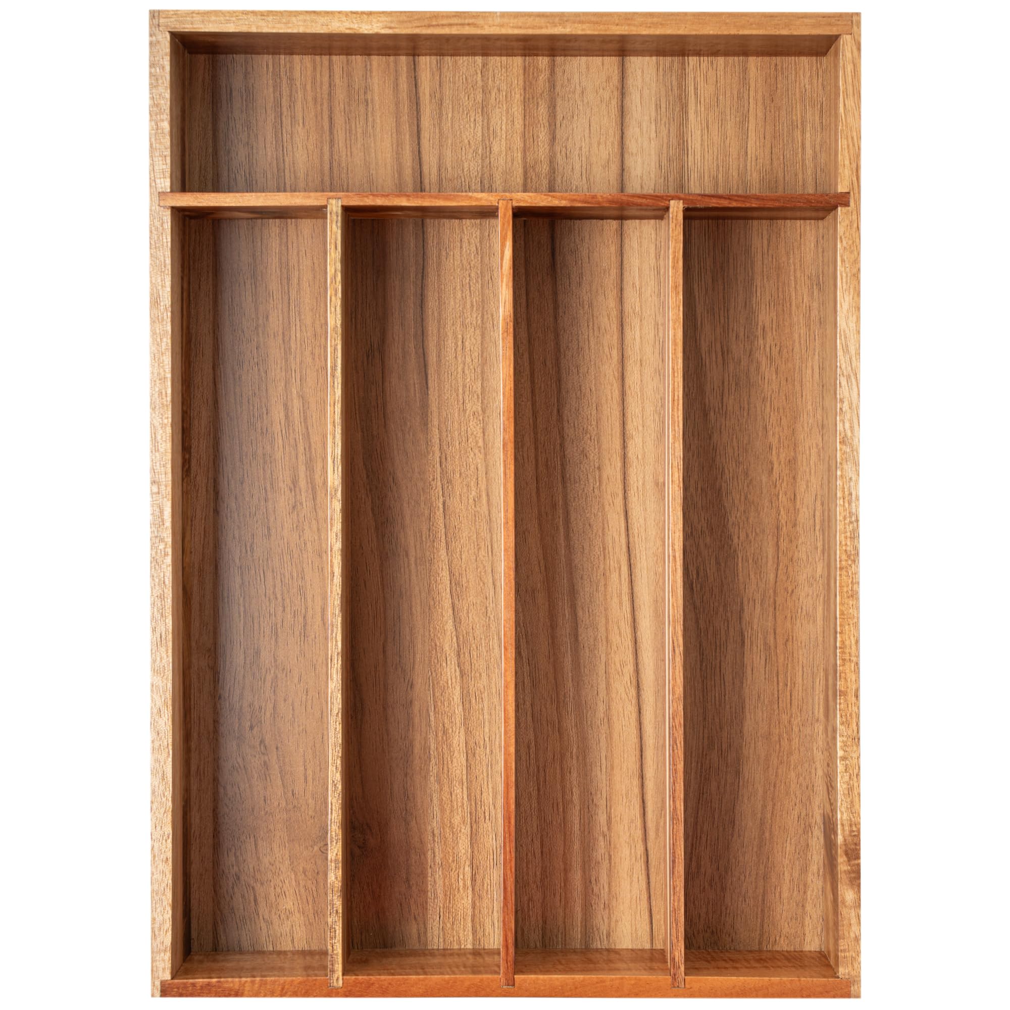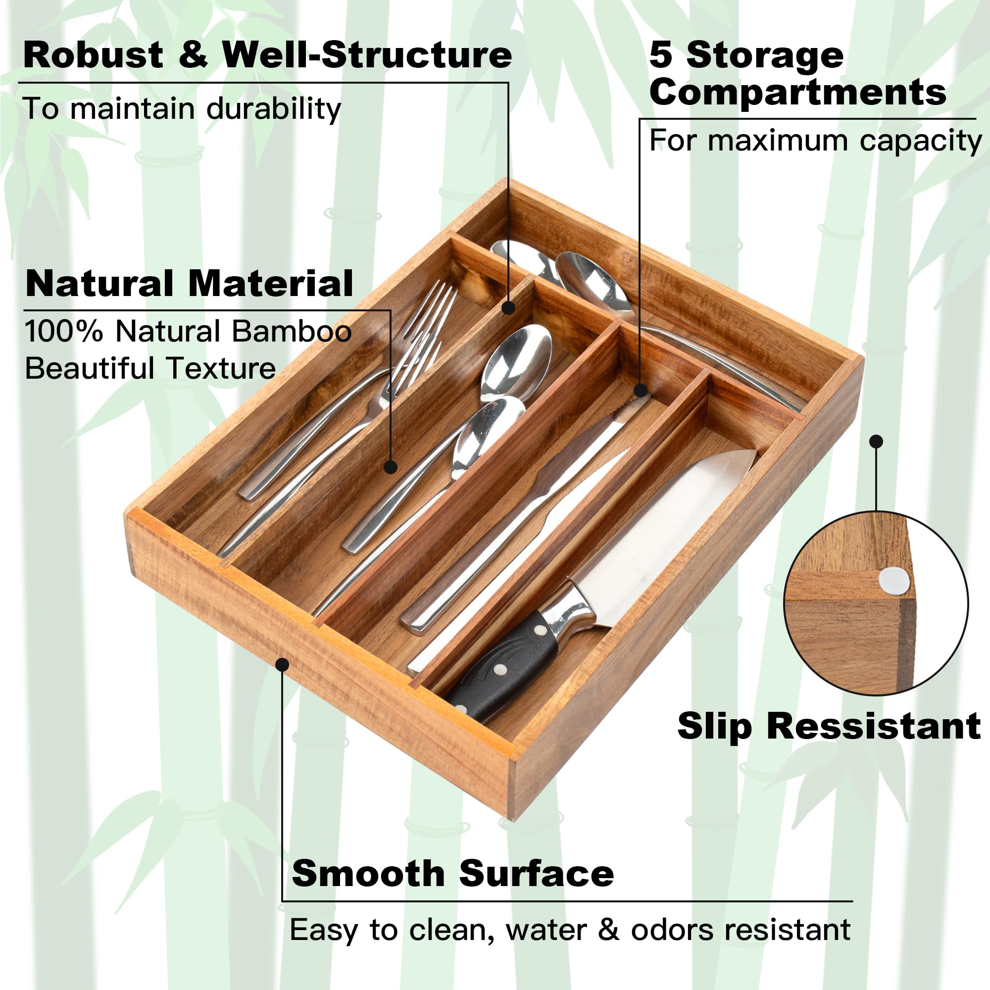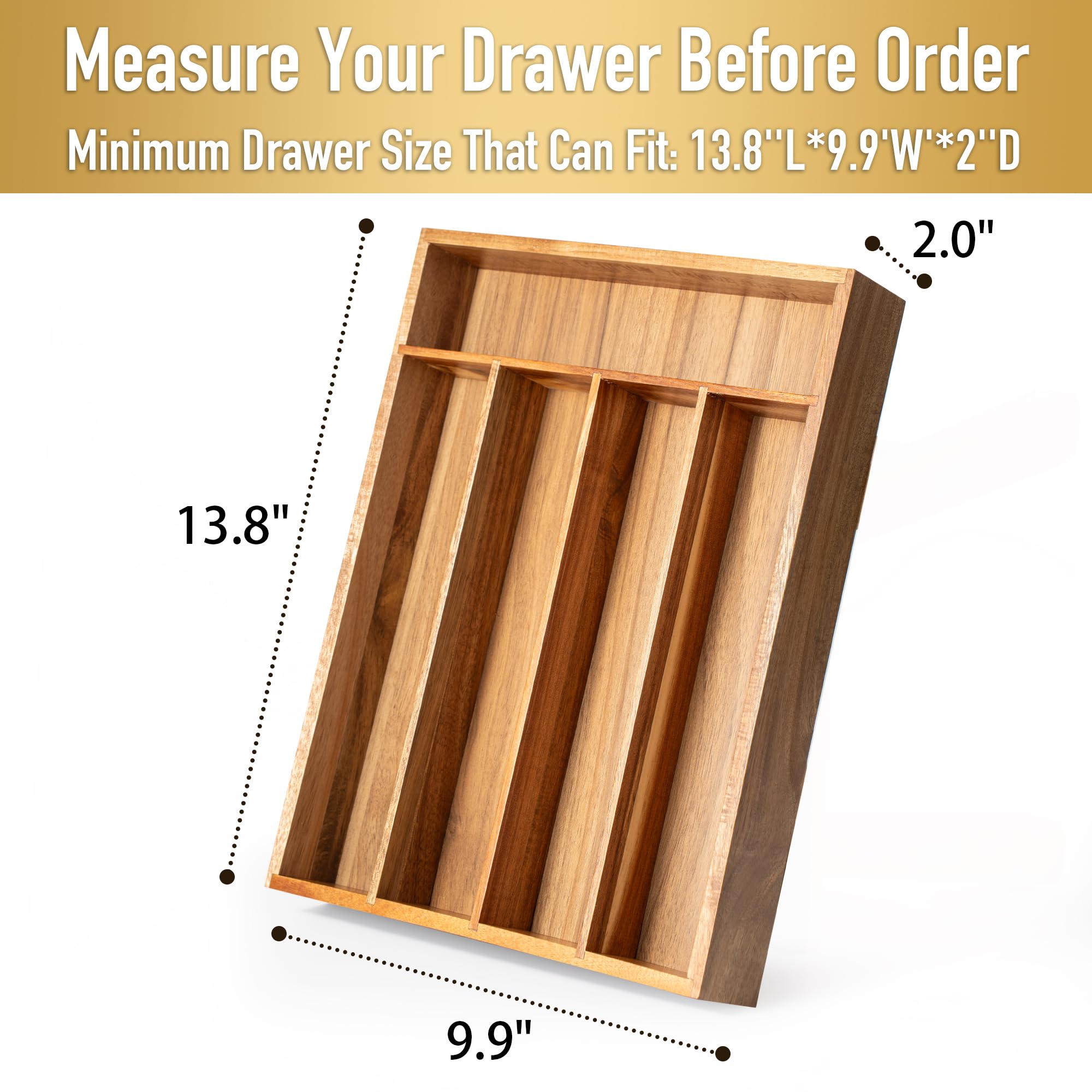 【Sturdy and Well-made】Our silverware tray for drawer is made of natural acacia wood, which makes the silverware organizer durable enough for long time use. Even the knife won't leave scratch on it. Unlike the plastic and metal drawer organizer, our silverware tray more classic and natural, the color and texture of the kitchen drawer organizer is 100% natural and even.
