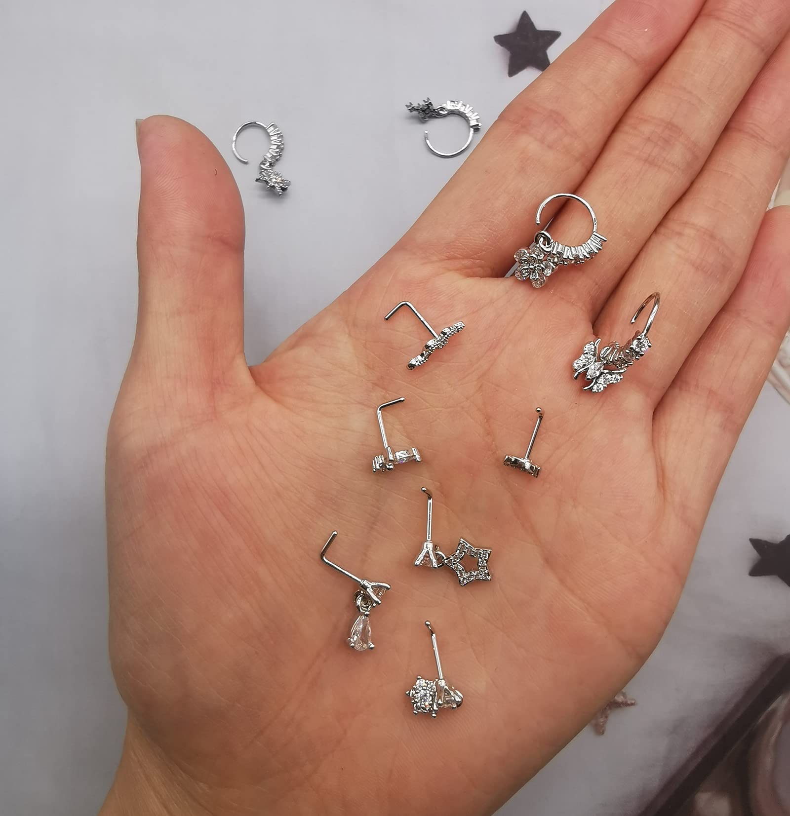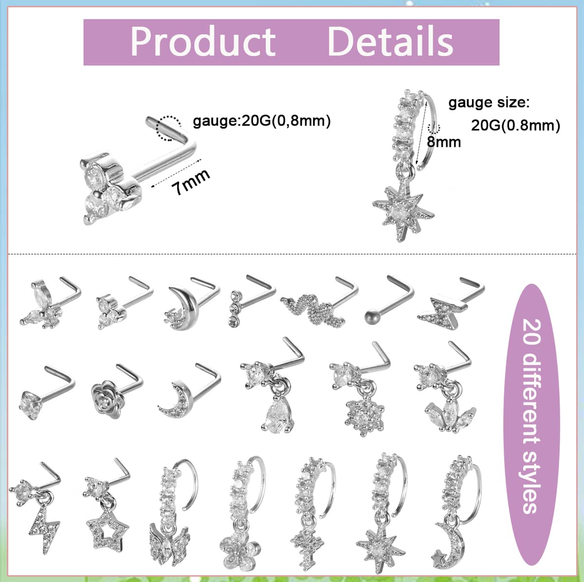 Nose Rings Piercing Set: Each order you will receive 20 different style nose rings,include: 10 pcs L shaped nose studs, 5 pcs L shaped dangle nose nails, and 5 pcs dangle nose rings; The quantity and styles are enough to meet your daily outfit matching needs; Simple basic styles with novel dangle design, never go out of style, great choice for nose piercing